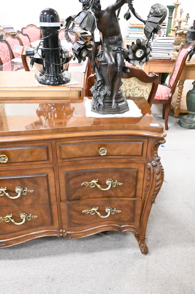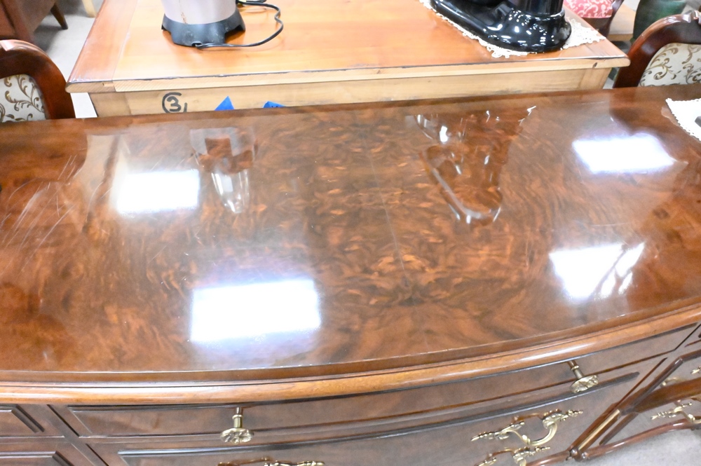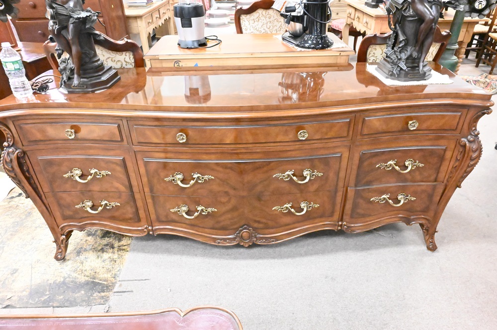Karges Burlwood and Mahogany Triple Chest, height 33 inches, top 31″ x 75″.