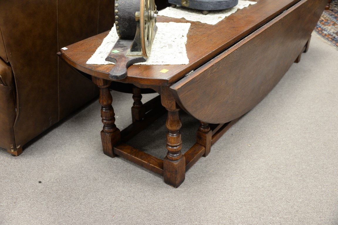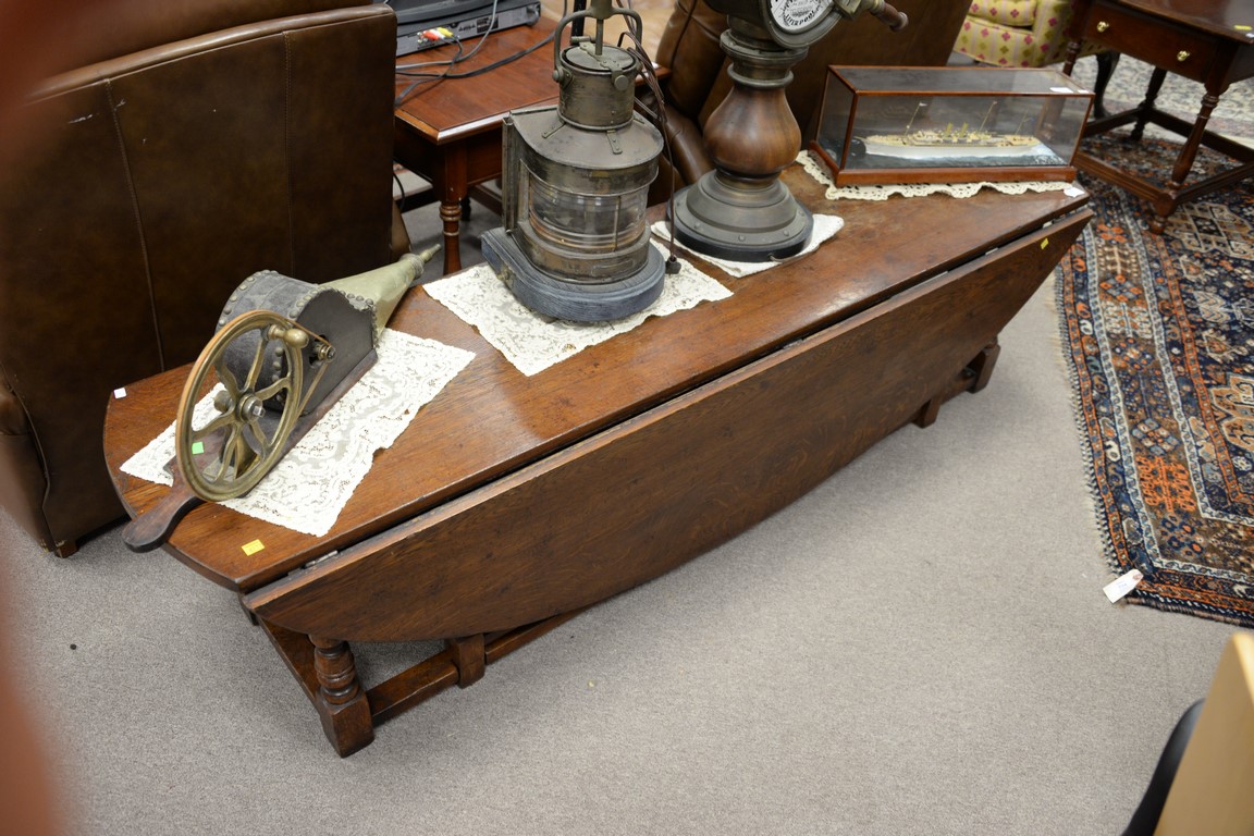 Large oak drop leaf gate leg coffee table low. ht. 18in., top: 16 x 72