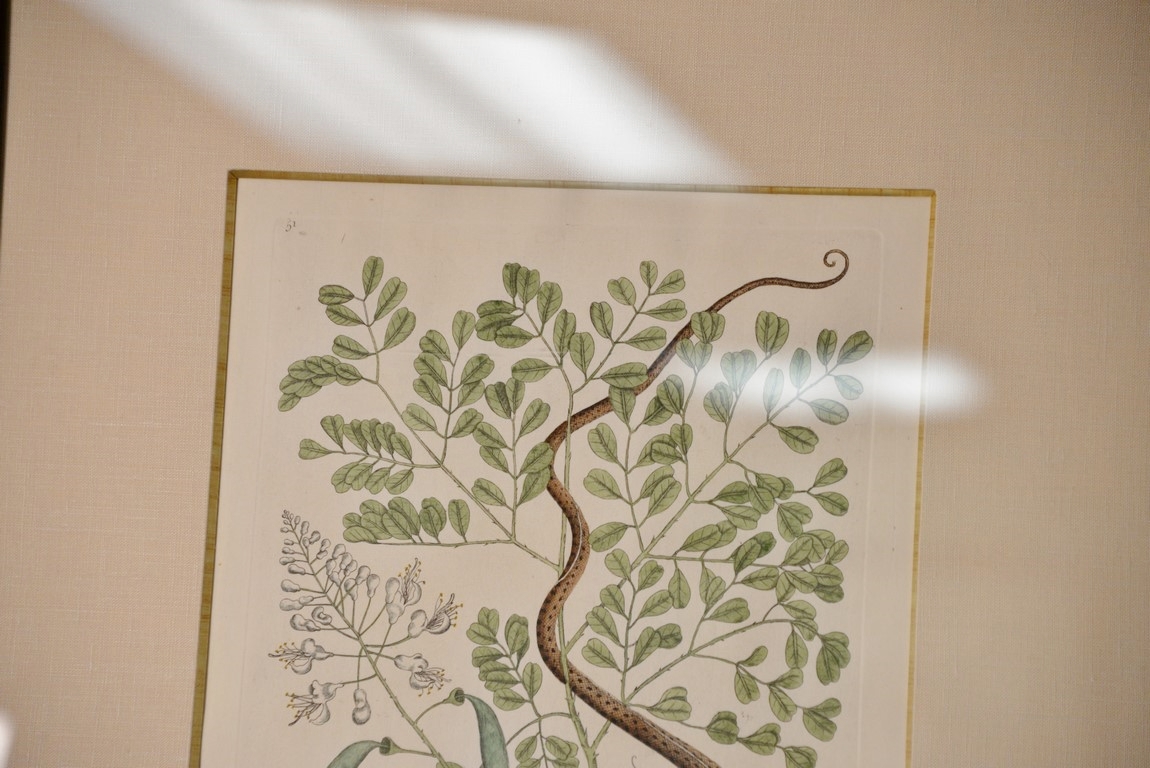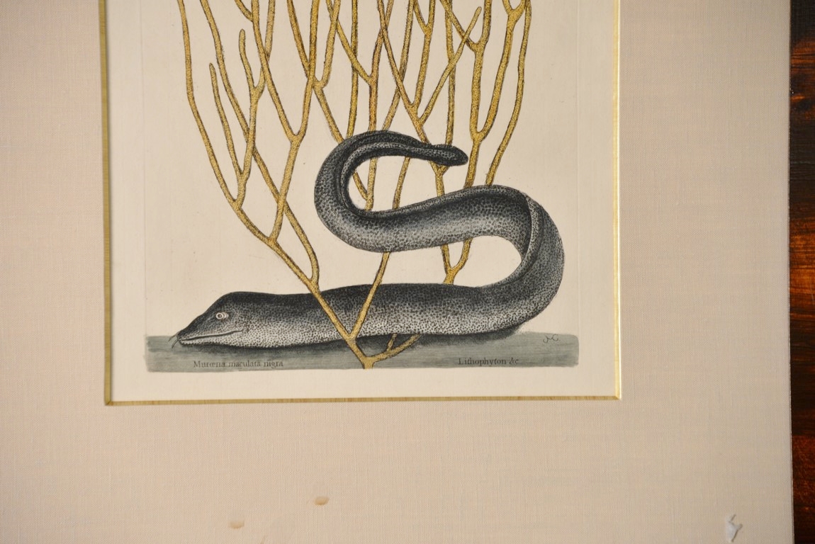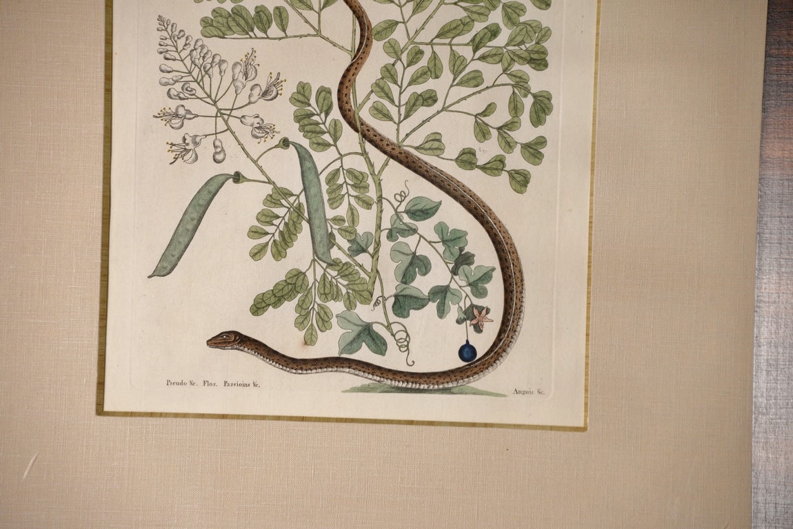 Mark Catesby 1679-1749 pair of hand colored copper plate engravings The Spotton Ribbon Snake Anguis Gracilis Maculatus Plate #51 and The Old Wife Guaperva Plate #22 From The Natural History of Carolina, Florida and the Bahama Islands framed by W. Graham Arader III sight size: 15 x 11 1/2 Provenance: Property from Credit Suisse’s Americana Collection