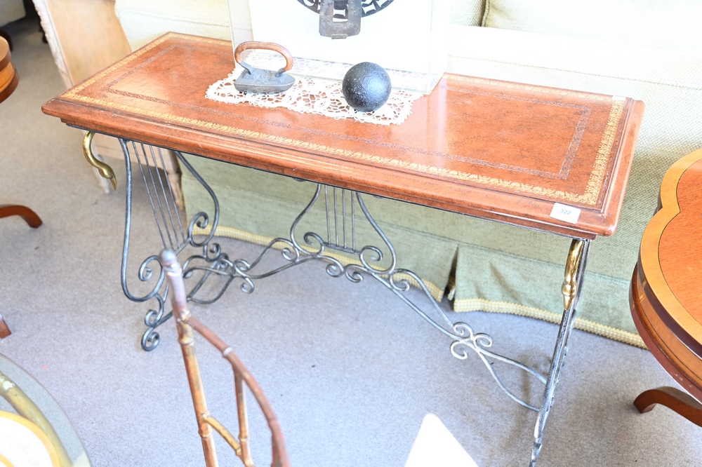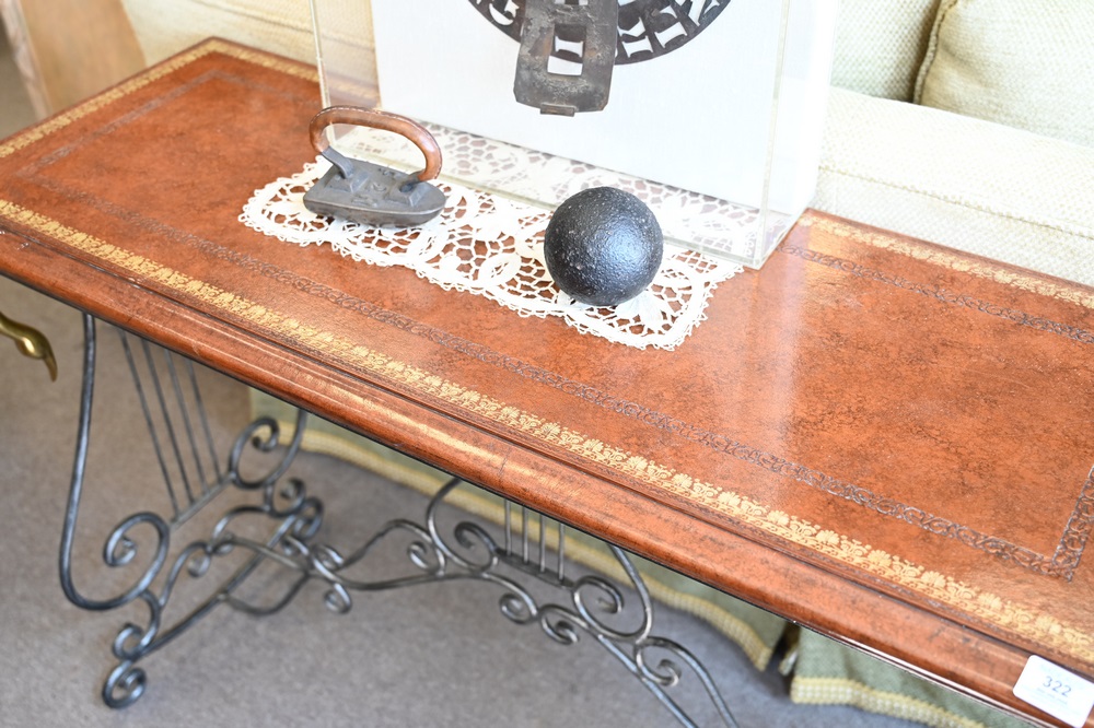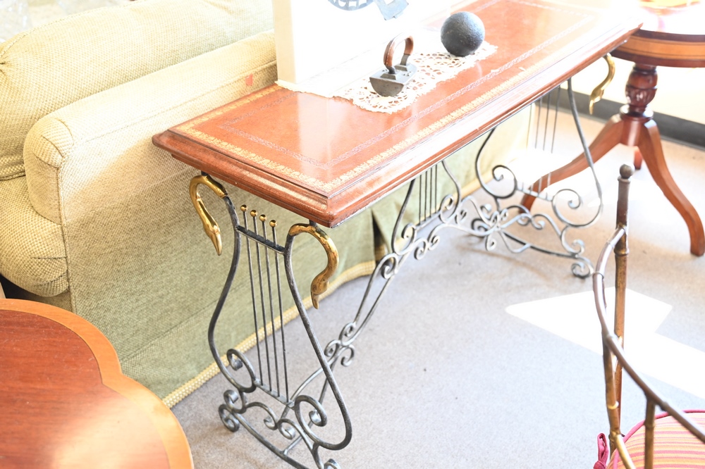 Lot 322: Sofa Table, having tooled leather top over metal base with swan decorations, height 30 inches, top 17″ x 44″.