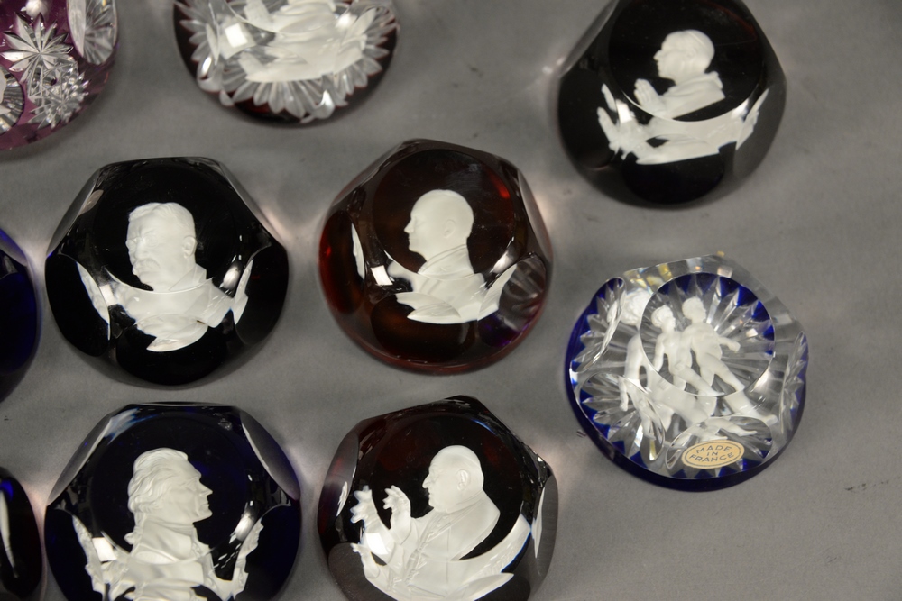 Thirteen Baccarat Glass Paperweights, having sulfide portrait bust interior, to include nine in a matching style. Provenance: Estate of James Wadhams.