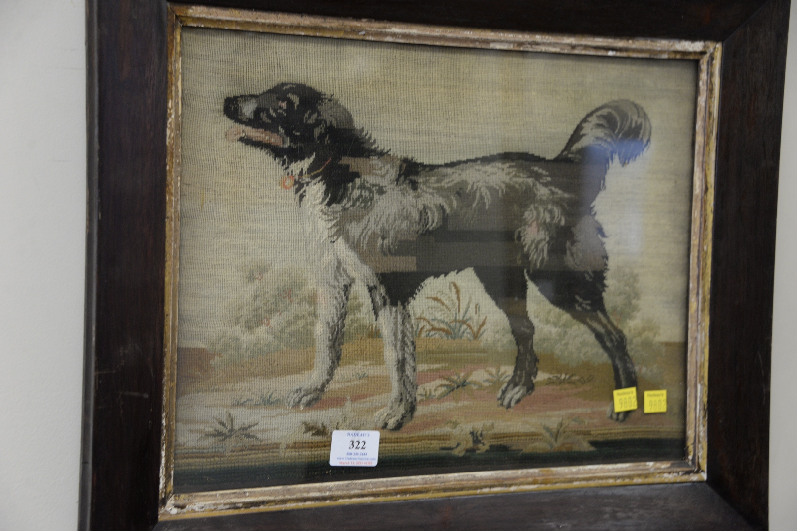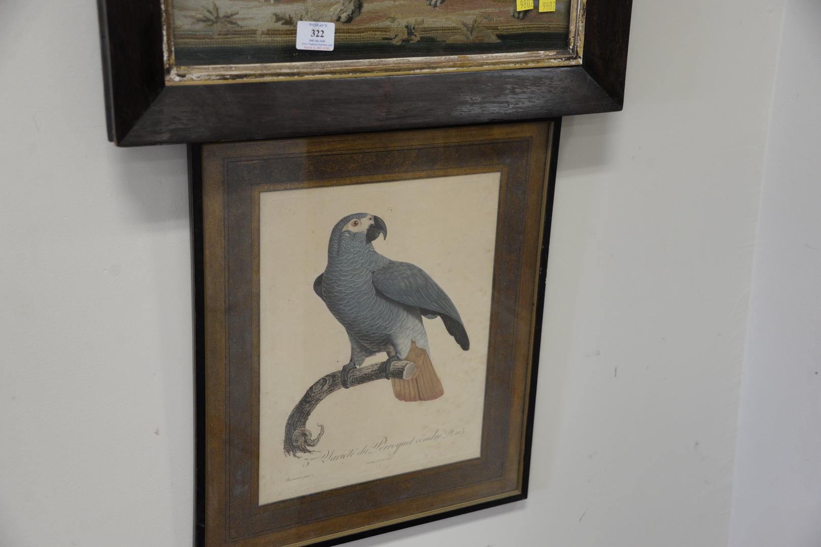 Three Piece Lot, to include a Jacques Barraband framed engraving of a parrot, Thistle, a maritime lithograph by Currier and Ives along with a framed needlepoint of a dog, sight size overall 19 x 30.
