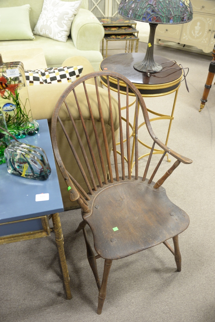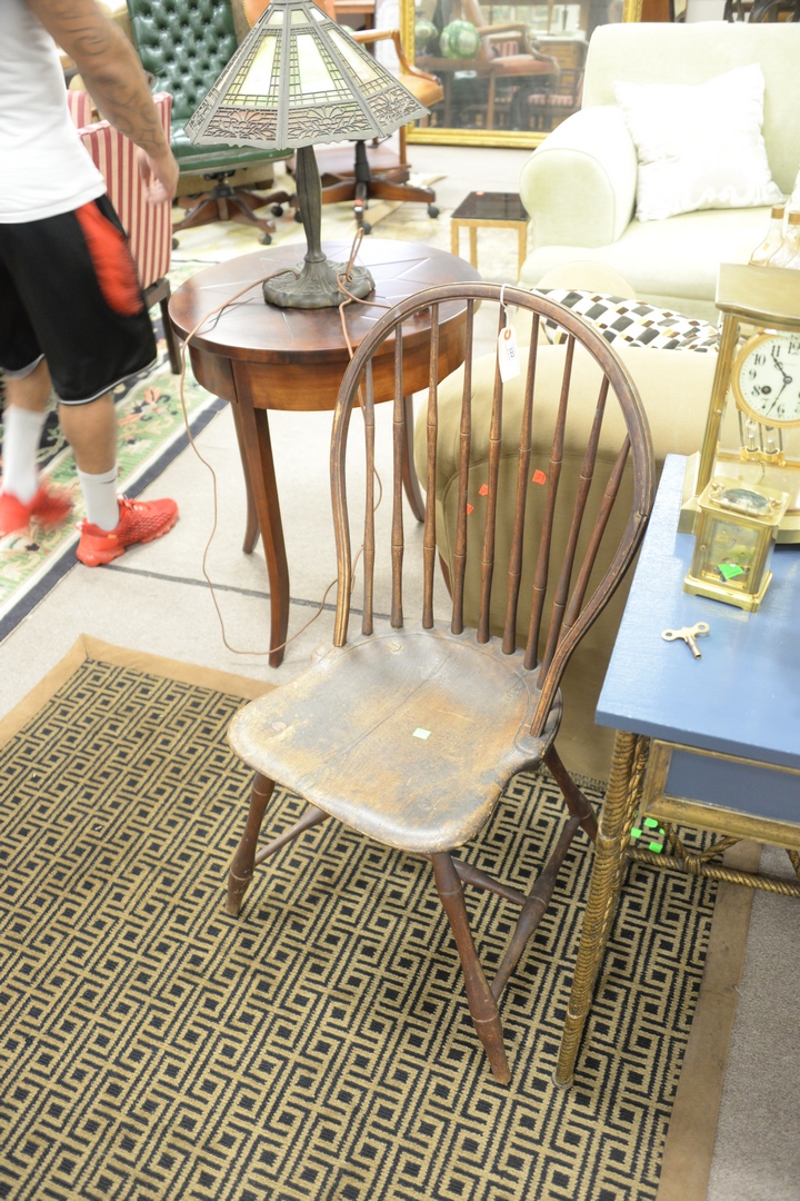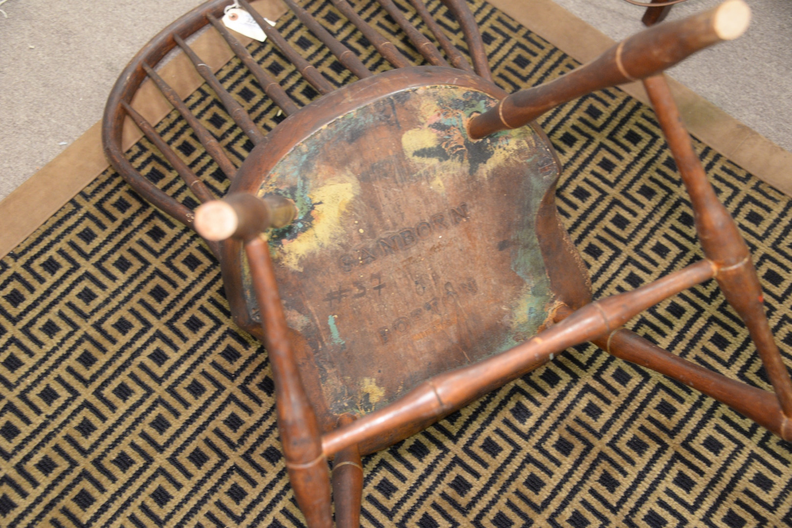 Lot 322: Two Early Windsor Chairs, having one continuous arm, one bow back, side chair signed Reuben Sanborn Boston, seat height 36 inches.
