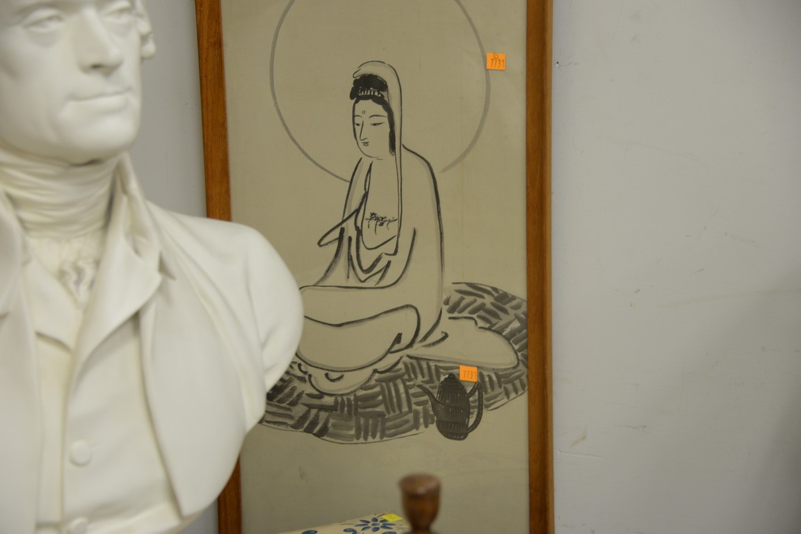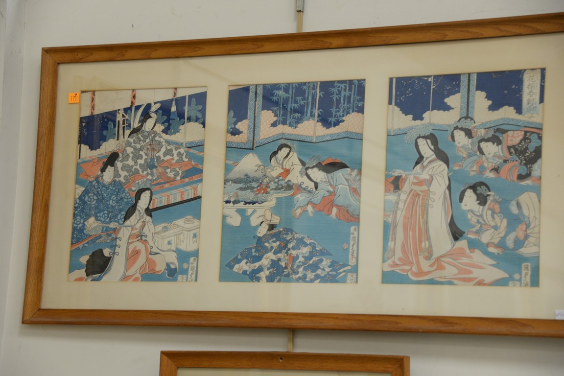 Lot 322: Two piece lot to include Japanese triptych of people in traditional garb, each 12 x 9 and Chinese scroll of a seated woman signed …