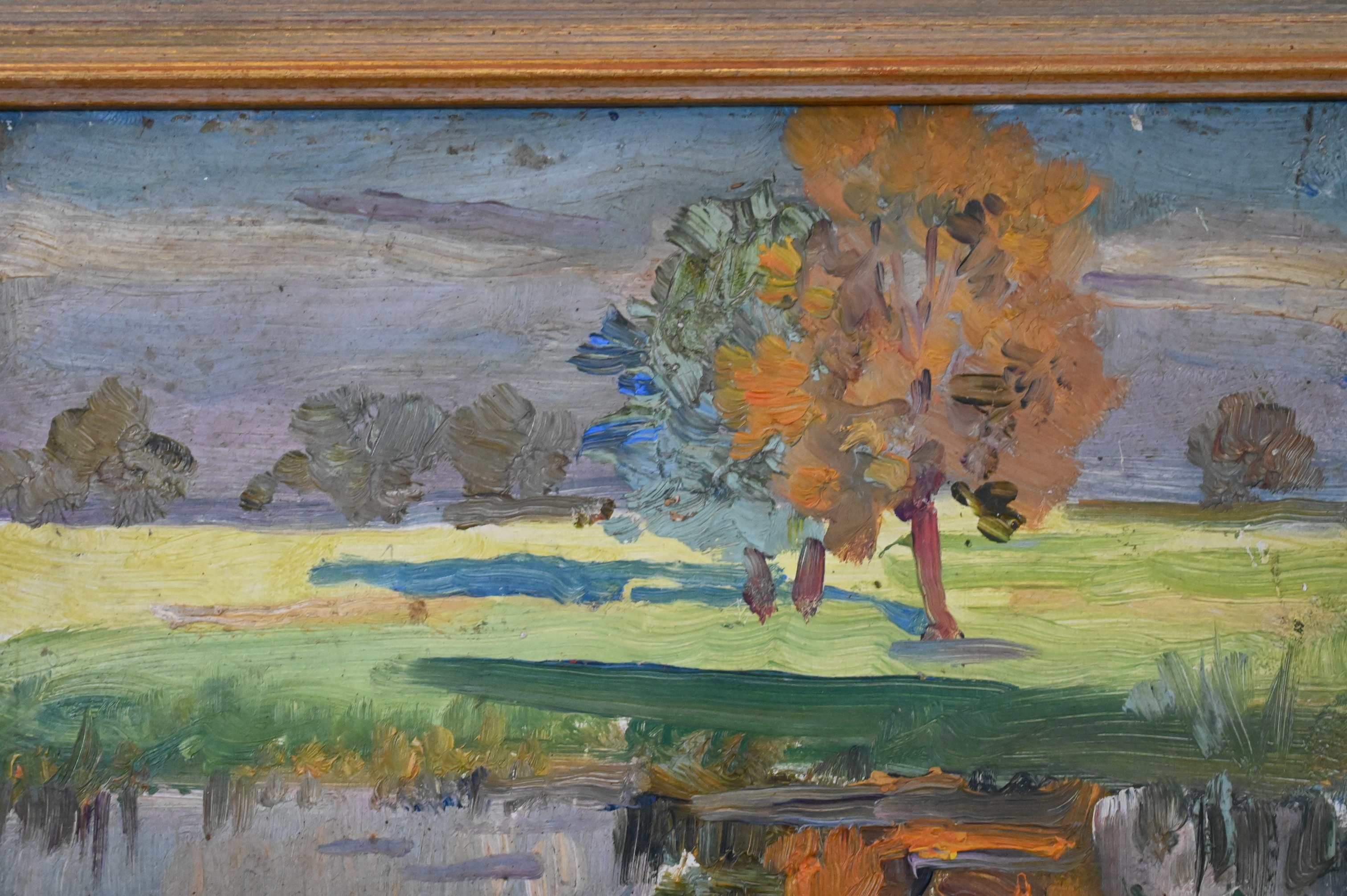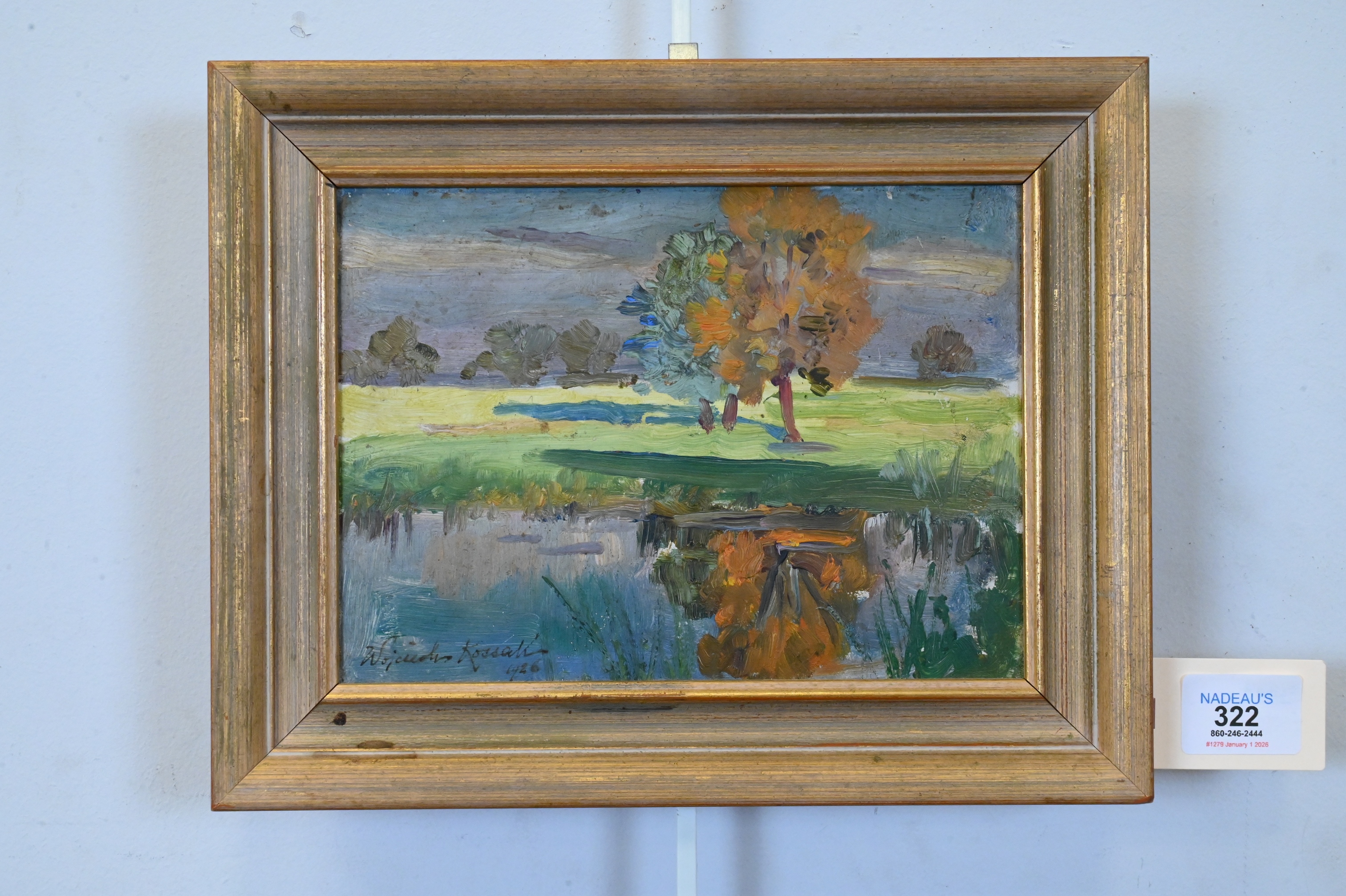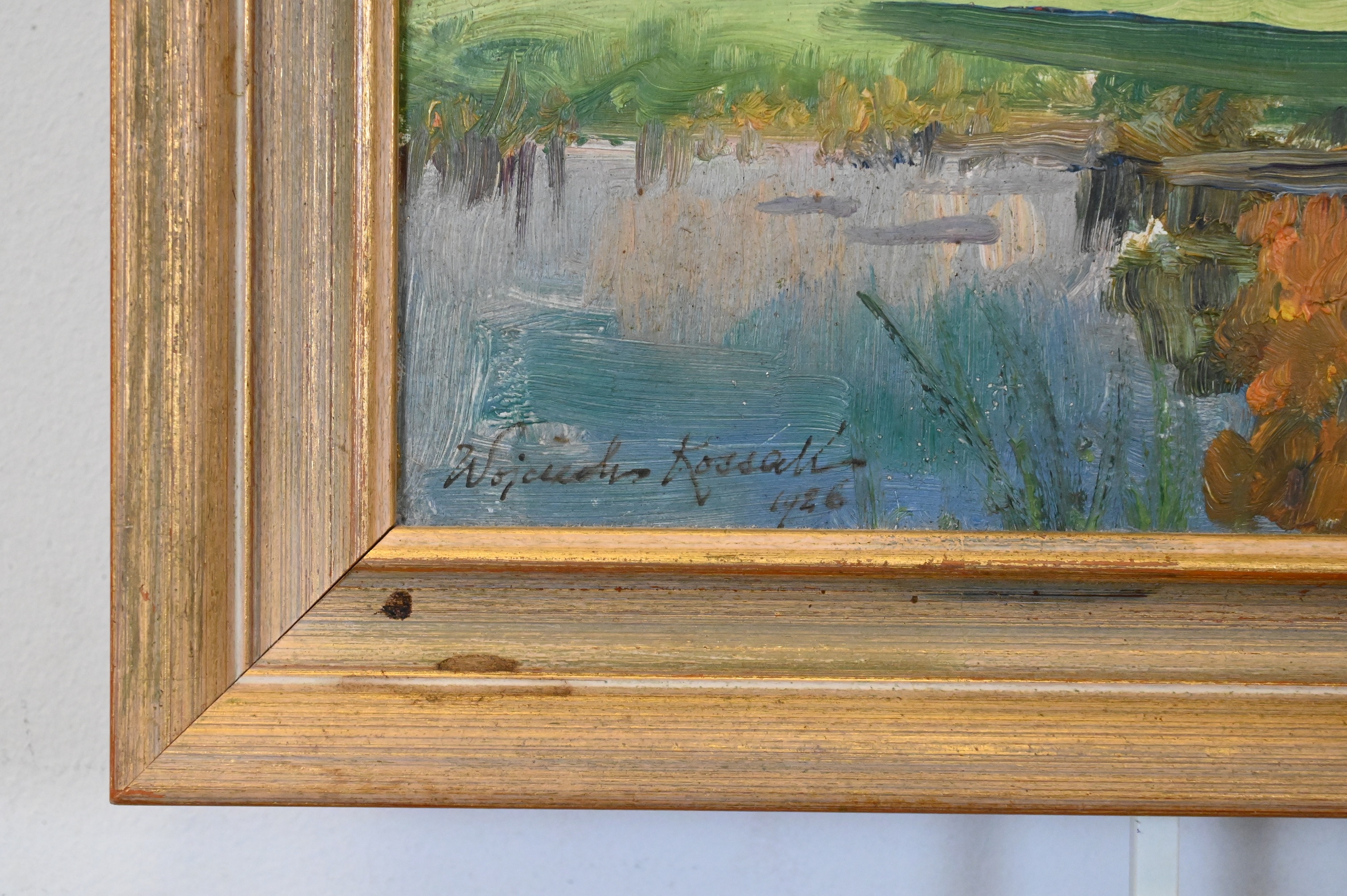 A lively small landscape study painted with rapid, impressionistic strokes in greens, ochres, and cool blues, depicting a sunlit clearing beside a reflective pond with autumnal trees and soft atmospheric depth. Kossak’s fluid brushwork and immediacy of execution capture a plein-air character