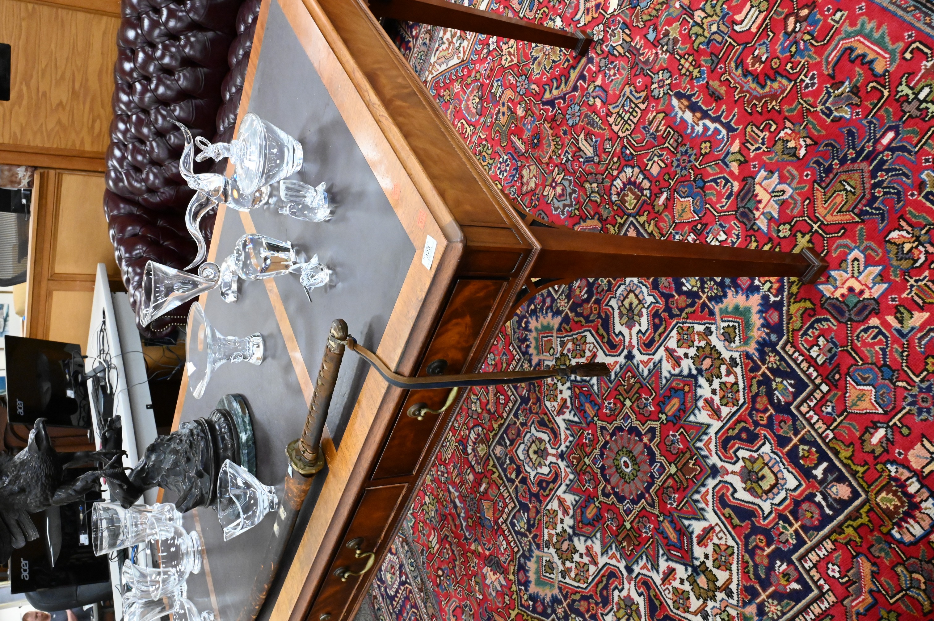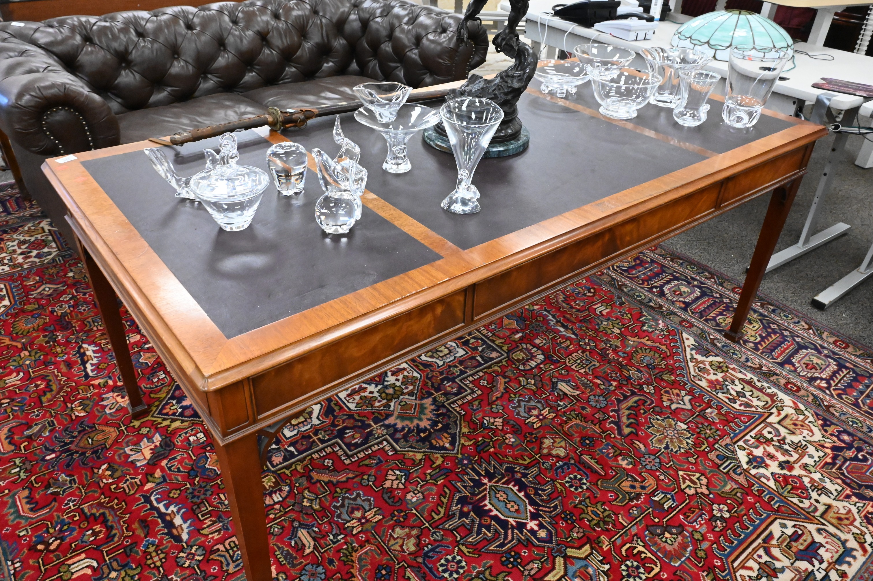 having tooled leather top and three drawers set on tapered legs, slight sun fading