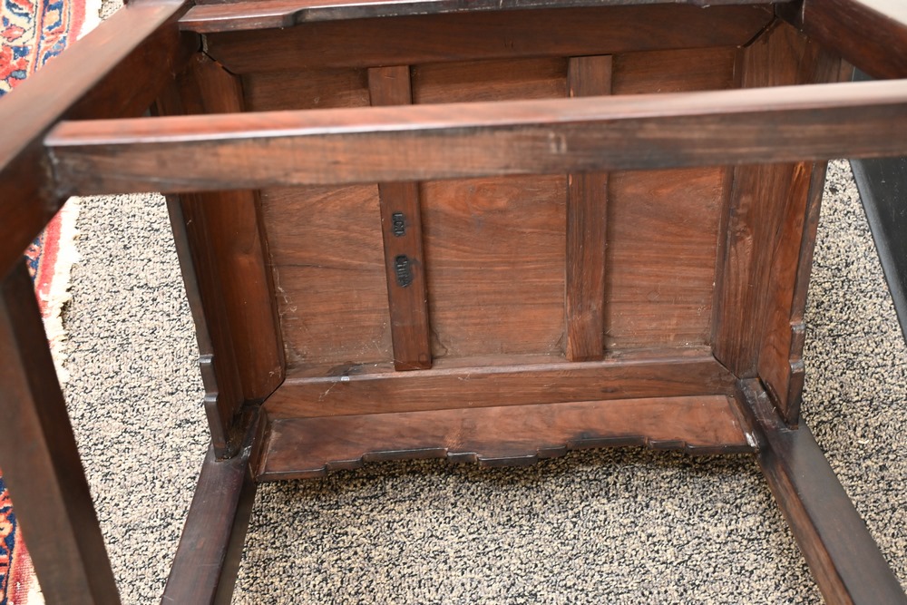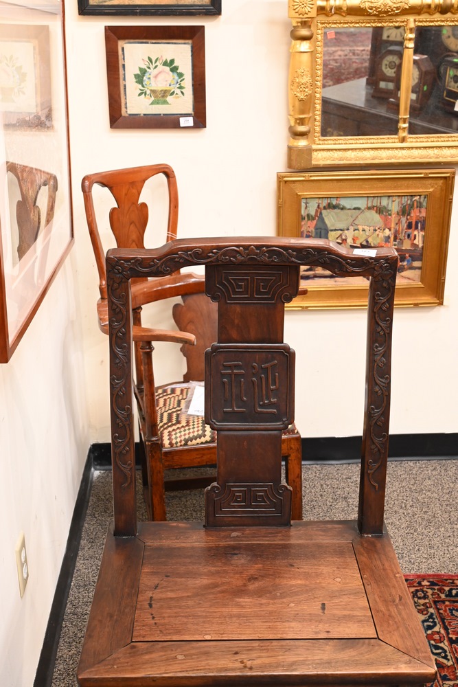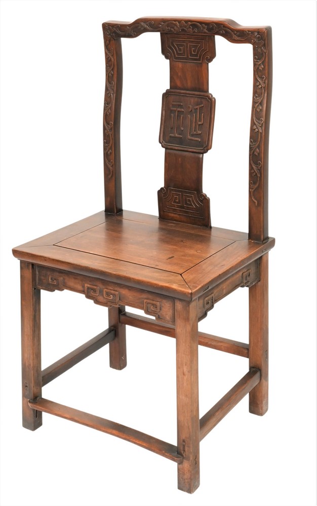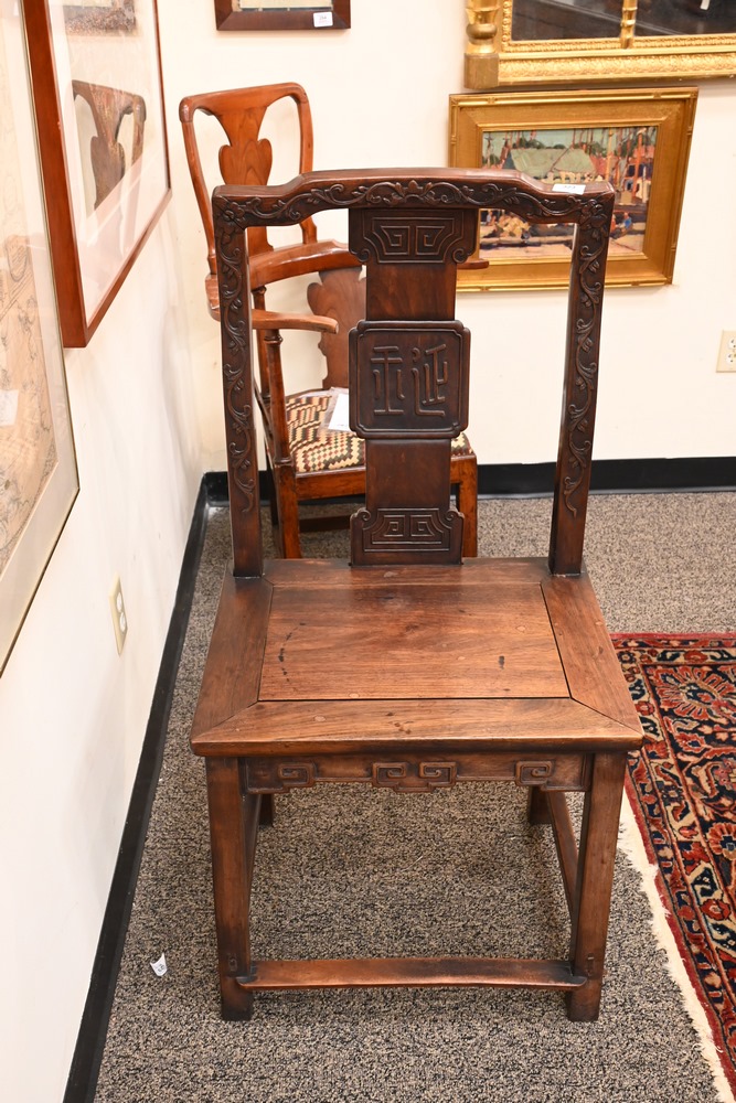 Lot 323: Chinese Hardwood Chair having carved back 18th – 19th century height 43 inches, seat height 21 inches, width 21 1/2 inches