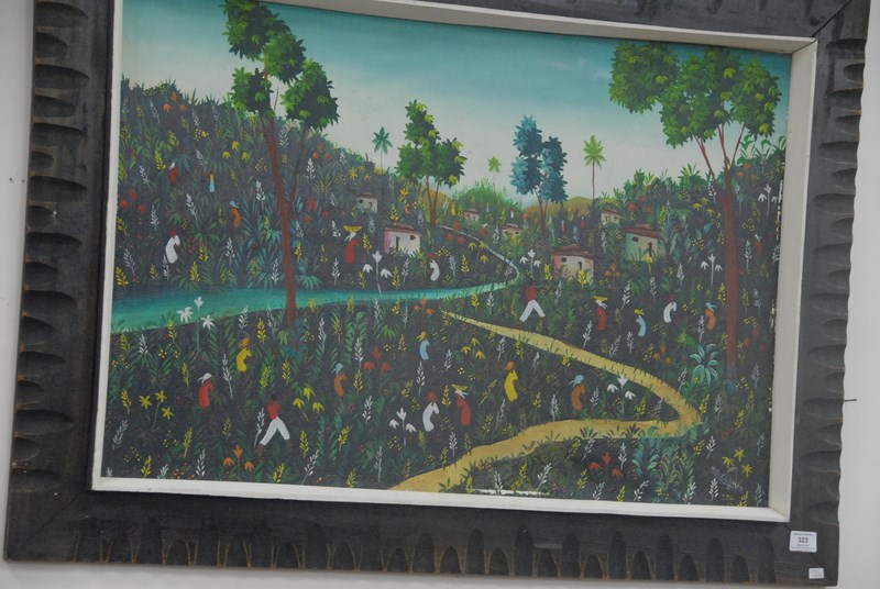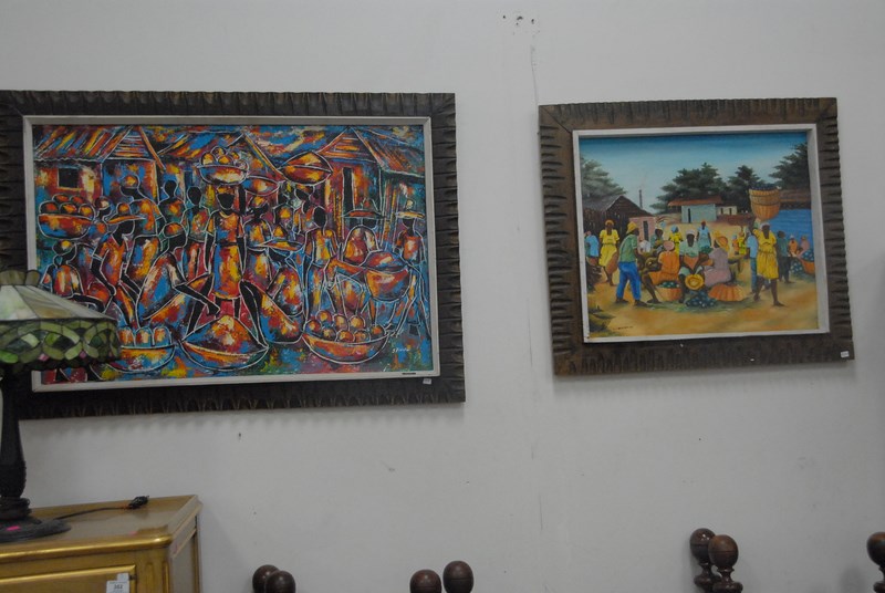 Lot 323: Four framed South American oil on canvas paintings, Max Corin, Spiekke, and C. Valtrain, all approximately 23 x 35.