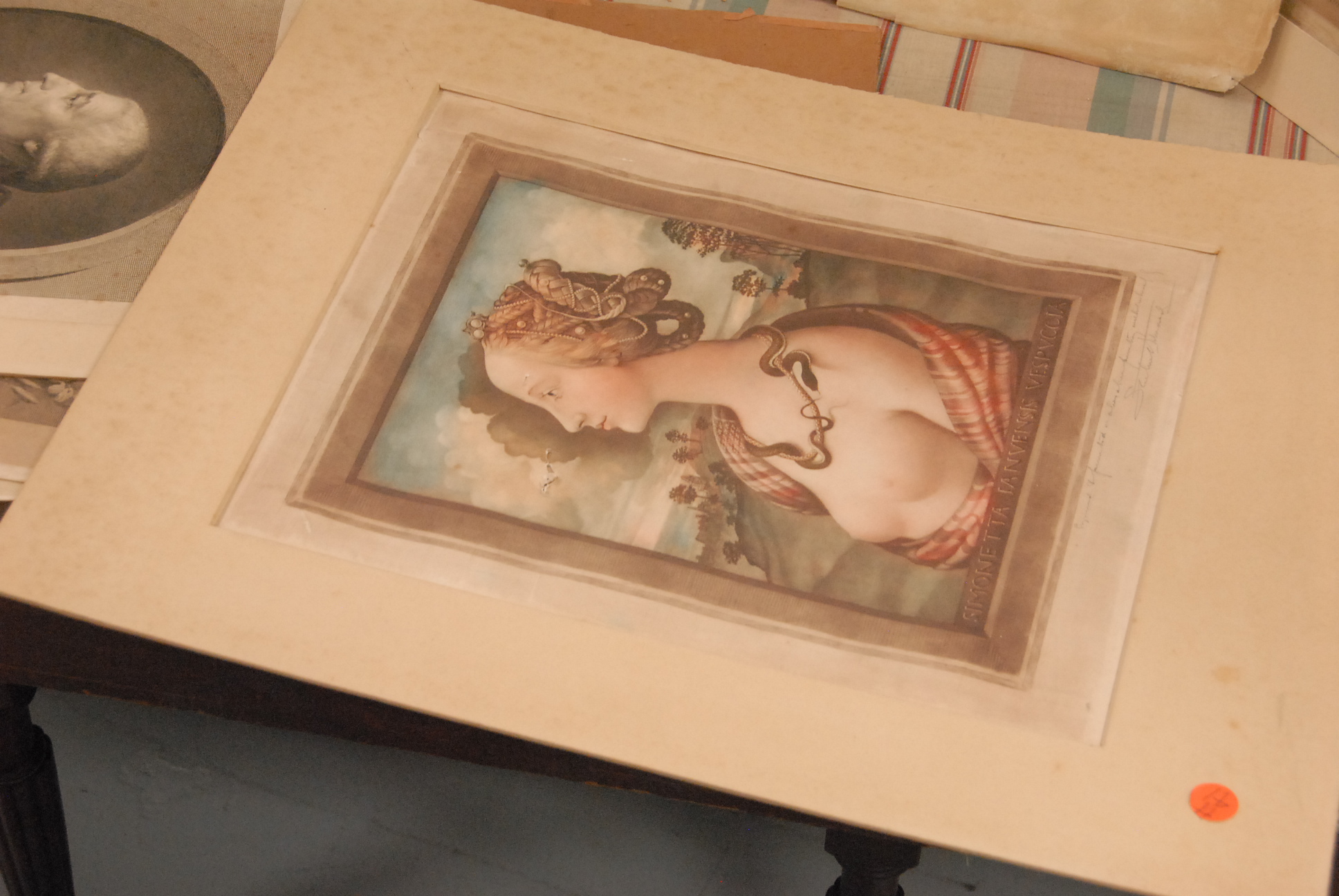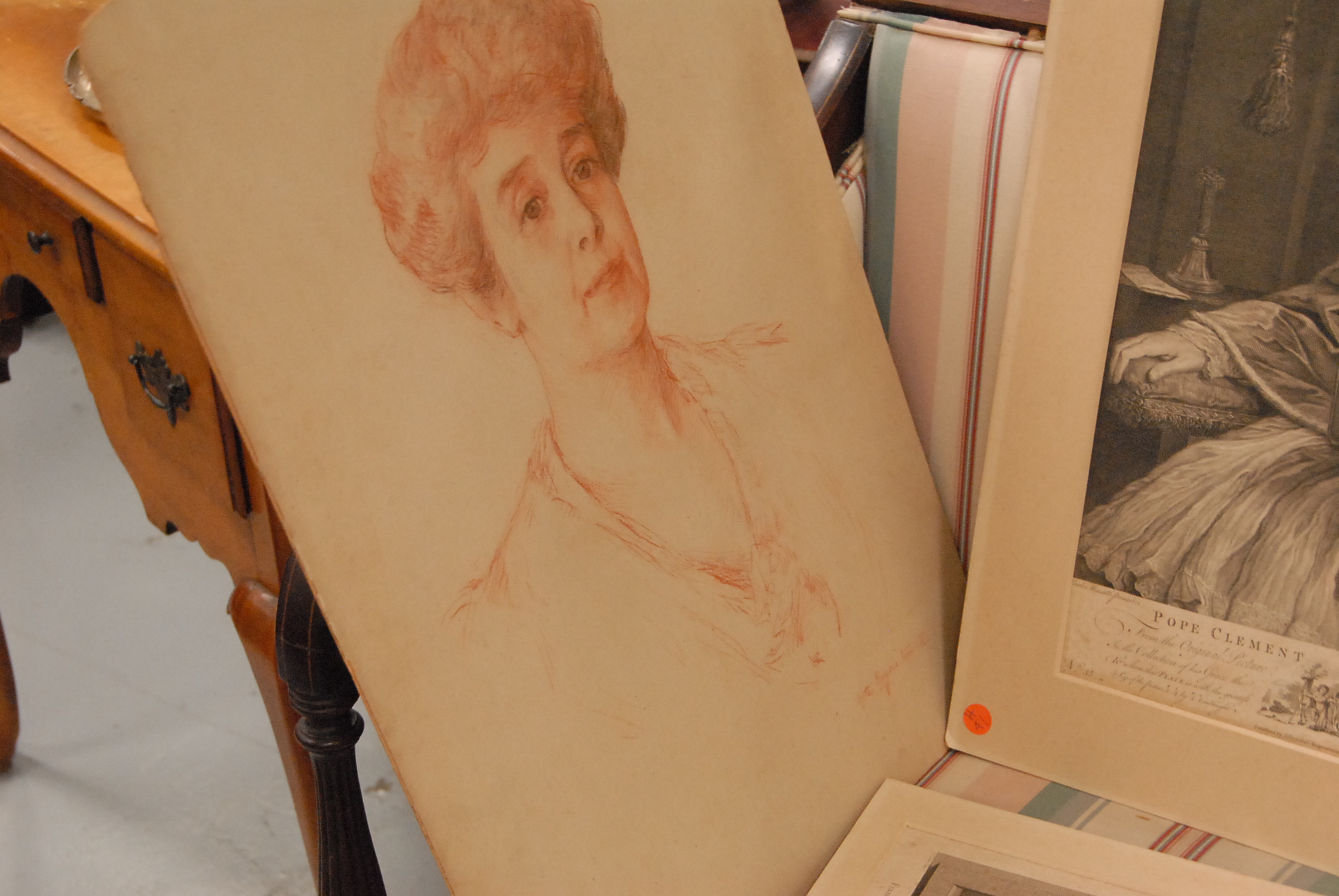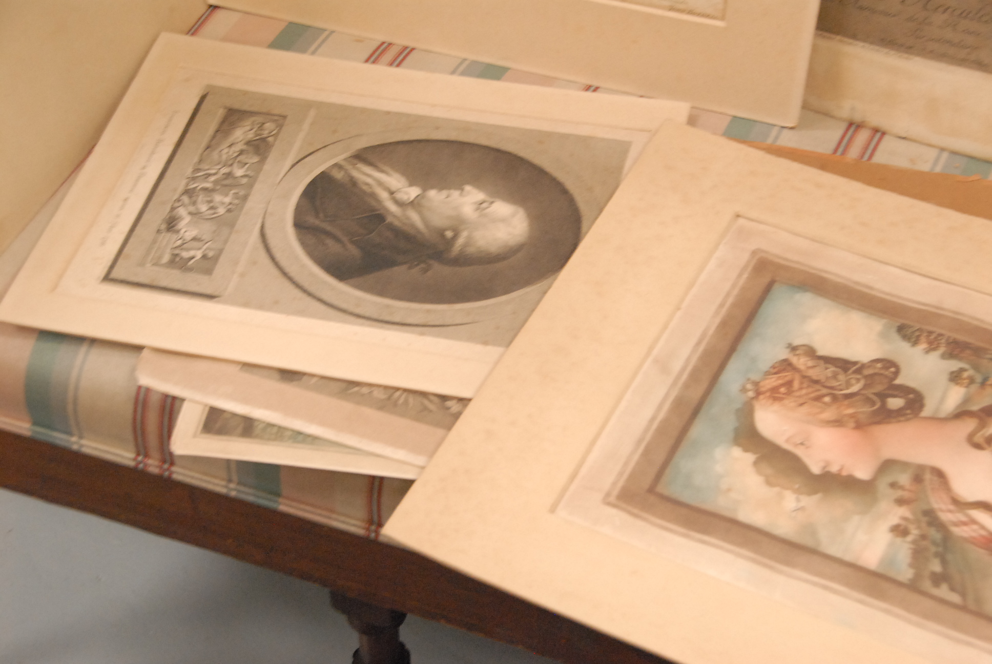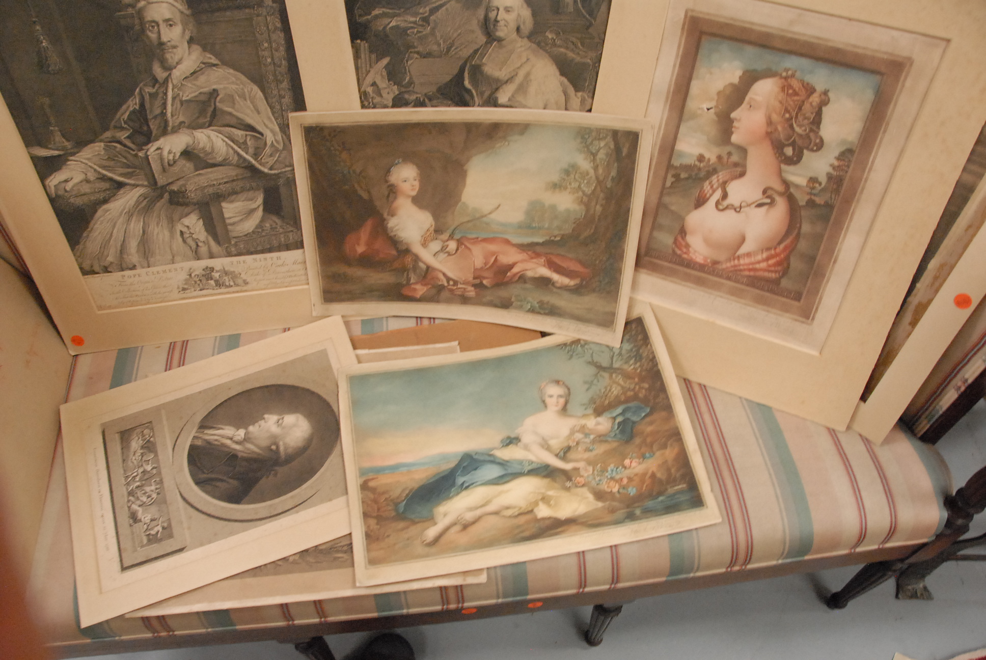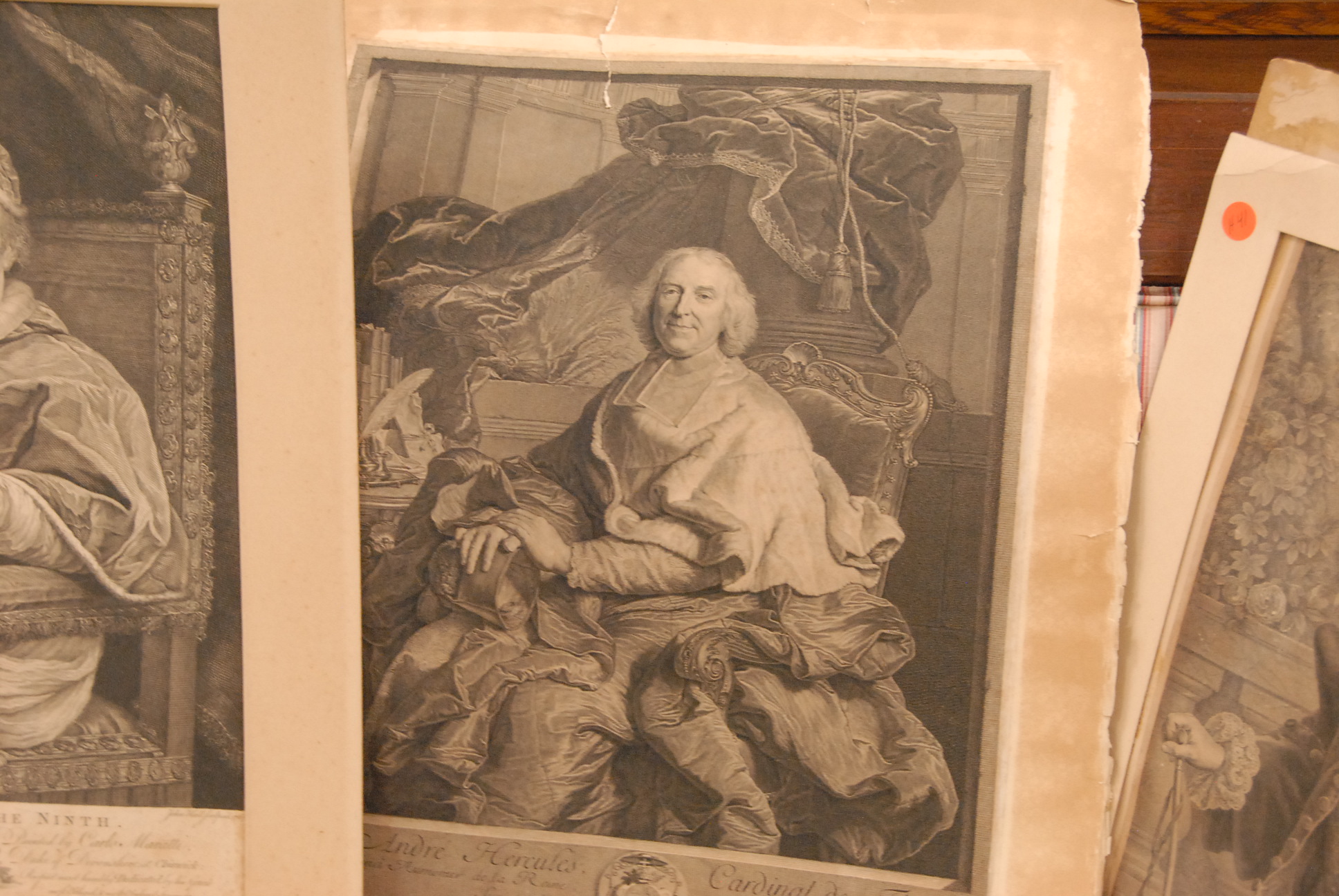 Group of engravings Pope Clement, Andre Hercules, Henry Camille, and a couple of women, pencil sketch of Newell, etc.