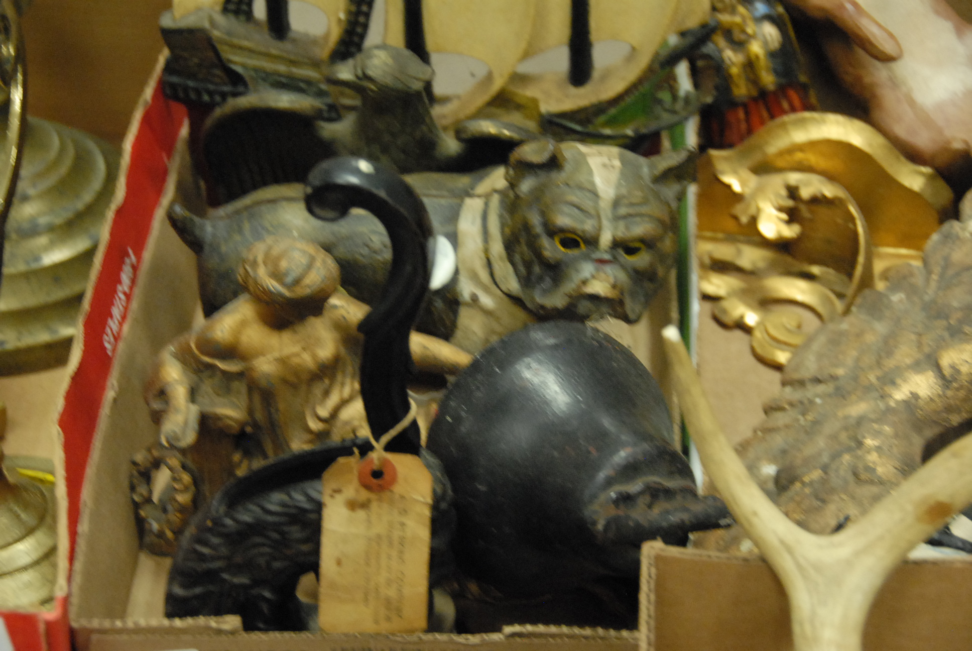 Group of three box lots to include antlers, small bird figures, a pair of wings, a pair of small shelves, a bulldog doorstop, a ship doorstop, etc