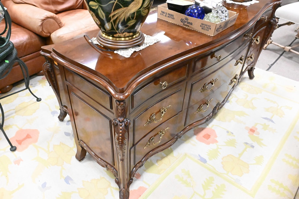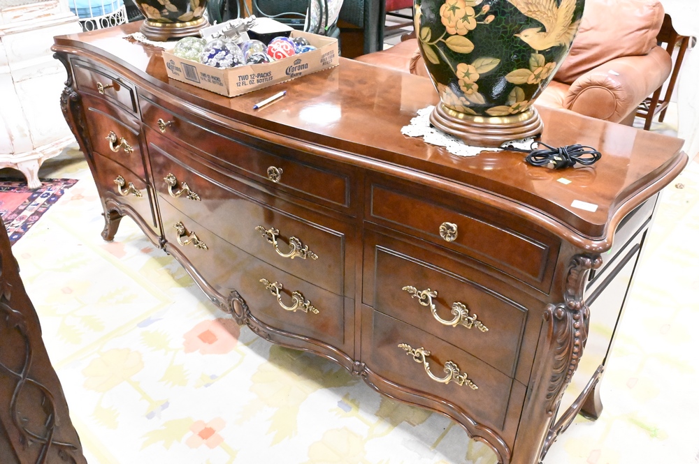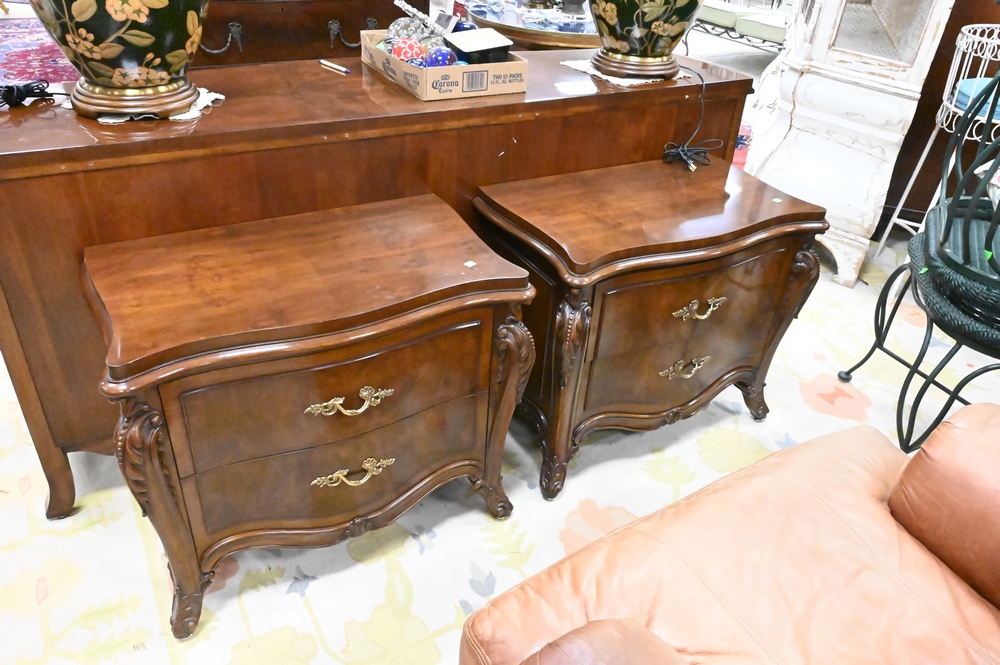 Karges Mahogany Three Piece Lot, to include a Louis XV style triple chest along with two bedside chests, height 33 1/2 inches, top 20″ x 74″.