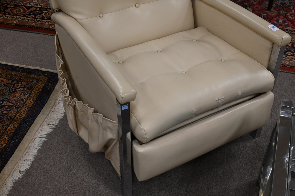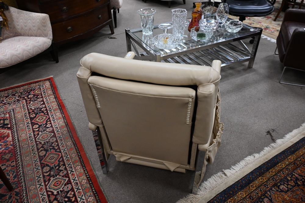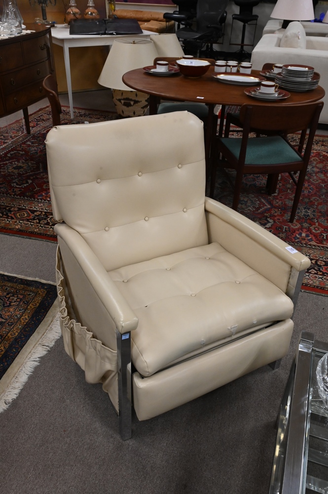Lot 323: Mid Century Reclining Chair, having chrome frame with almond leather upholstery, height 32 inches, width 27 inches.