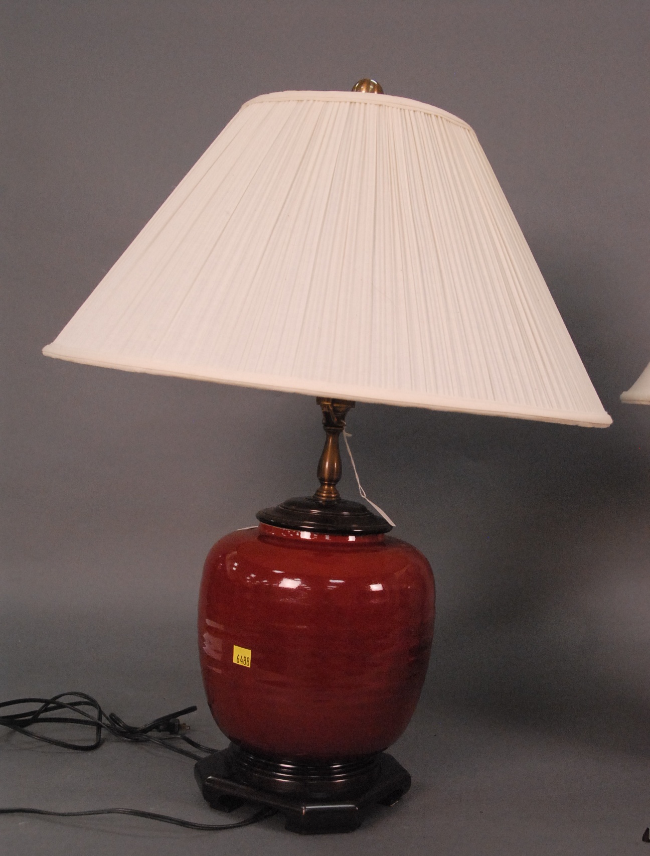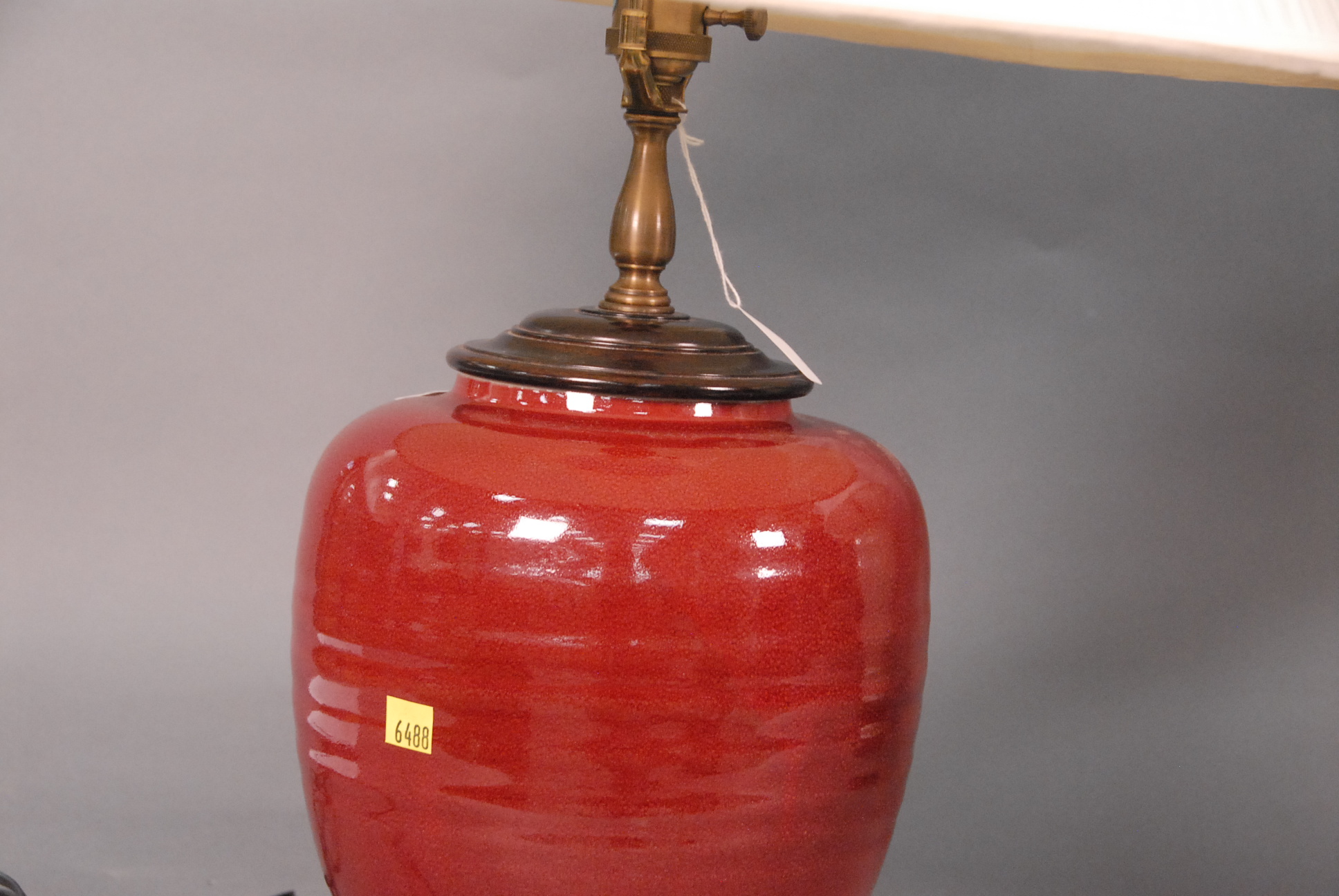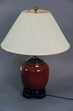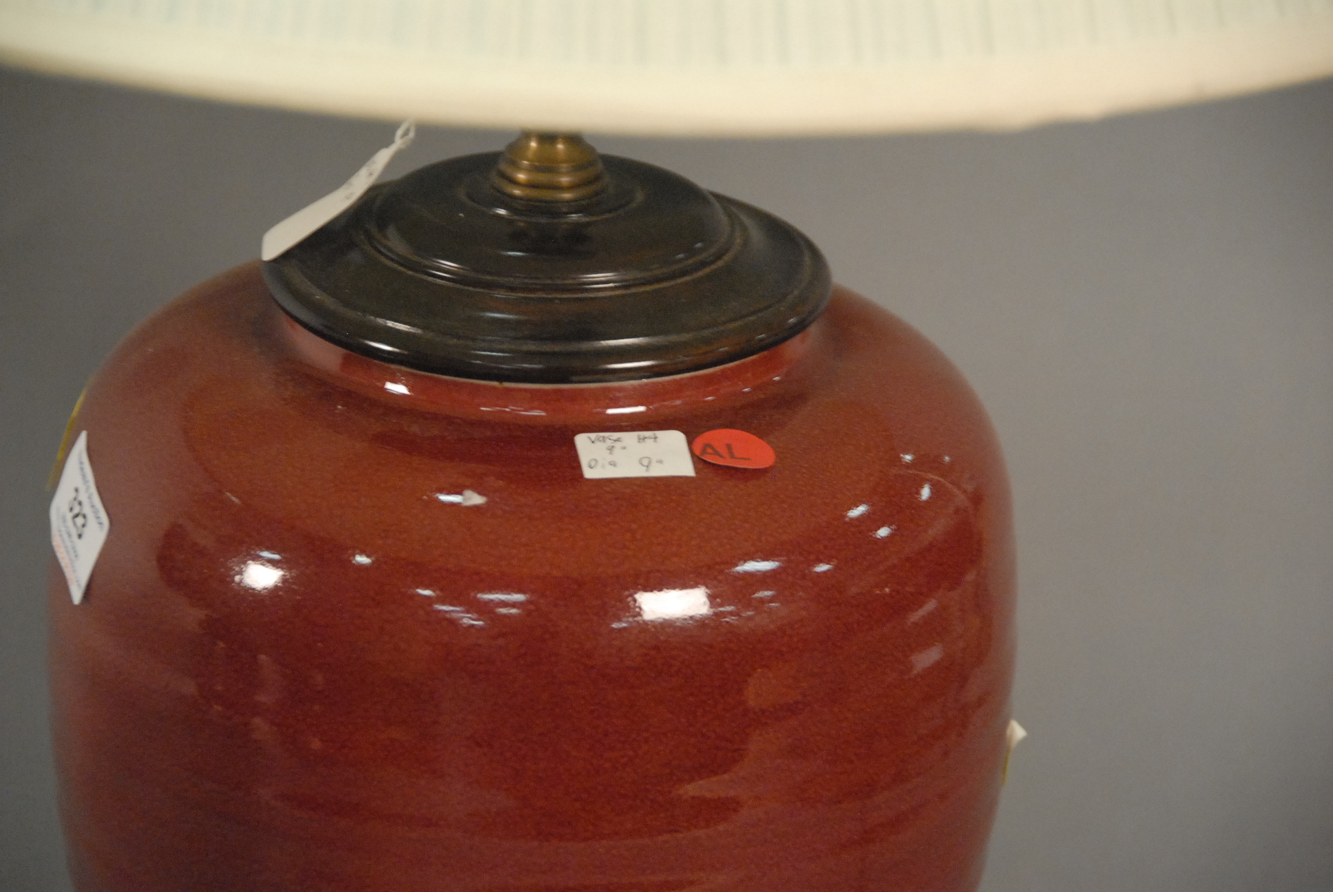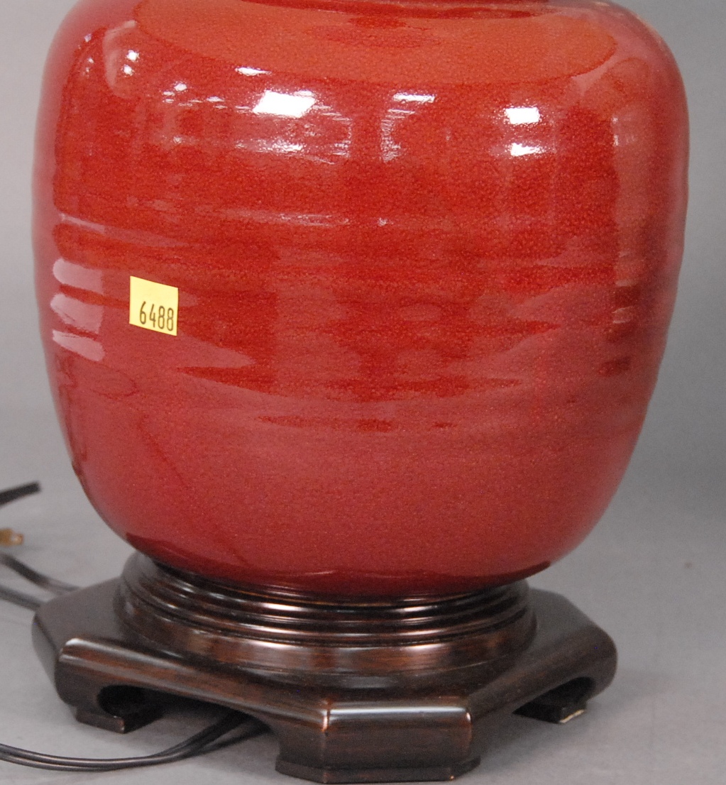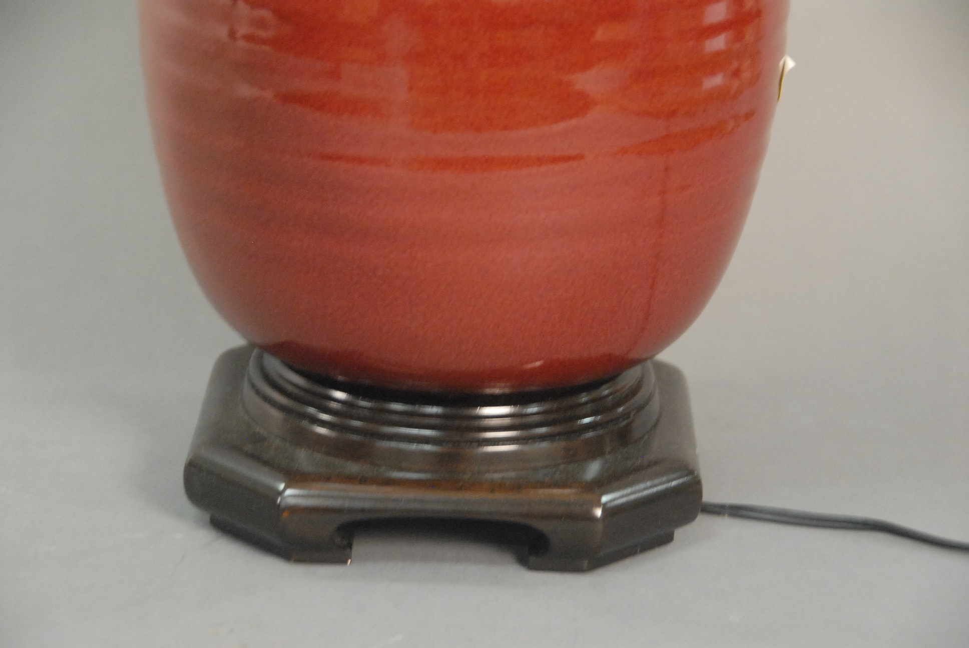 Lot 323: Red glazed Oriental ovoid vase made into a table lamp having drilled base with teak stand and cover, ht. of vase: 9in.
