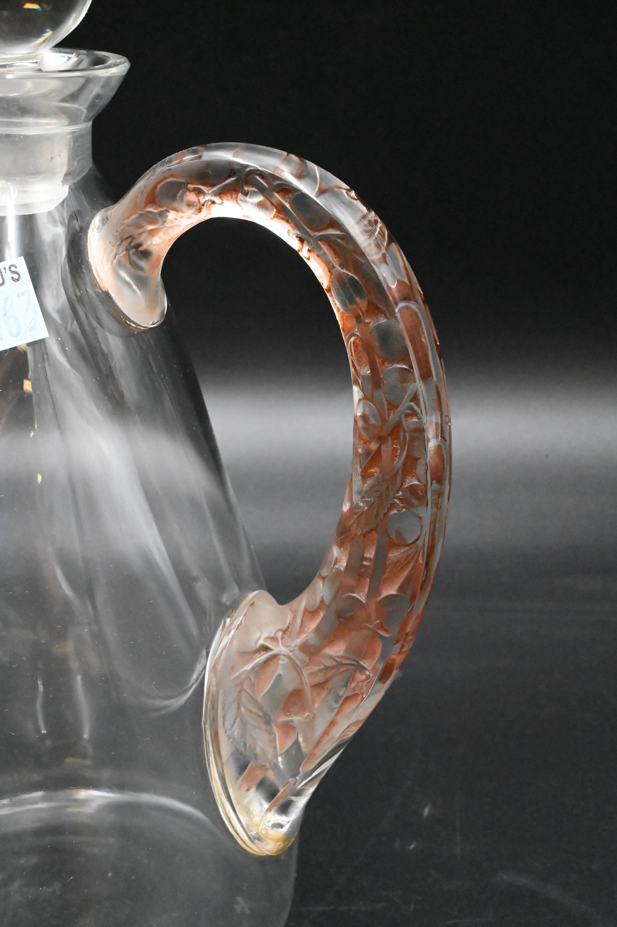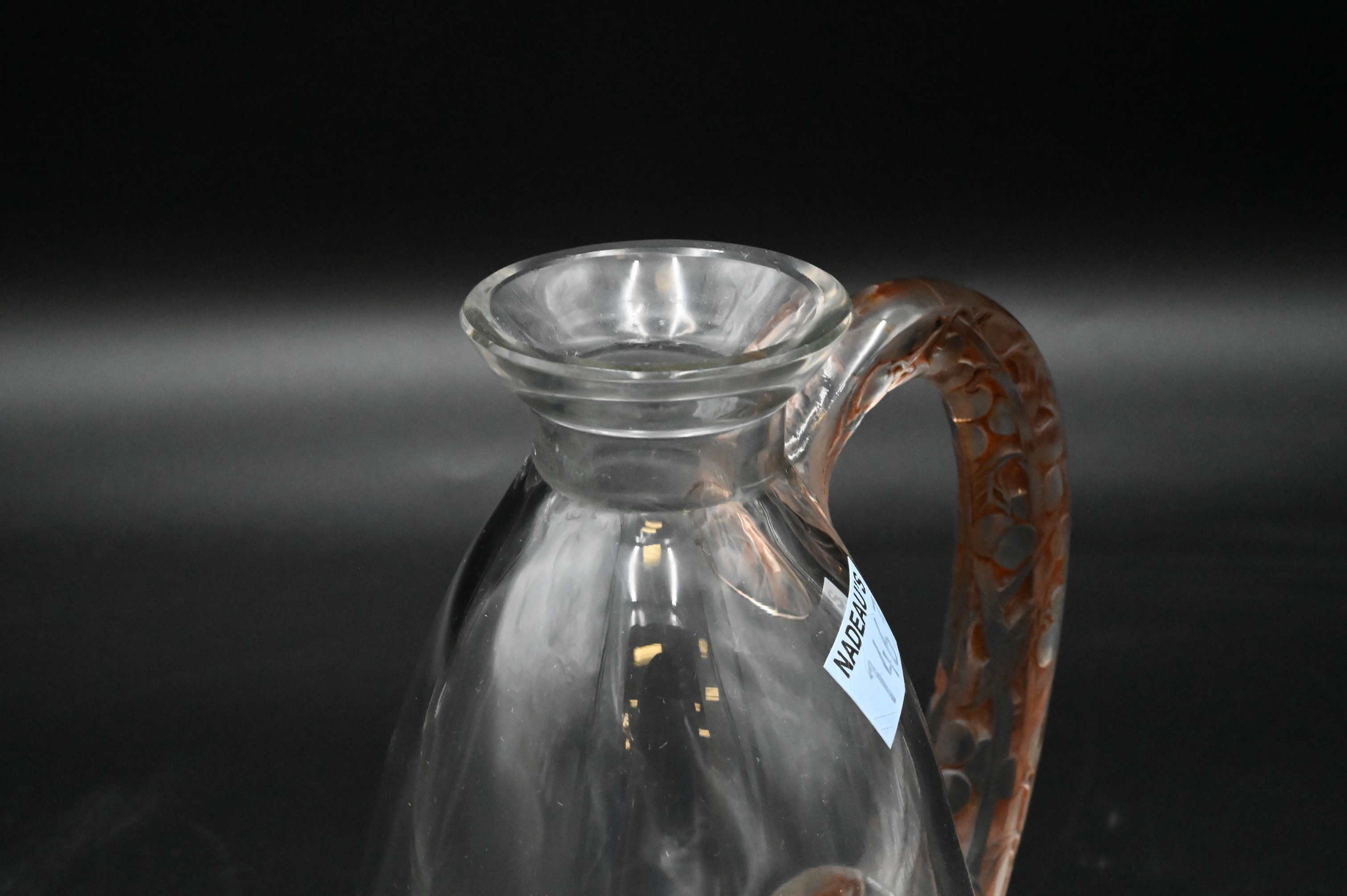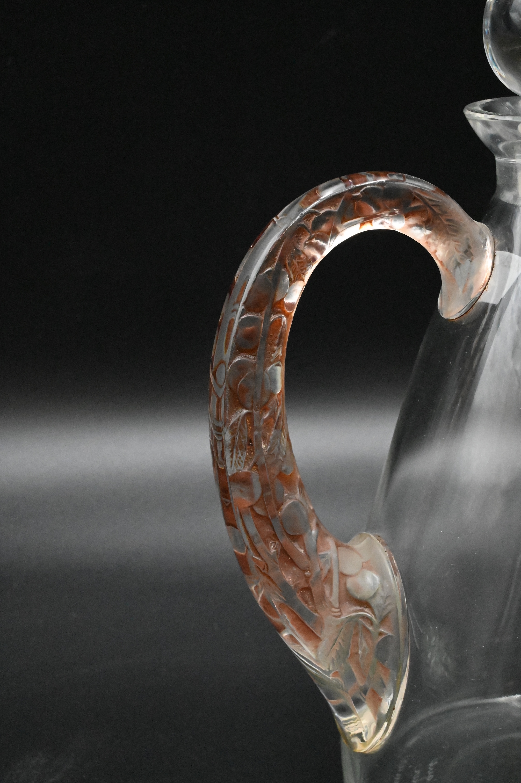 Rene Lalique “Prunelles” Glass Carafe, of reverse tapering form and everted rim, having sepia stained handle with blackthorn motif, signed “R.Lalique pour Cusenier” on bottom, height 8 inches, diameter 4 1/2 inches.