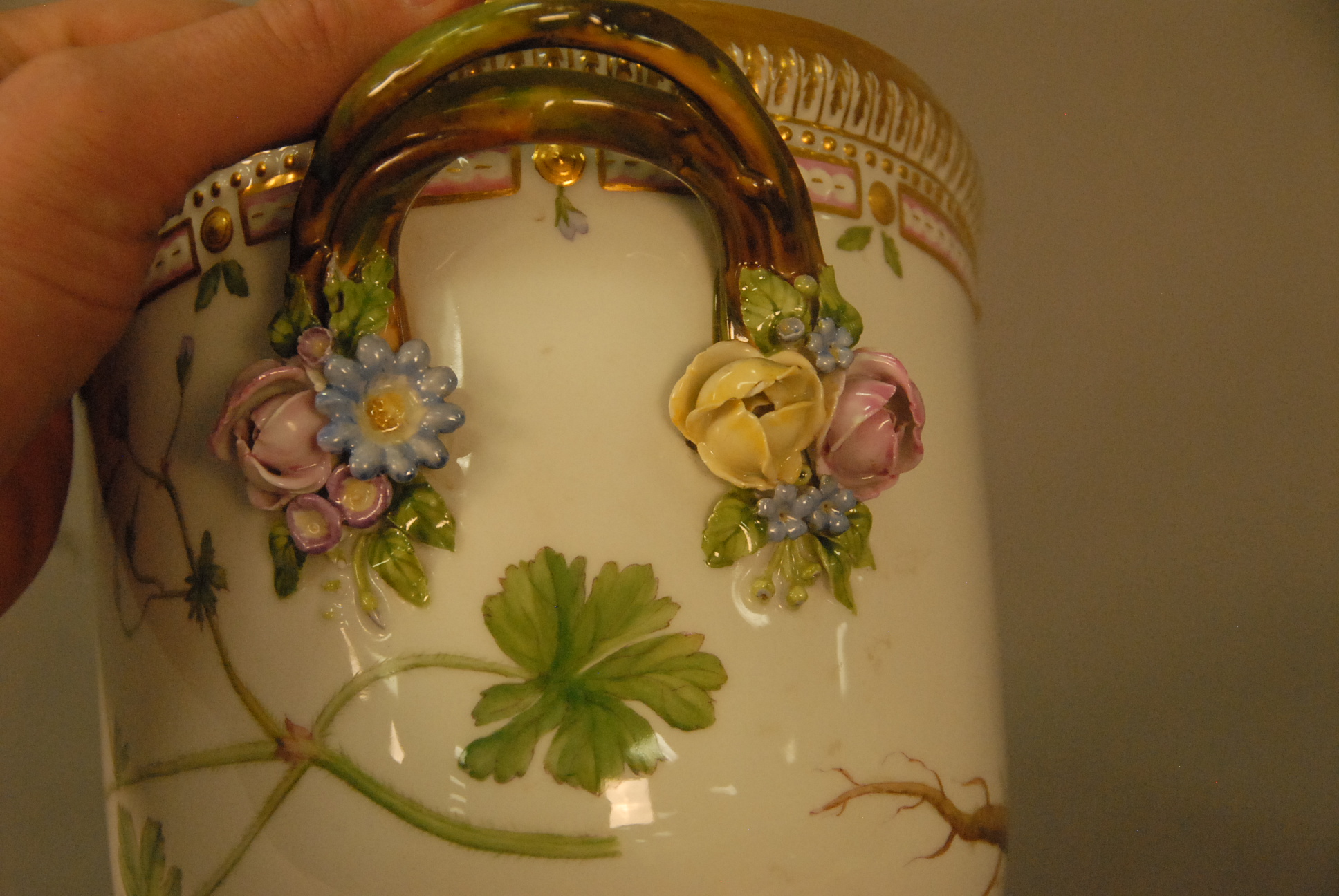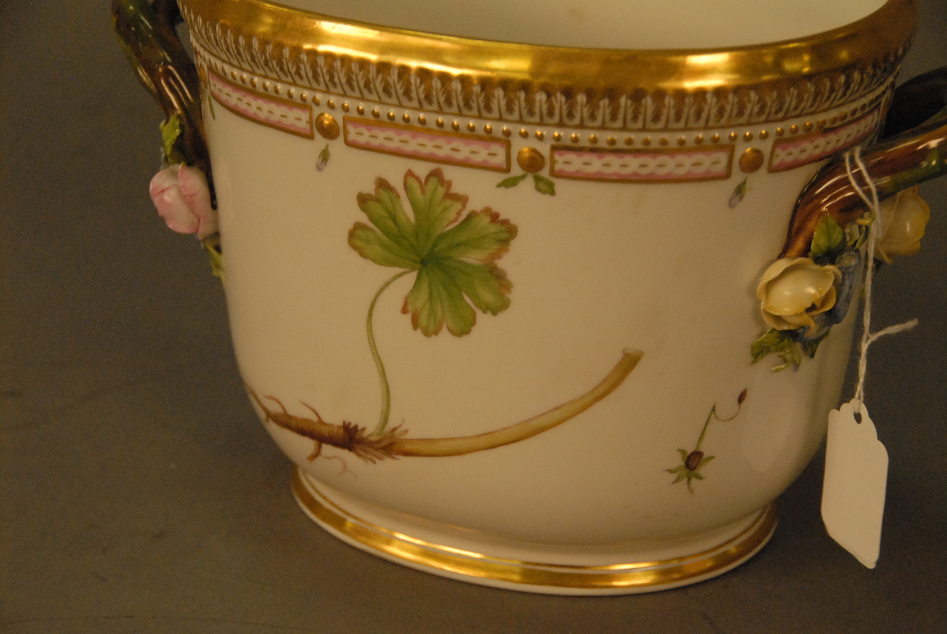 Lot 323: Royal Copenhagen porcelain jardinire, Flora Danica pattern, underside inscribed in script ‘Geranium Pyrenocicum, L.’, late 20th century. ht. 6 3/4in. lg. over handles 11in.