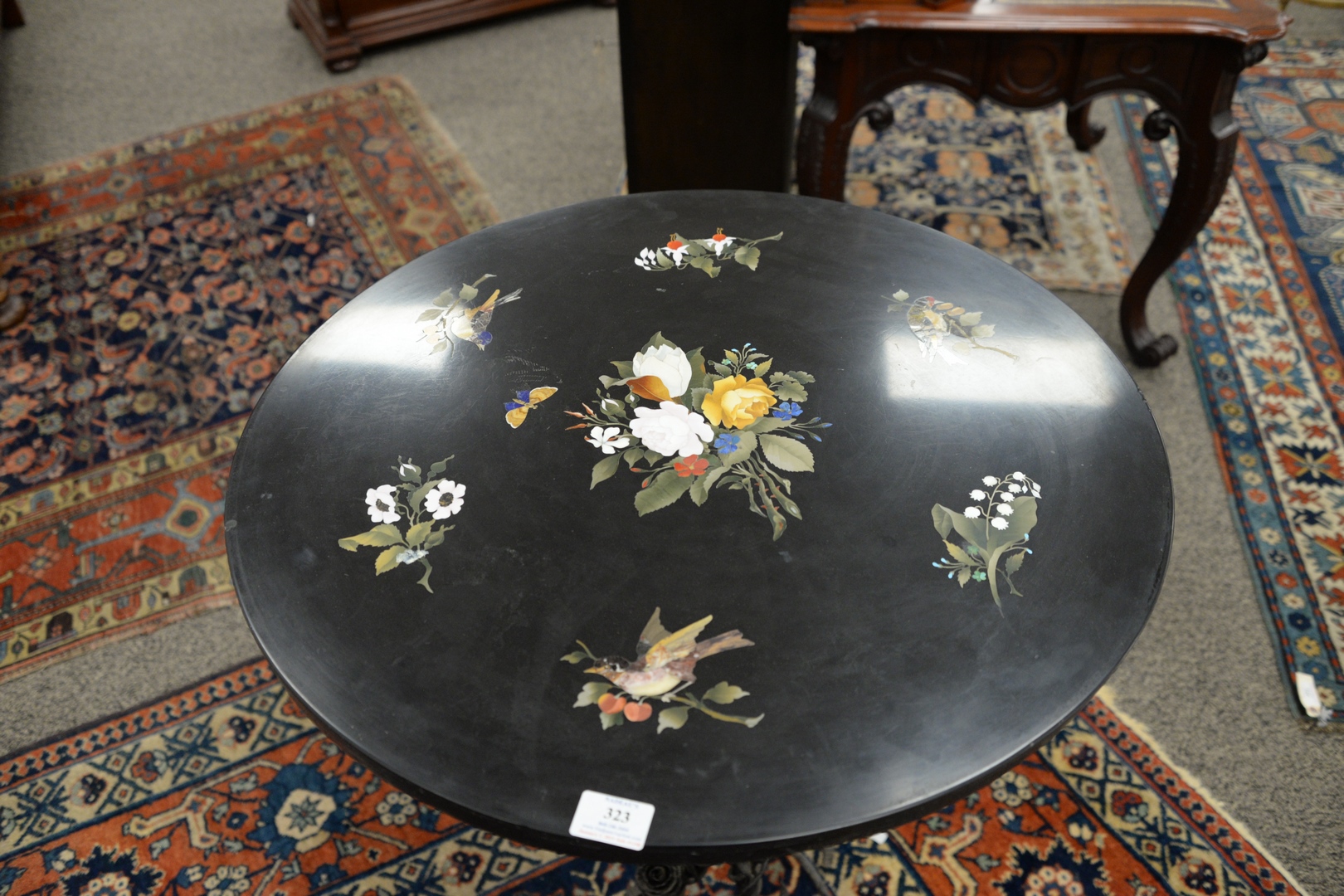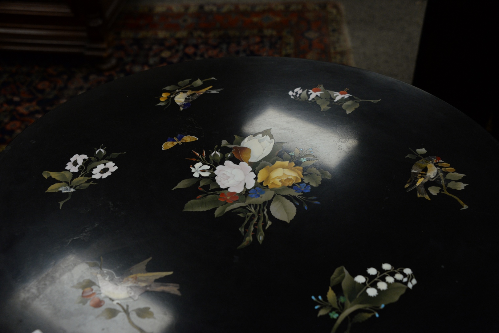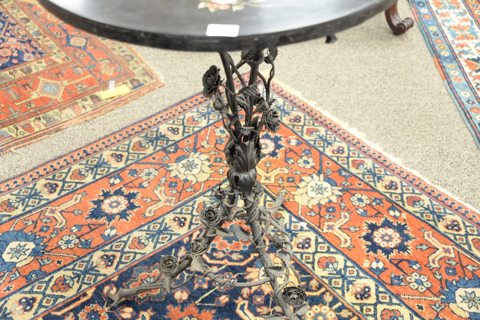 Lot 323: Tall Pietra Dura Top Table having Victorian iron base, top inlaid with birds and flowers height 37 inches, diameter 26 inches Proven…