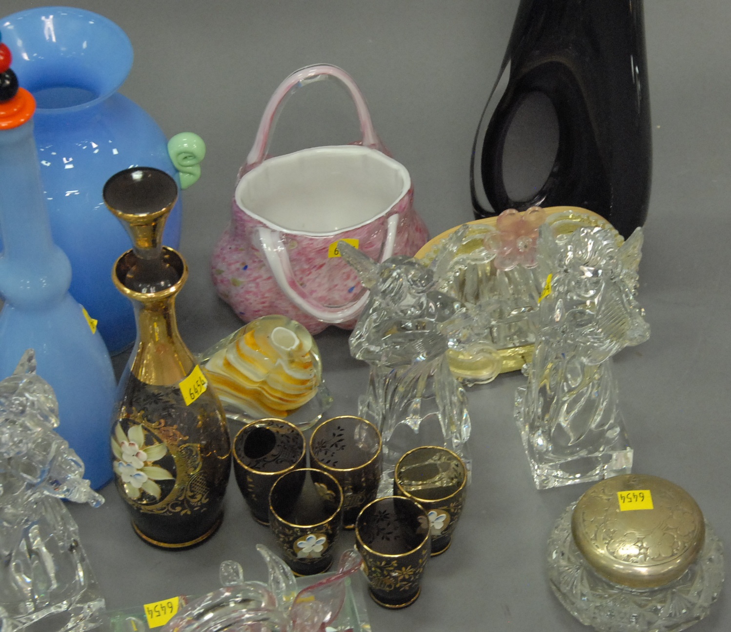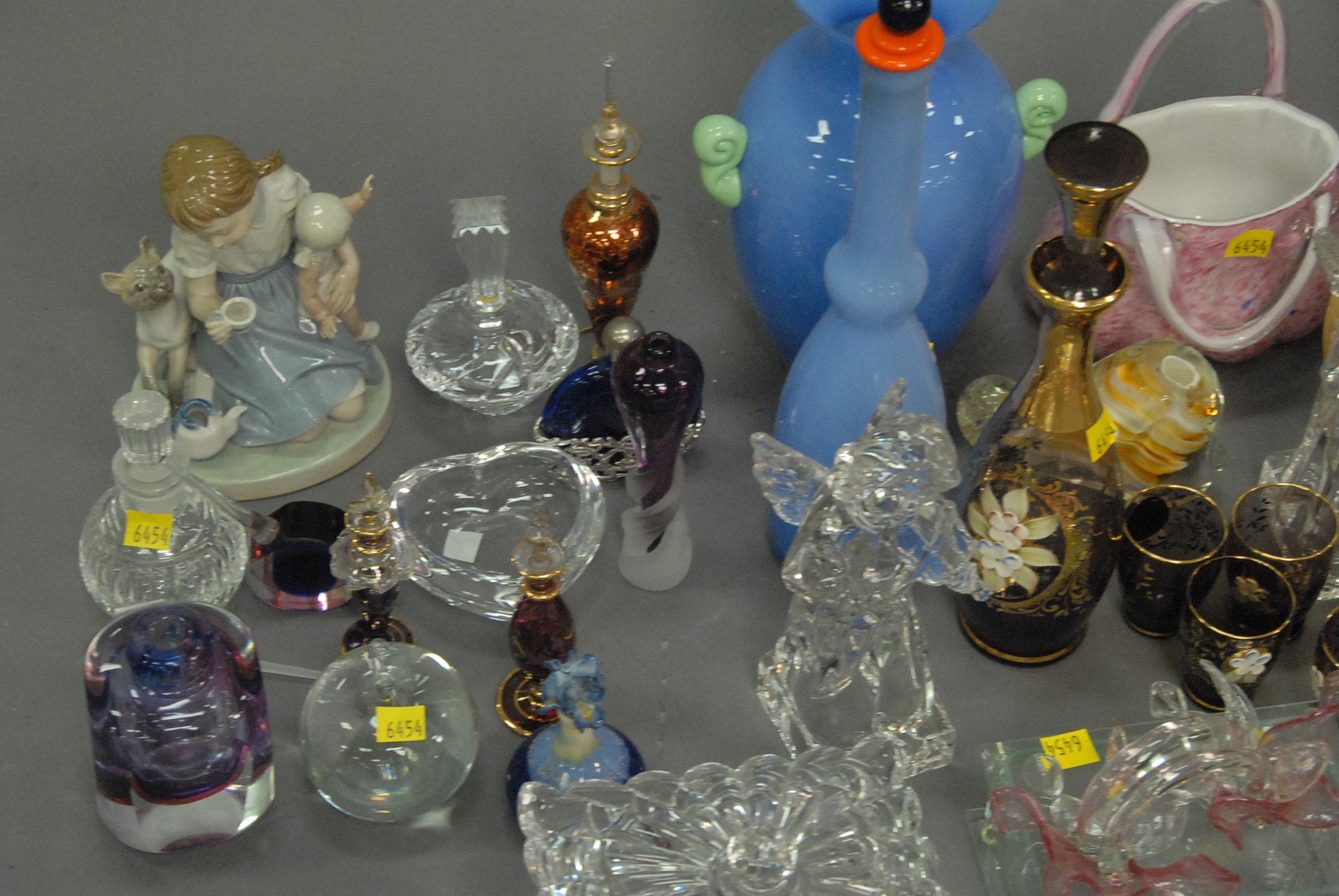 Three box lots perfume bottles, decanters, Lladro figure, crystal, three angel figures, glass box, etc.