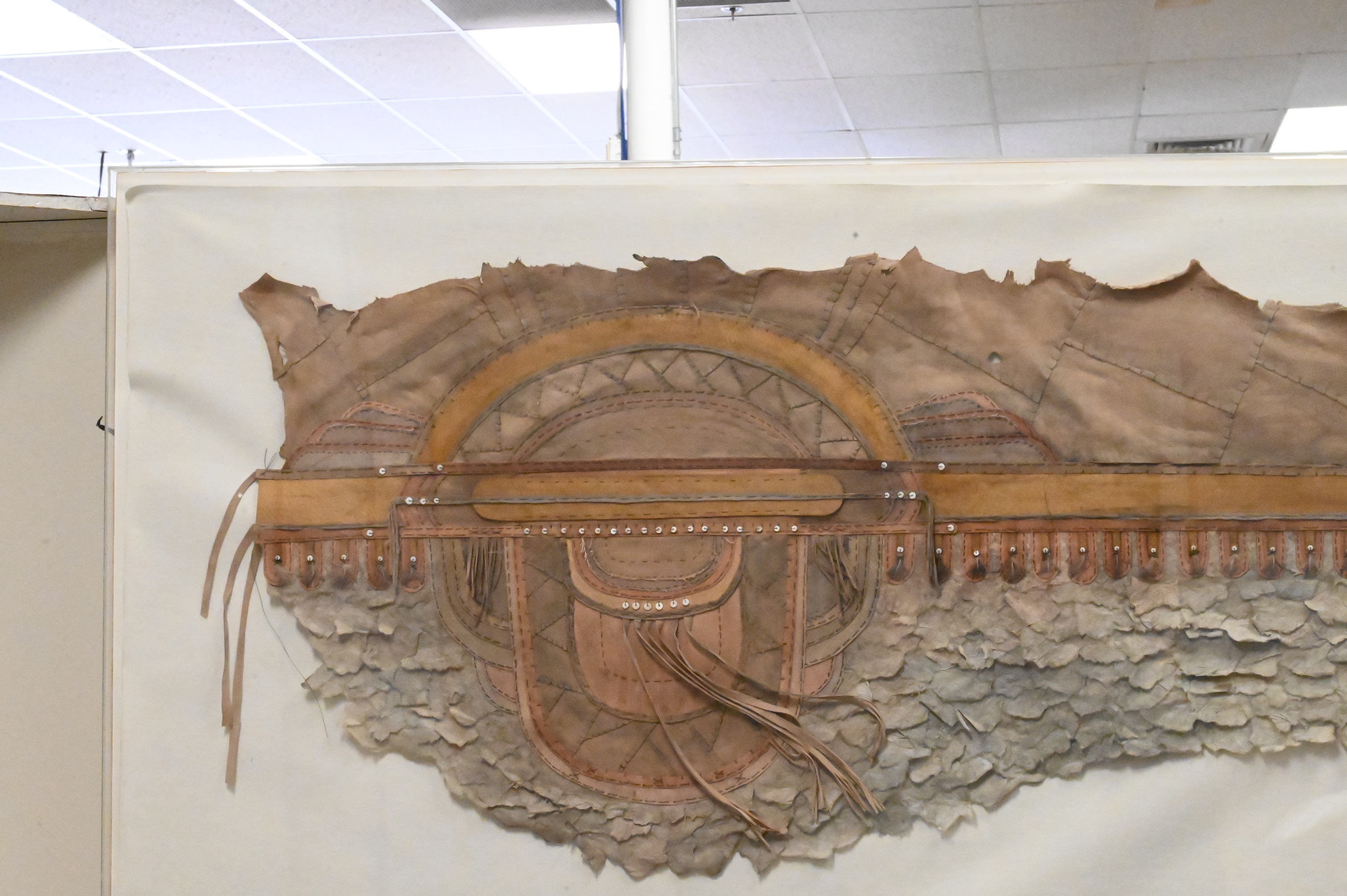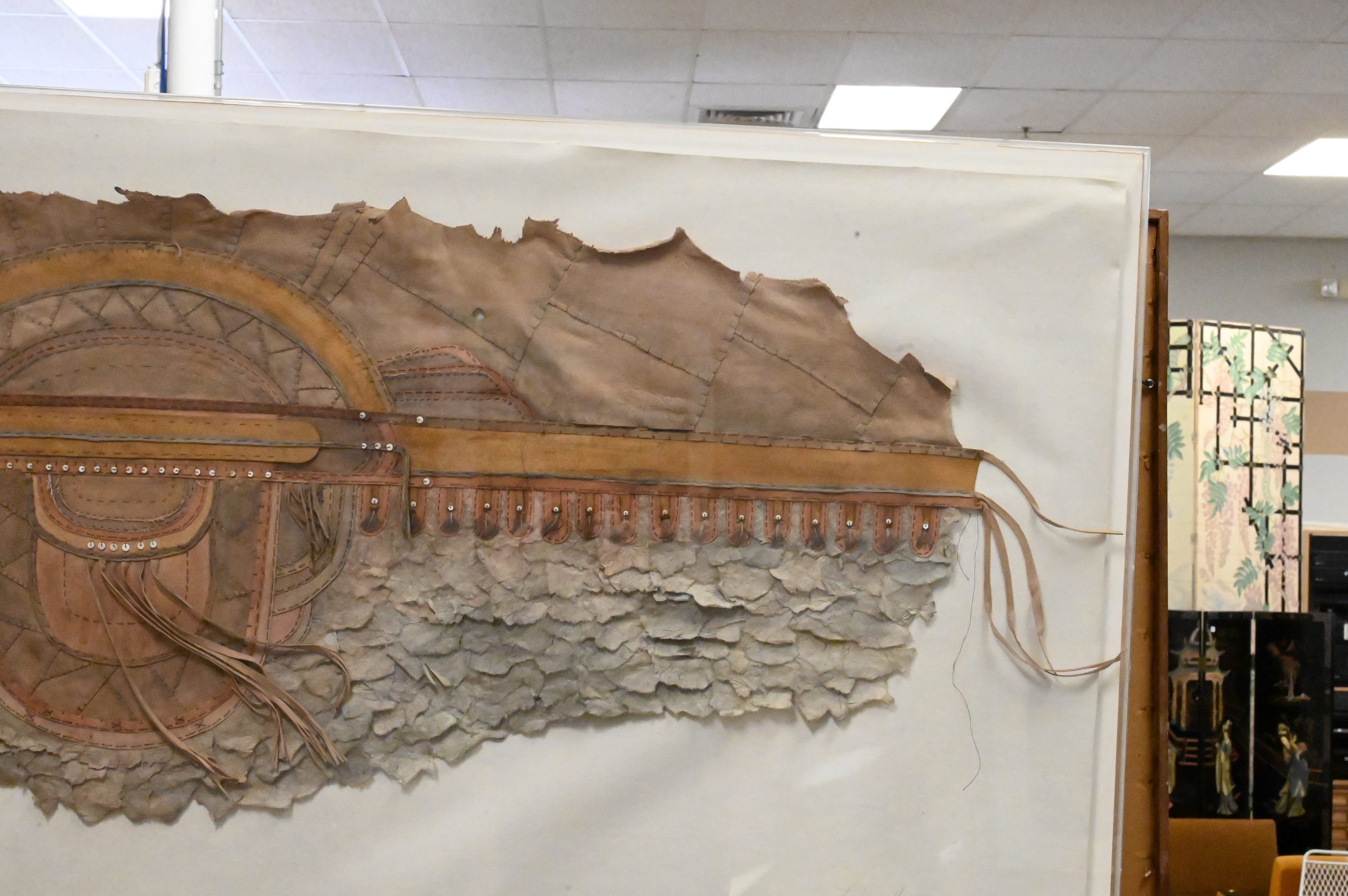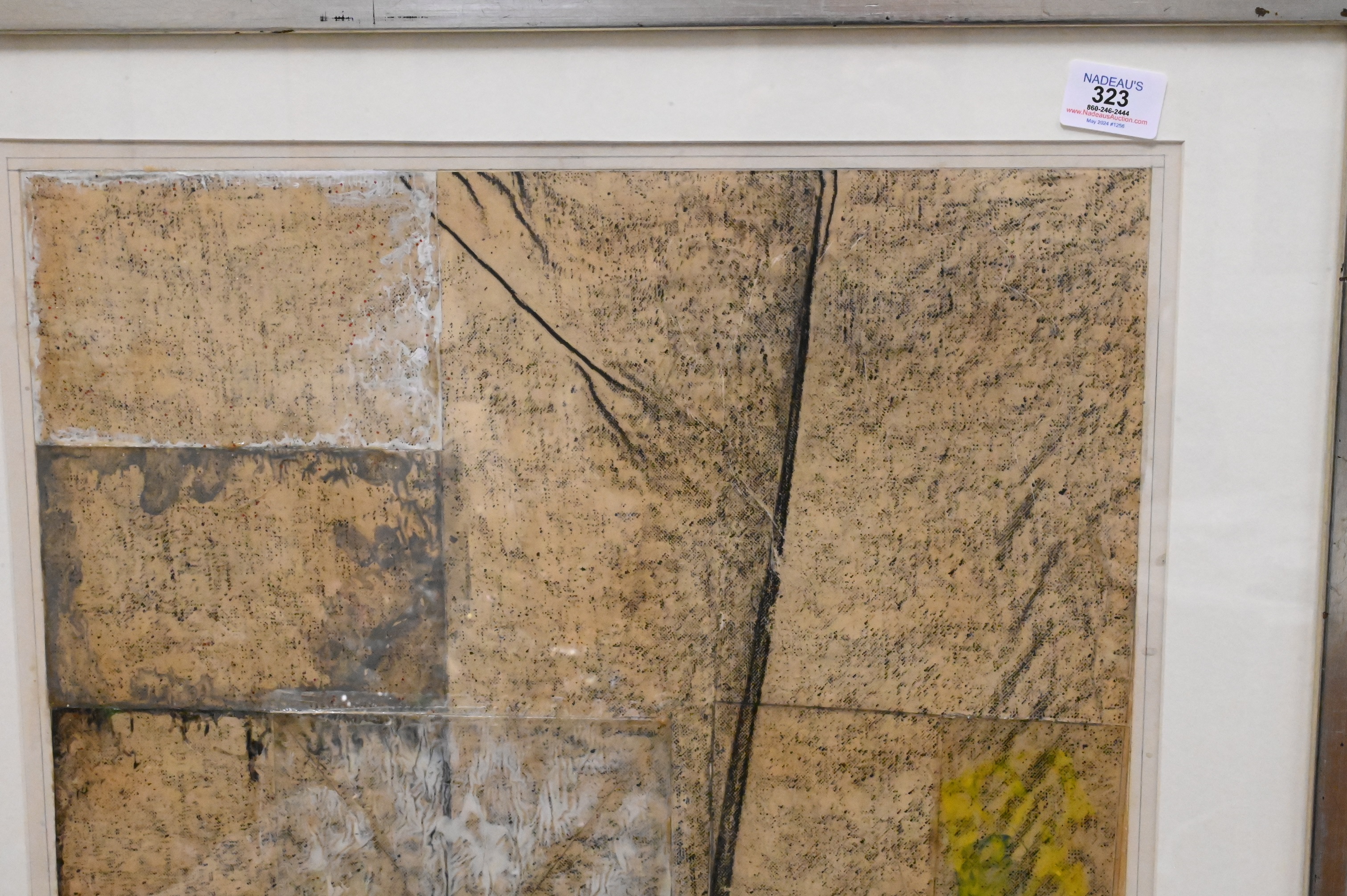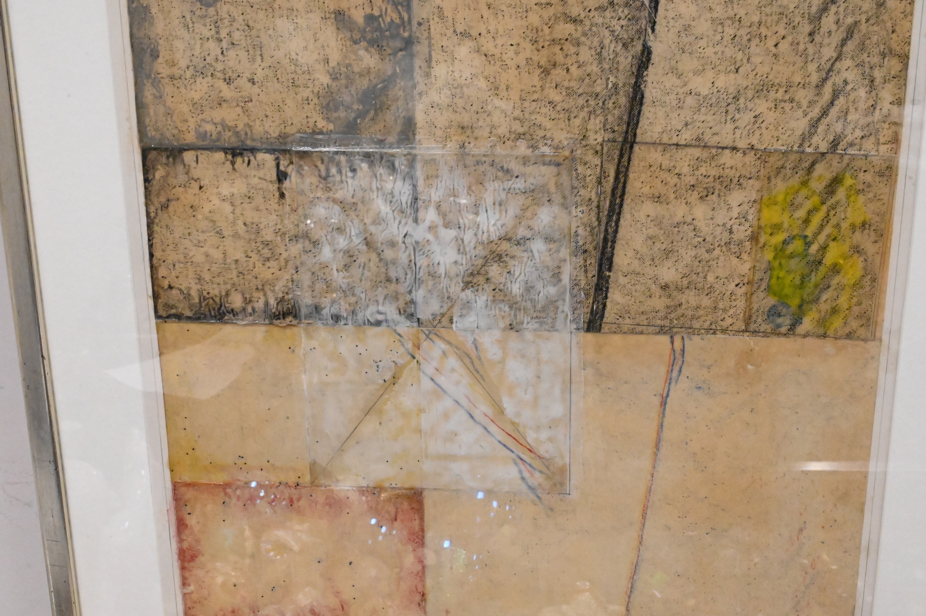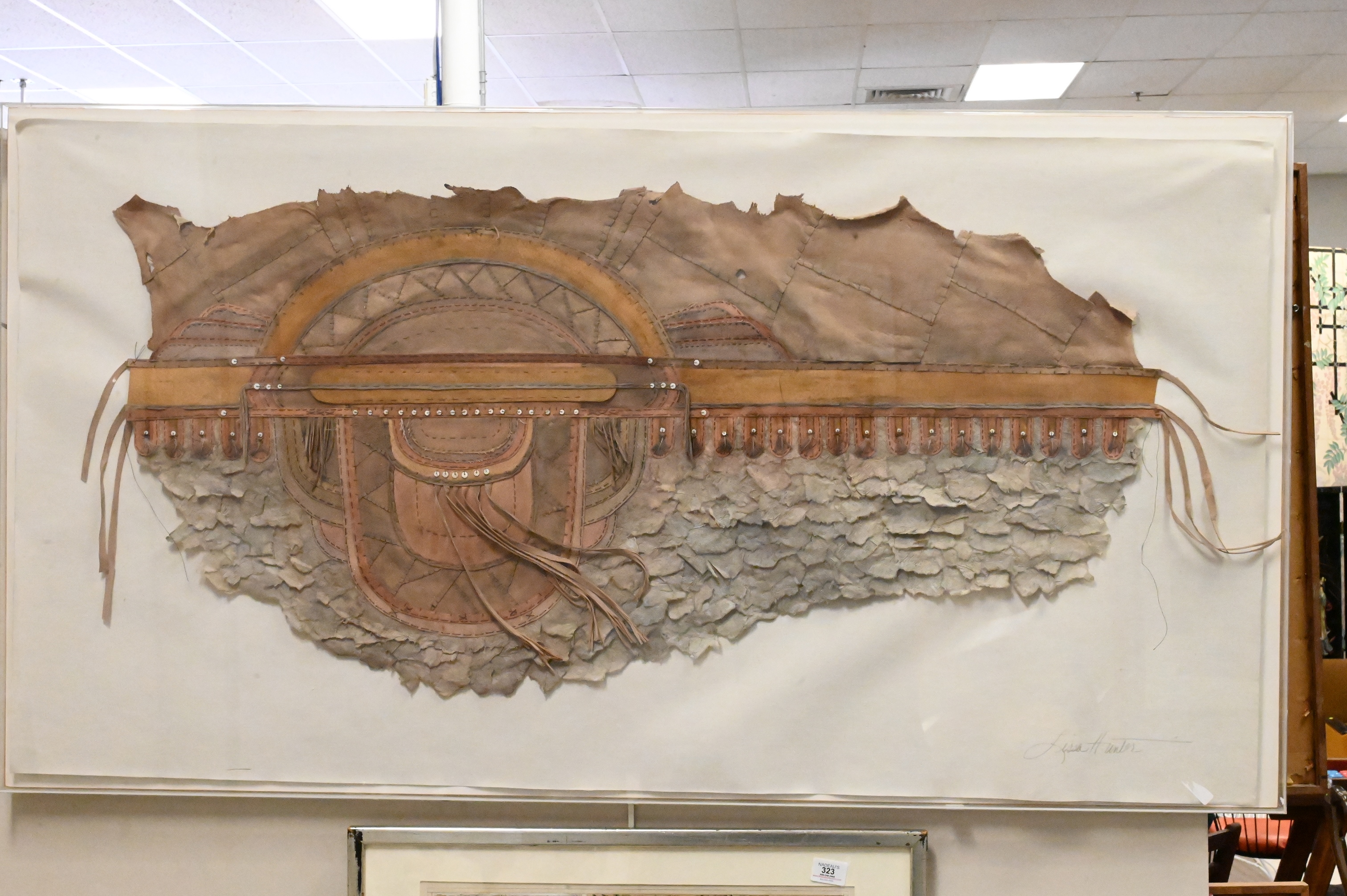 Mixed media on canvas (handmade paper, thread, leather, feathers)