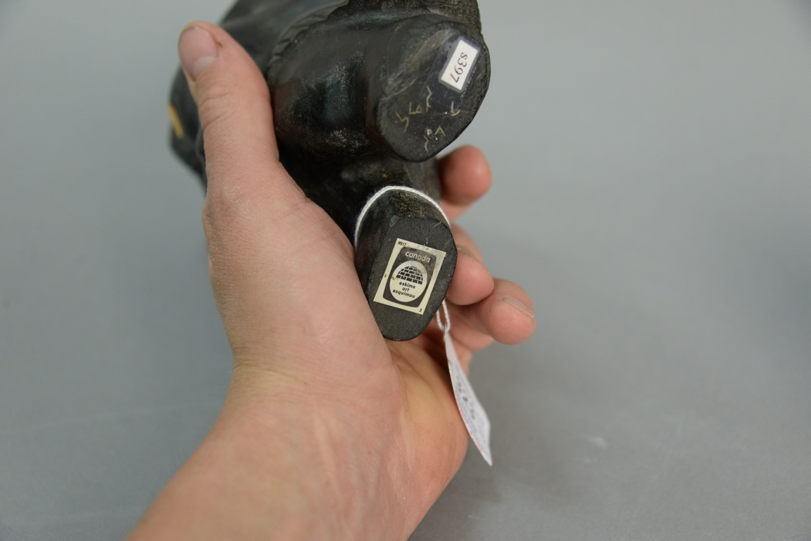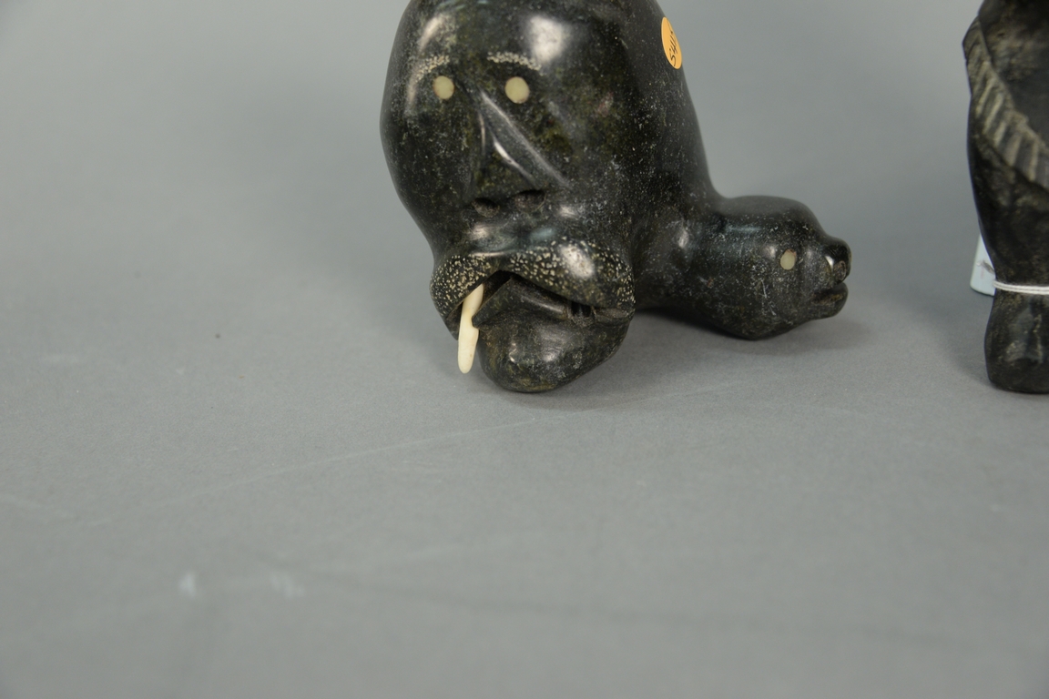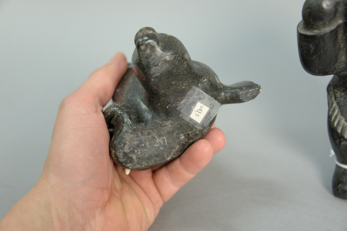 Lot 323: Two Inuit Eskimo figural carvings including Thomas Suvaaraq 1935 Baker Lake Inuit Woman 7 x 4 x 4 1/4 and dark grey basalt Fa…