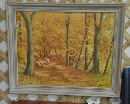 Two piece H. Ohlwein lot to include oil on canvas of landscape with hay stacks signed lower left H. Ohlwein, 27 x 38 and oil on canvas of fall dirt road signed lower right H. Ohlwein, 22 x 27 1/2.