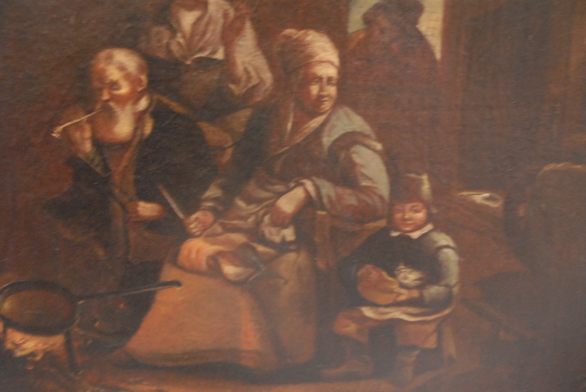 Unsigned FAMILY AT FIREPLACE oil on canvas restretched and relined 24 1/2 x 21