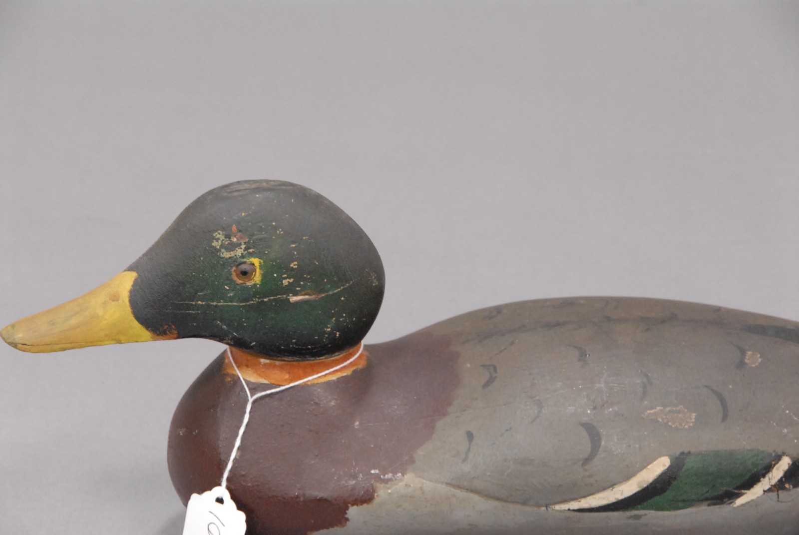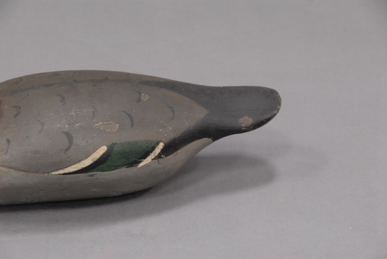 Duck decoy with original paint and glass eyes, repaired at neck.