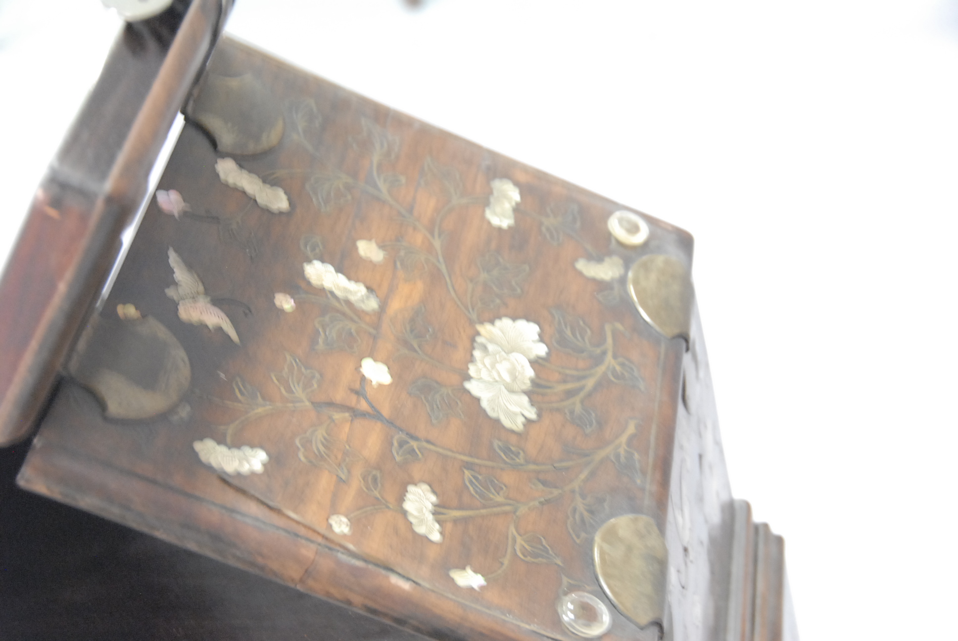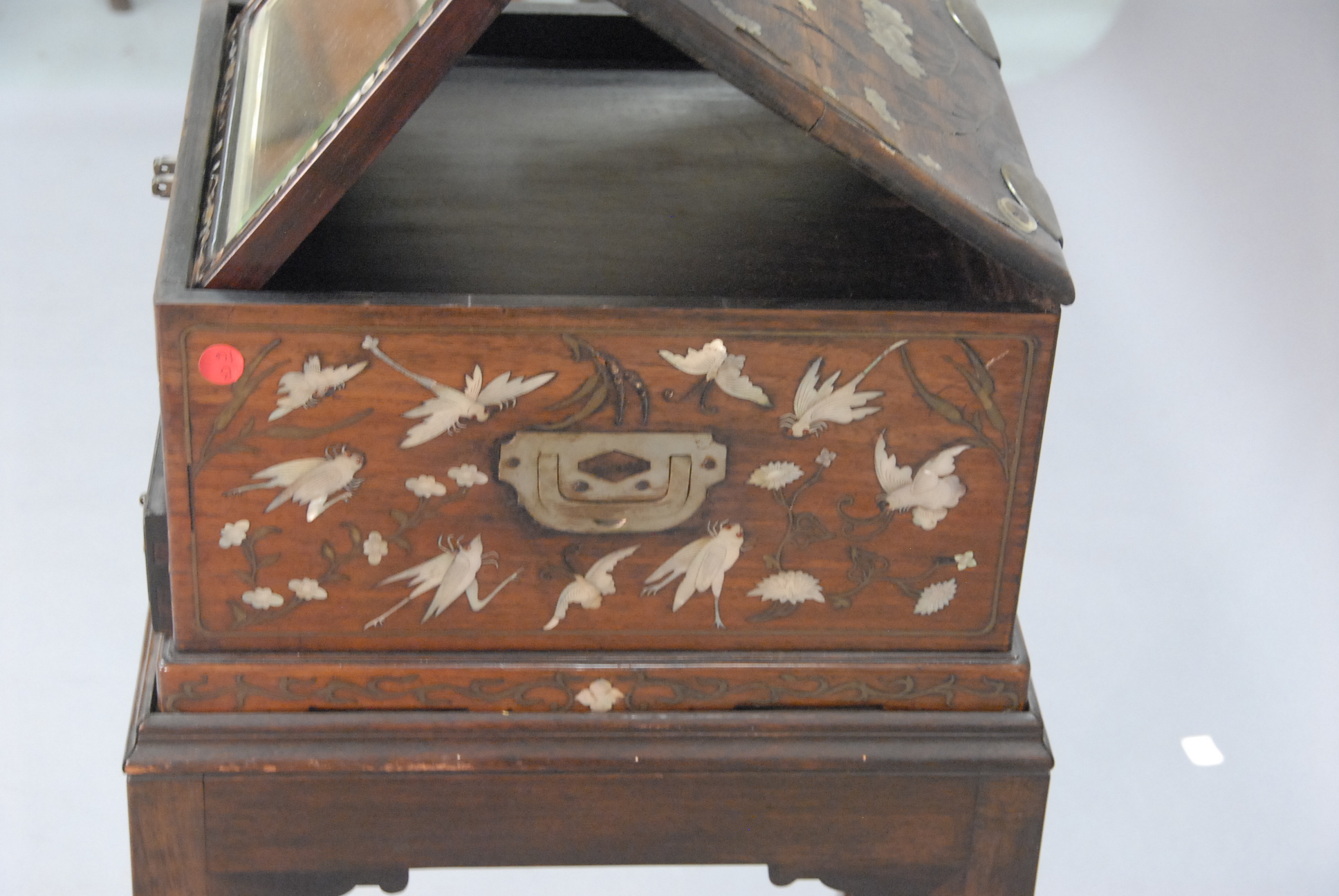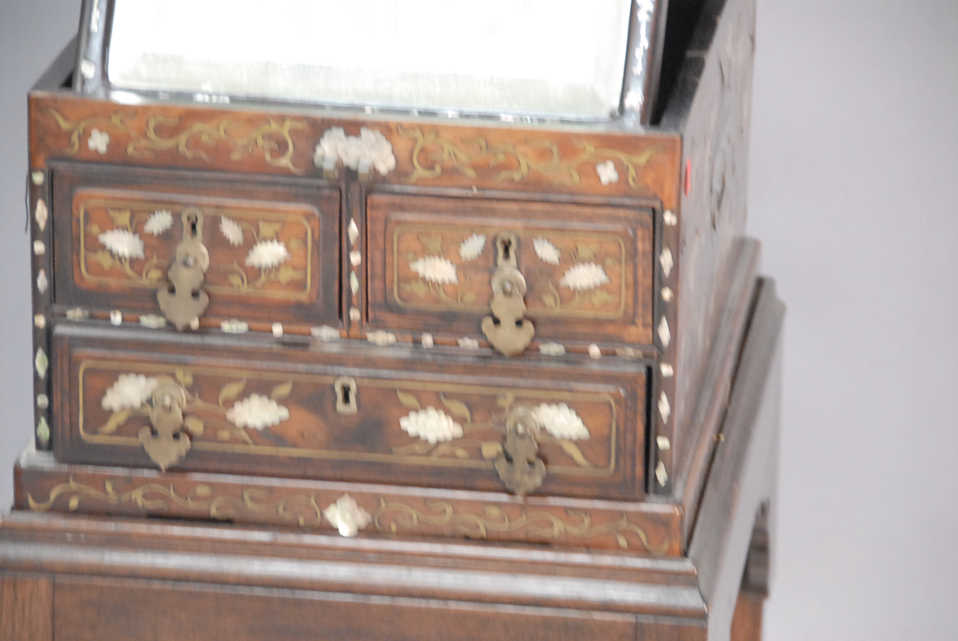 Small mother of pearl and brass inlaid three drawer stand with flip up mirror having mother of pearl fish and flower.