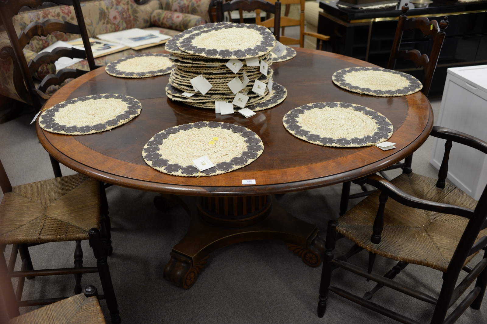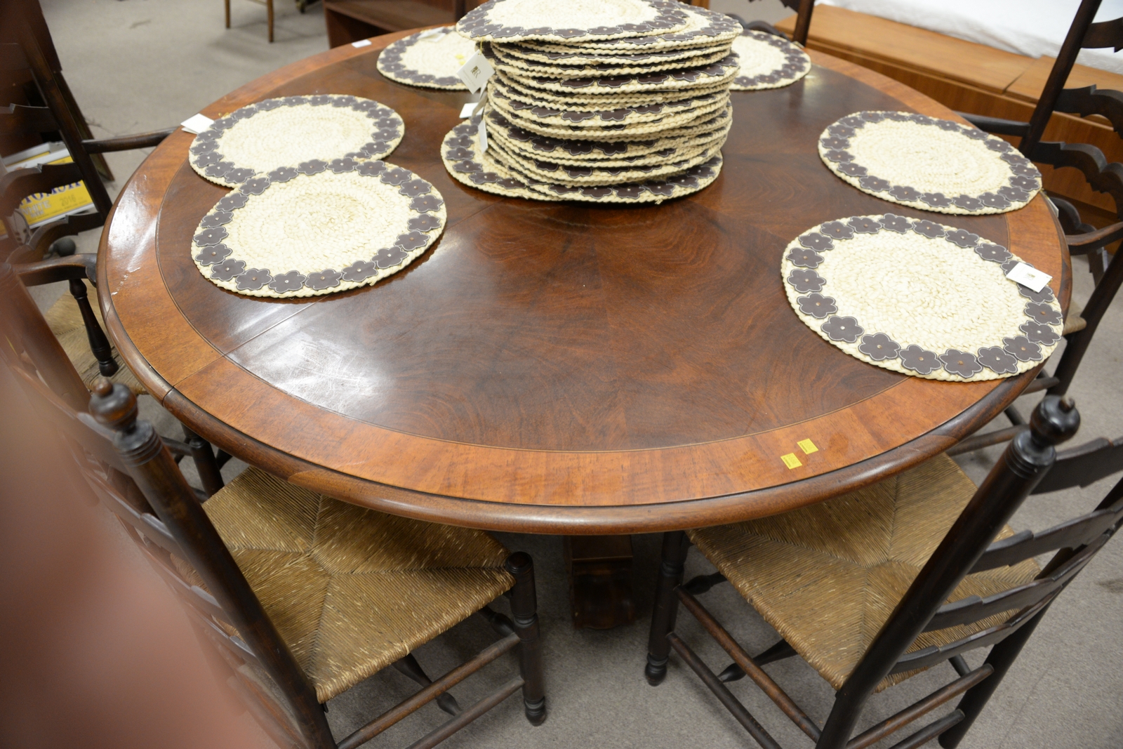 Lot 324: Custom mahogany round pedestal table with banded inlaid top and one extra leaf. ht. 30in., dia. 63in.