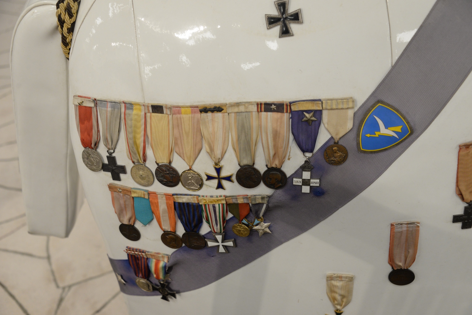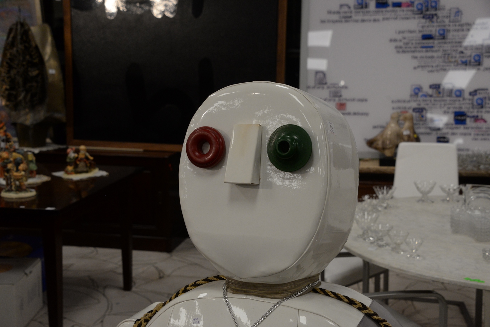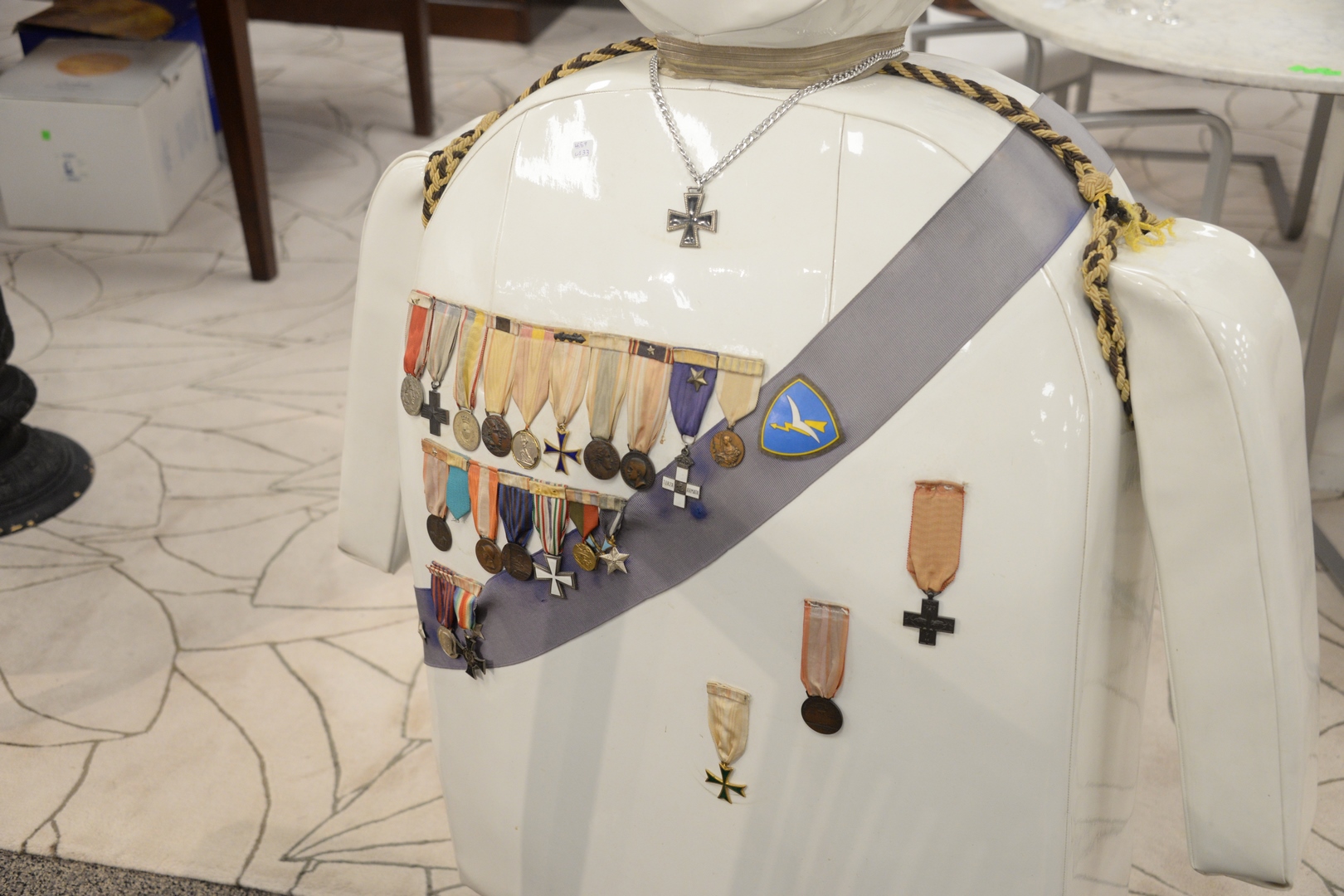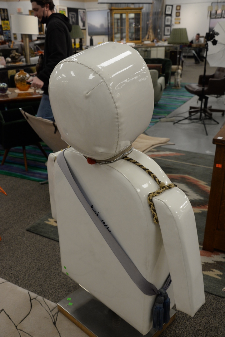 Lot 324: Enrico Baj (Italian, 1924 – 2003), Punching General, 1969, stuffed vinyl punching bag with army metals, signed and numbered ’10/10′ on the reverse, height 57 inches, width 33 inches.