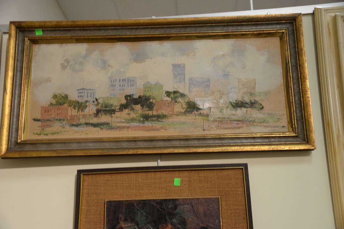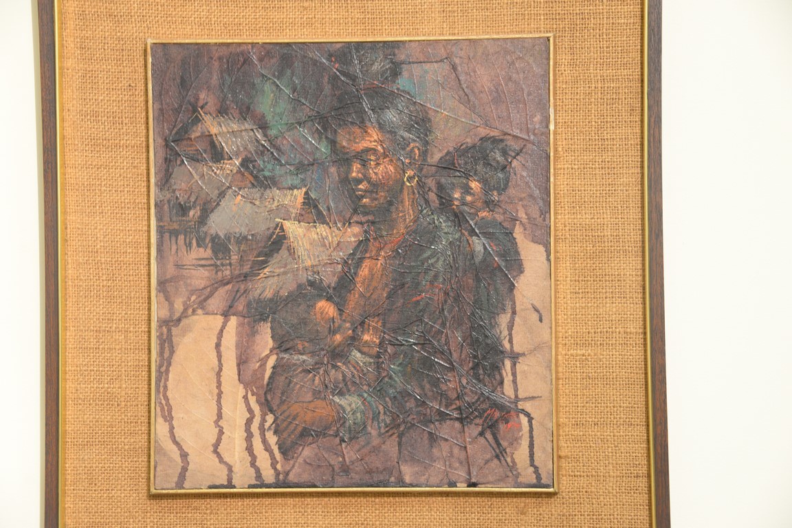 Five Mid-Century Modern paintings including Ella D. Crampton, oil on canvas, Seascape an oil on board landscape, signed Sam Joe Dot Art, oil on canvas Maitree Filipino painting on leaves and Picture of the Black 1934 signed illegibly on verso, 13 3/4 x 12 1/4 to 13 x 30 3/4 Provenance: Estate of Arthur C. Pinto, MD