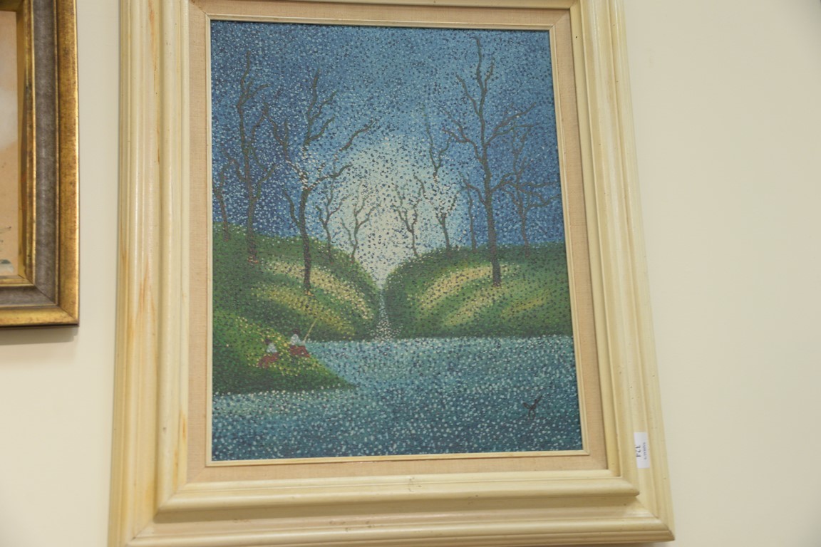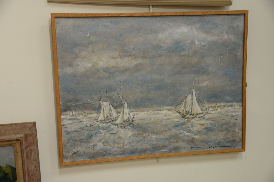 Lot 324: Five Mid-Century Modern paintings including Ella D. Crampton, oil on canvas, Seascape an oil on board landscape, signed Sam Joe Do…