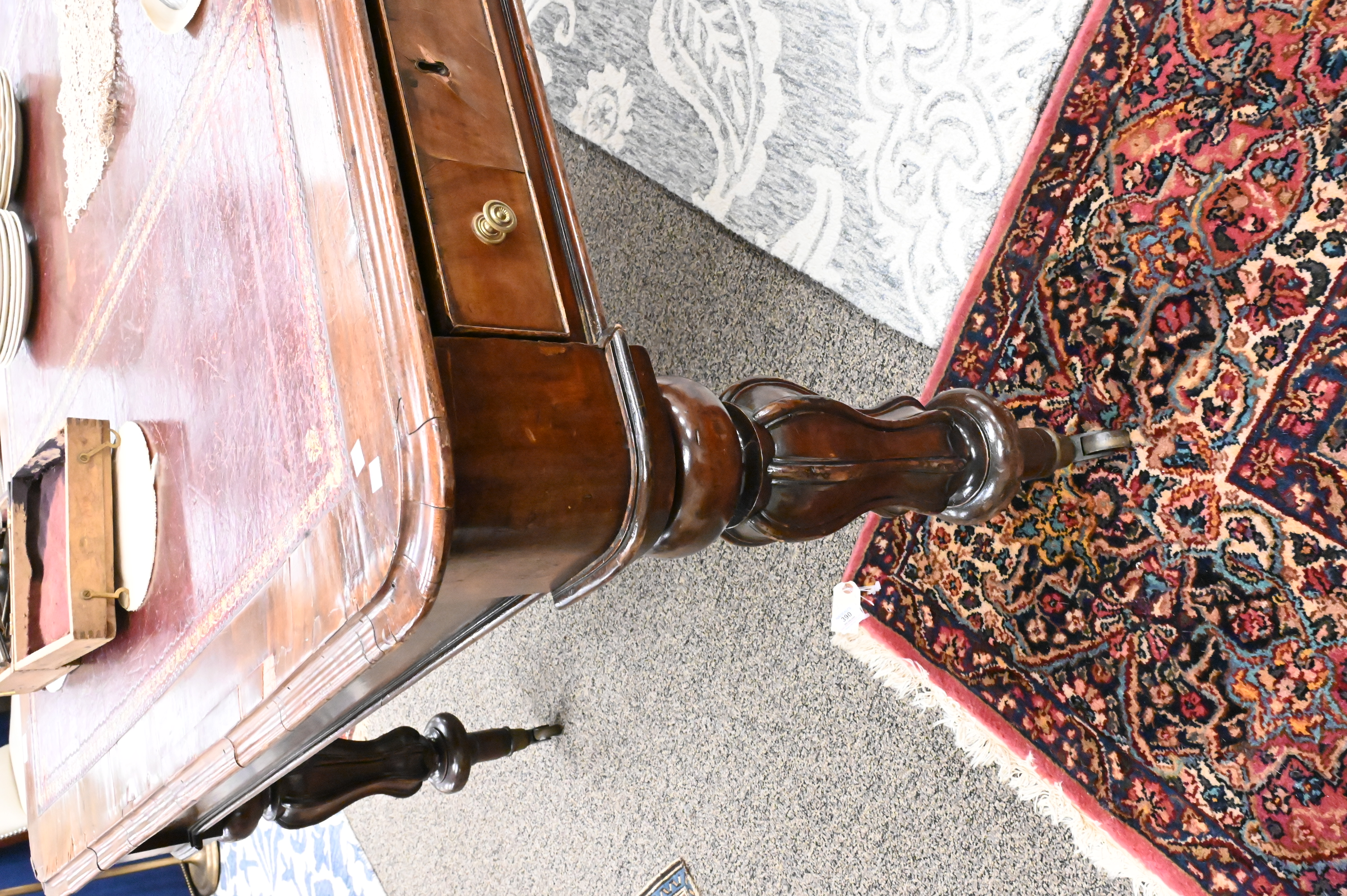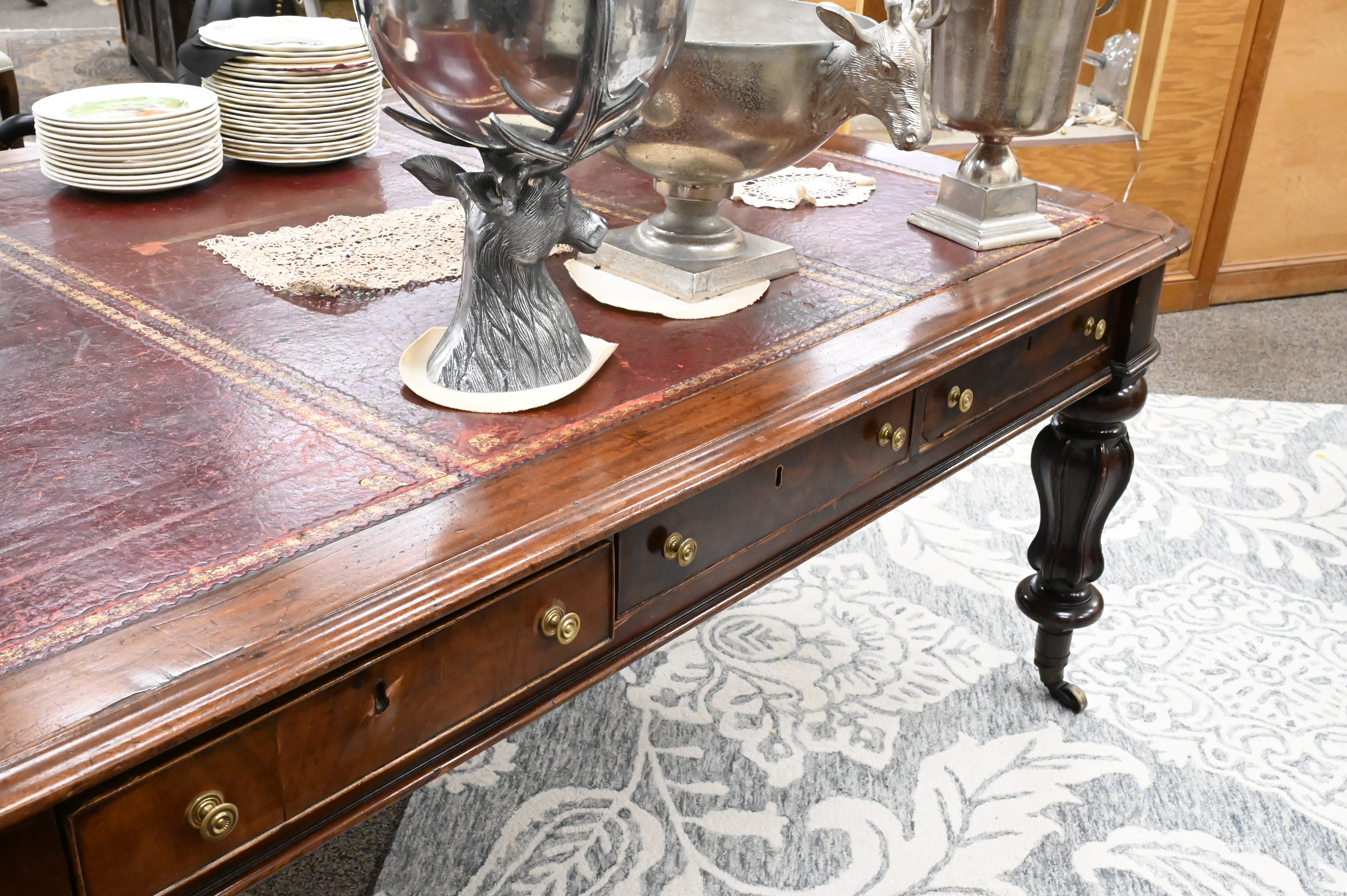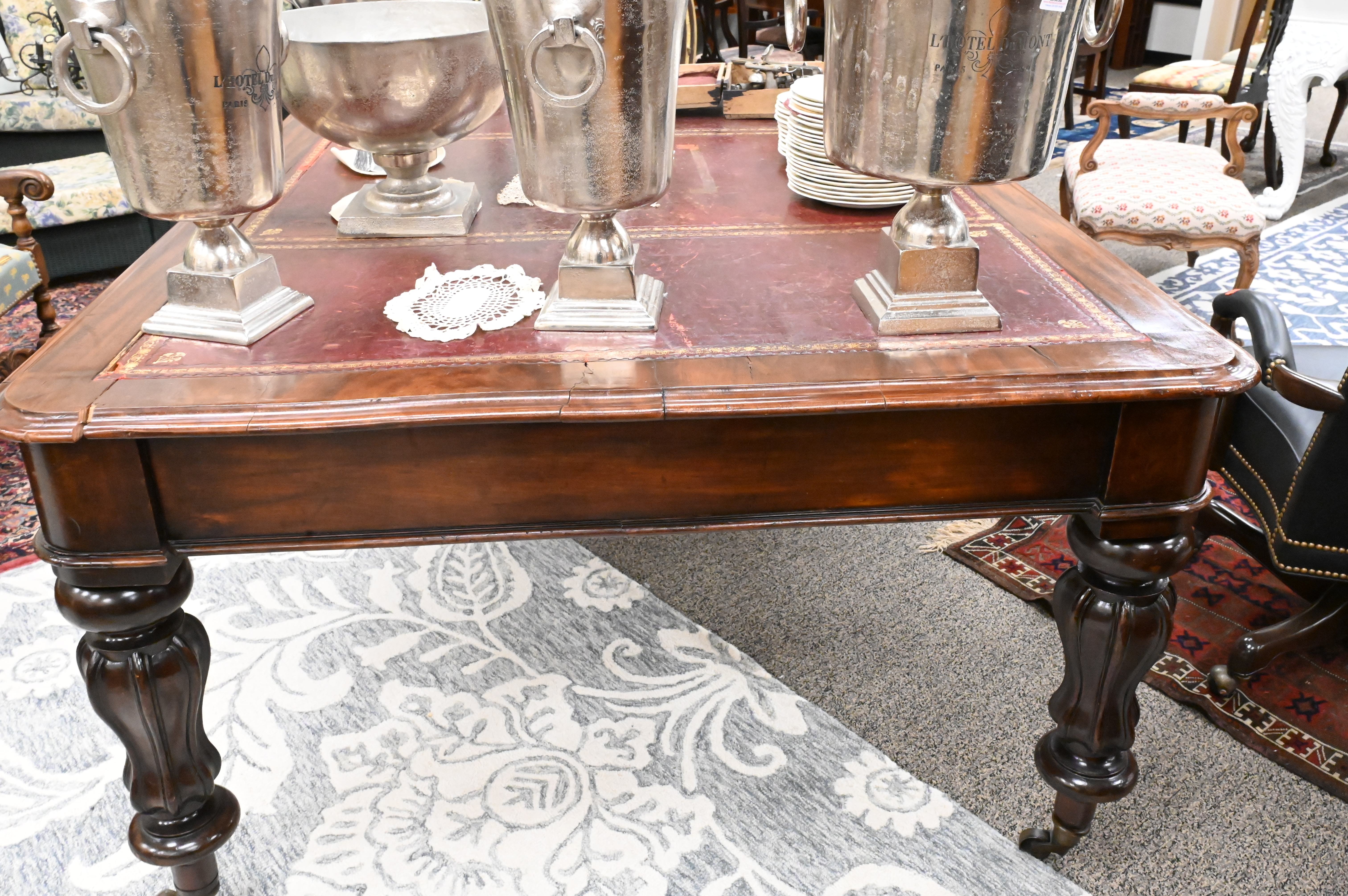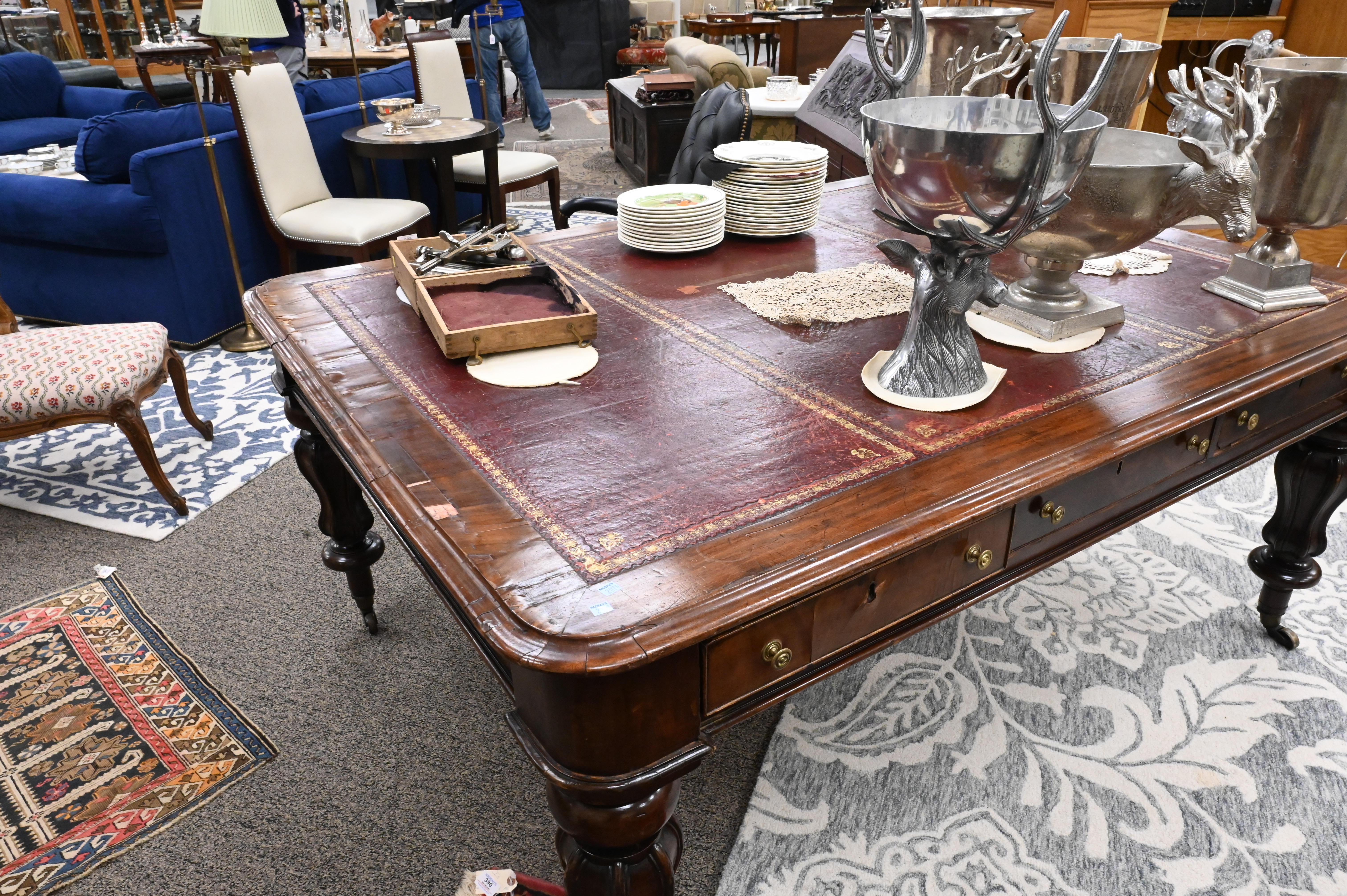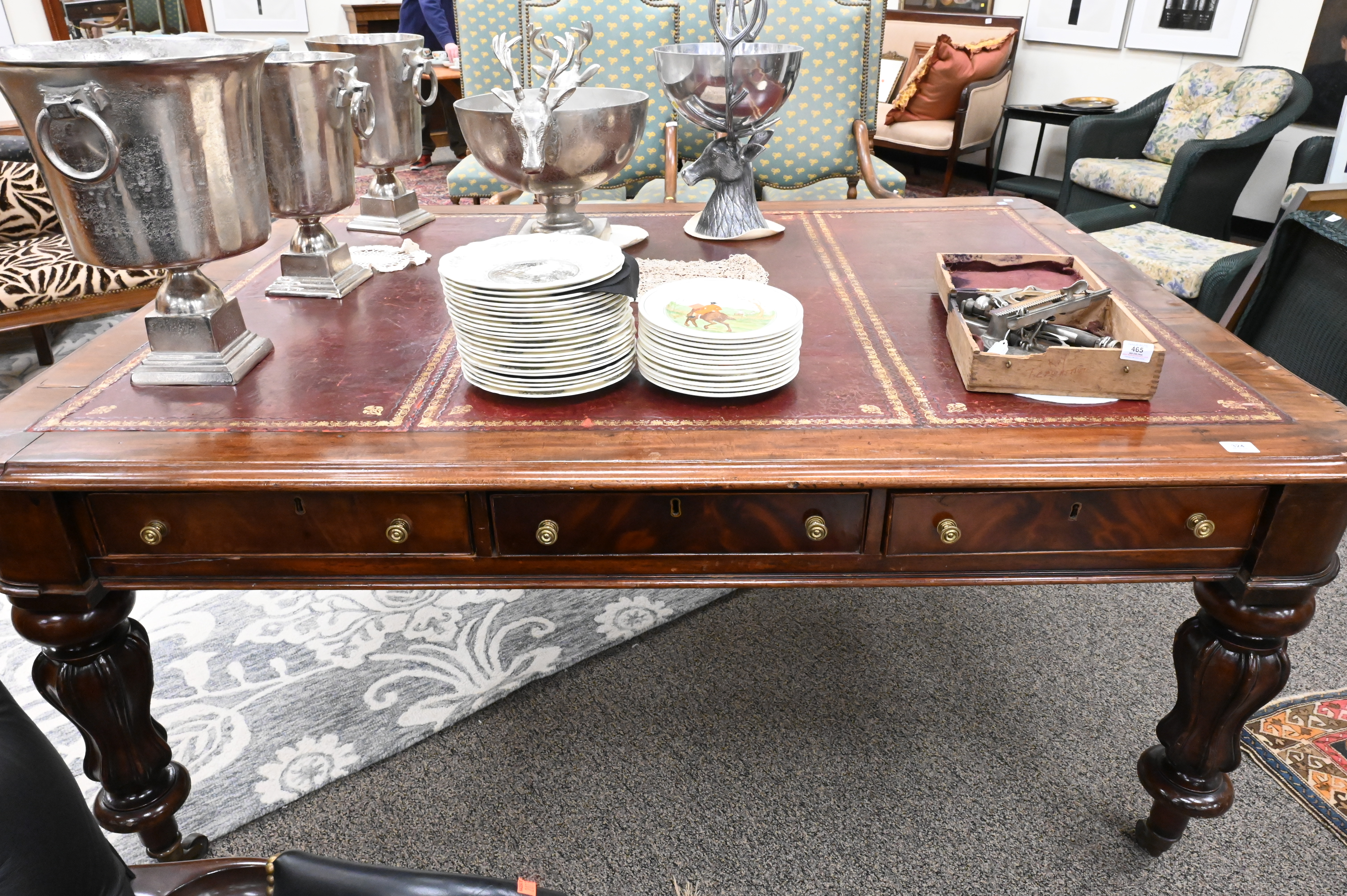 George III Mahogany Partners Library Table, having tooled leather top, three drawers on either side, on turned legs, circa 1840, top with veneer chips, height 31 1/2 inches, top 55″ x 72 1/2″.