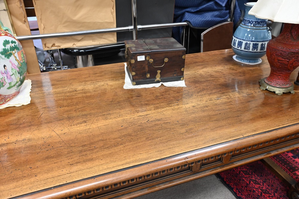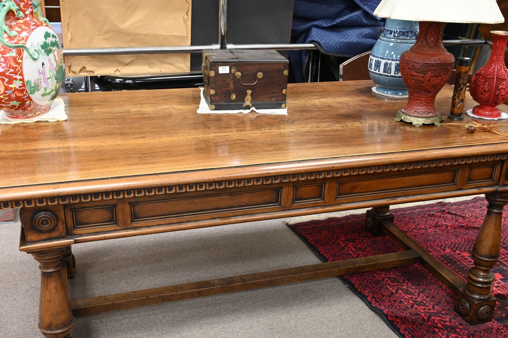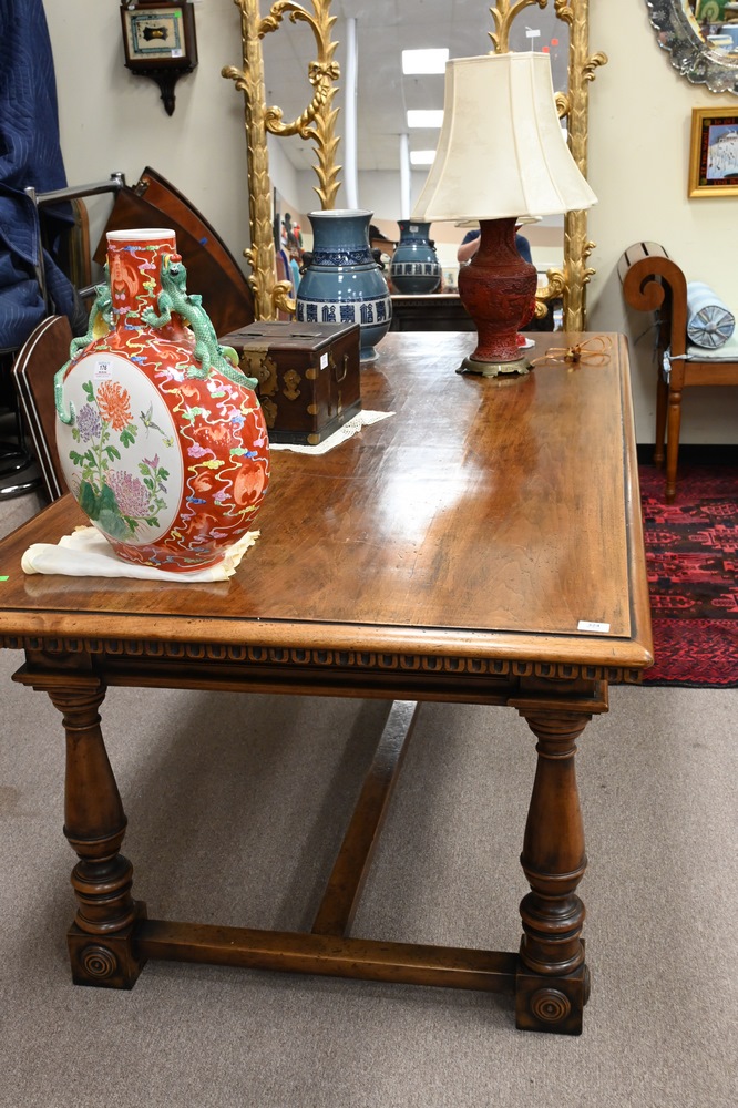 Lot 324: Large Walnut Library Table, having two drawers on turned legs with stretcher base, height 32 inches, top 40 1/2 x 84 inches.