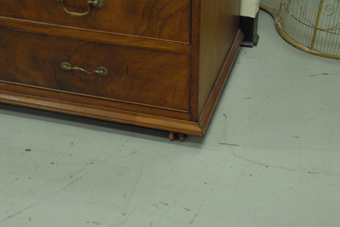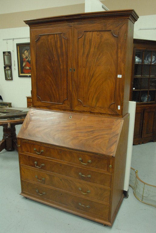 Lot 324: Mahogany secretary desk in two parts, upper section with two doors and expanded back on slant lid desk over four drawers, with door …