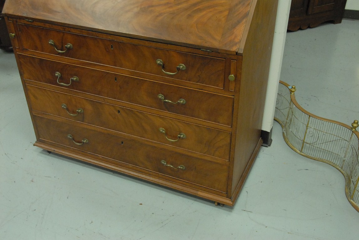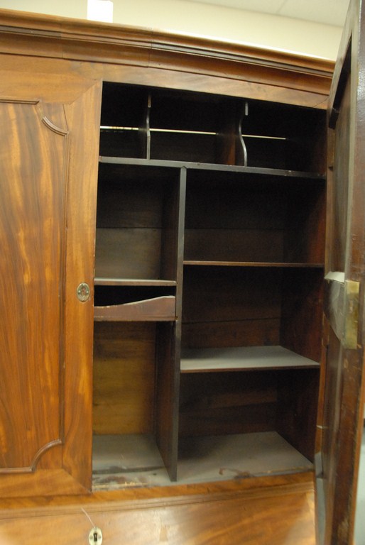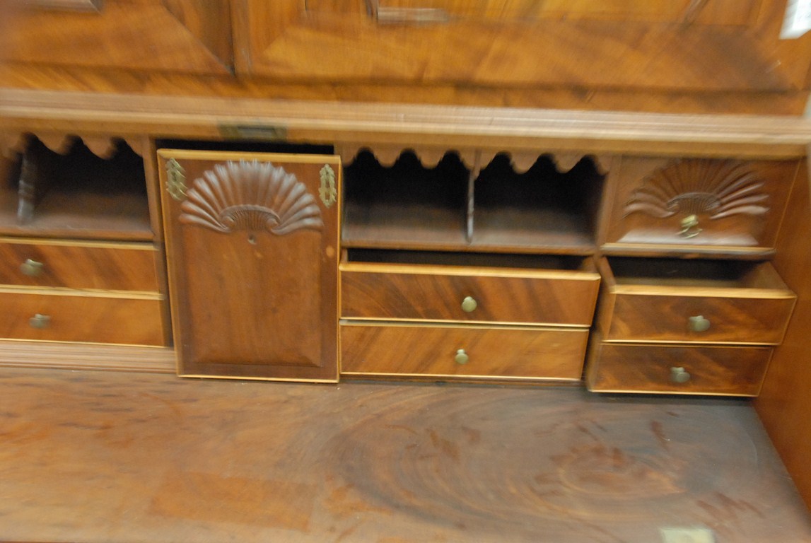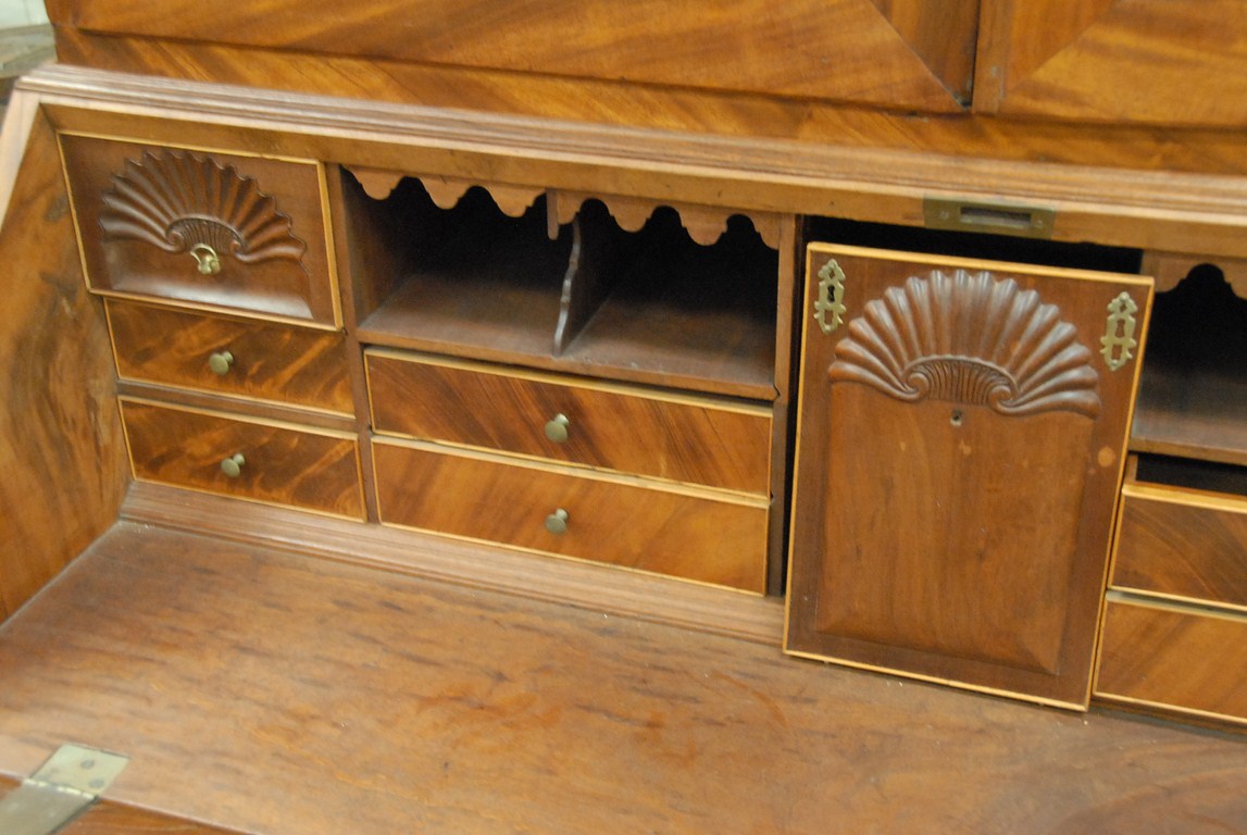 Mahogany secretary desk in two parts, upper section with two doors and expanded back on slant lid desk over four drawers, with door and drawers and three shell carvings in the manner of Colchester – Norwich, all of figured mahogany, pine and cherry secondary woods with original brasses no feet. ht. 84in. wd. 46in. dp. 22in. Being sold to benefit a Connecticut Museum Provenance: Originally was in the Norwich Free Academy Homeaking building. It was in C.P. Hamblens office in the Allis House then in the Teel House.