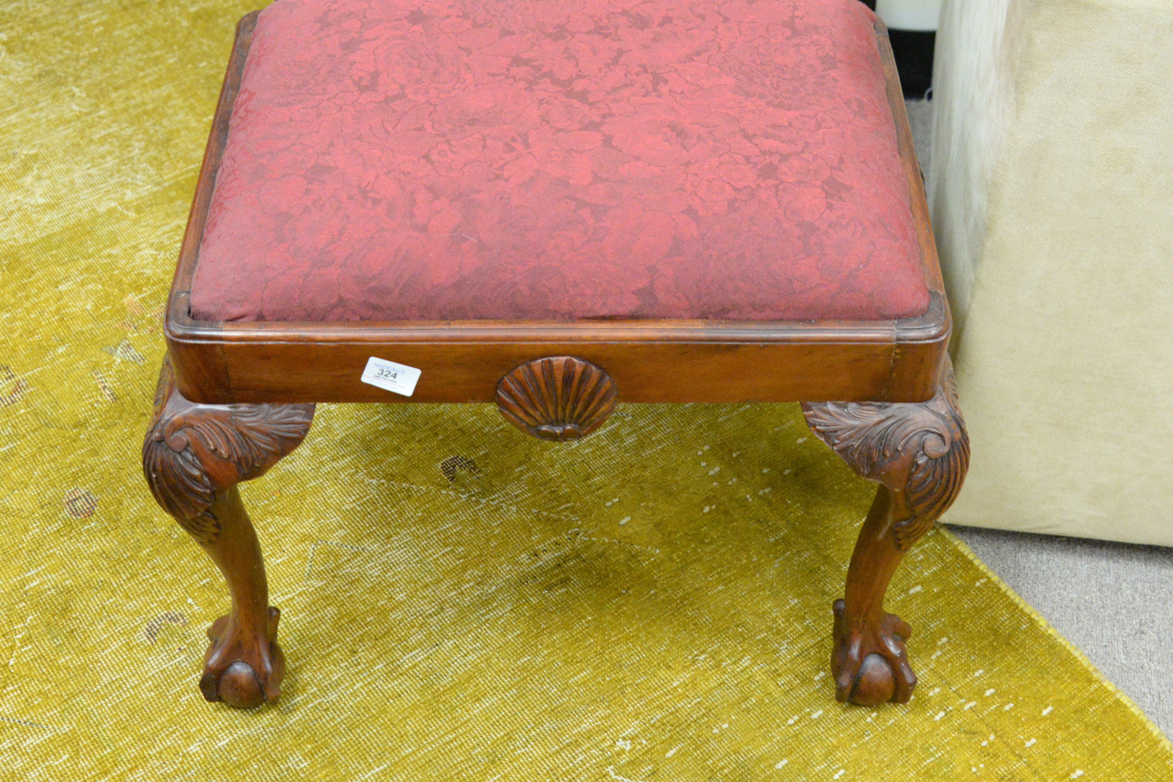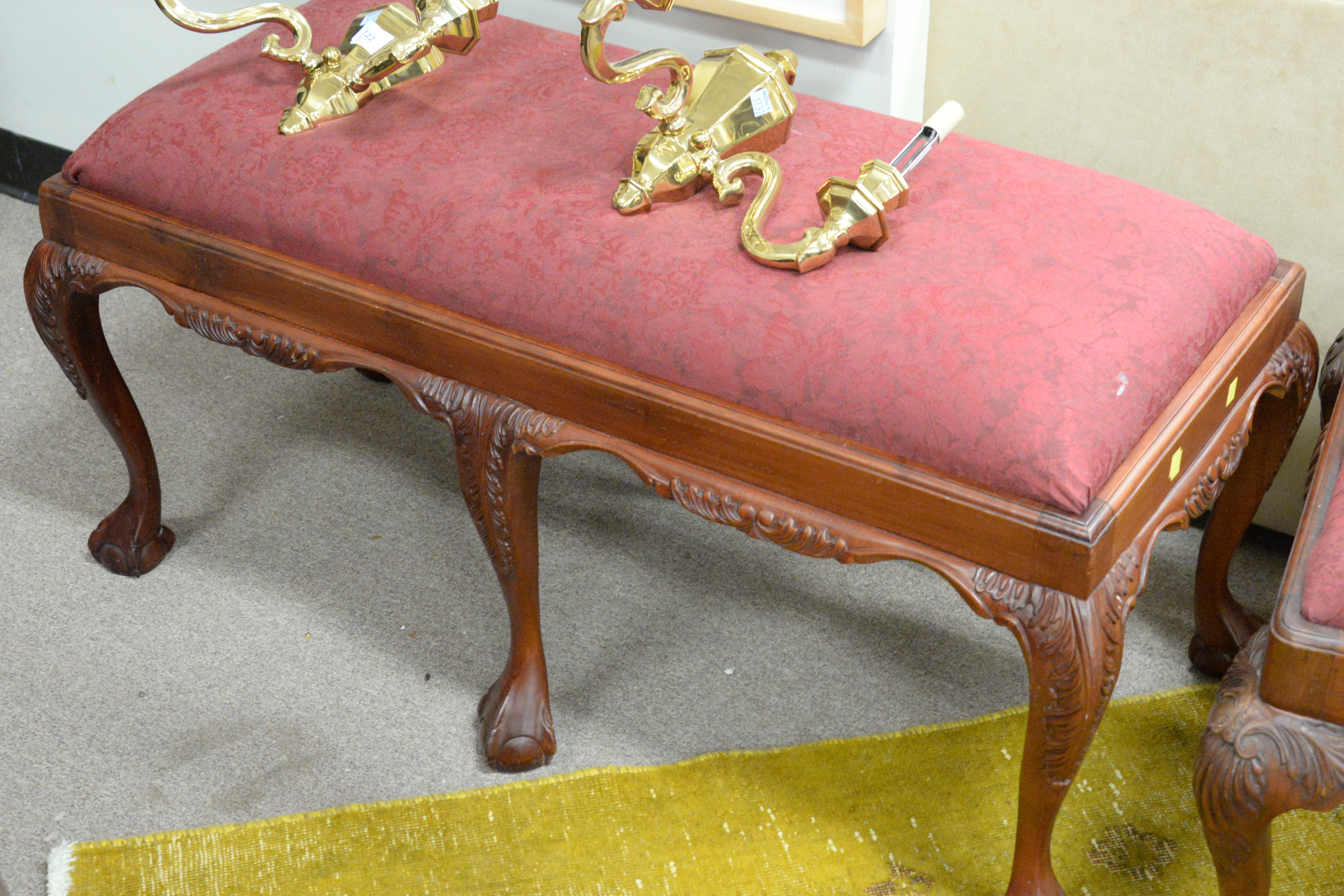 Matching Upholstered Benches, each having carved a frame and ball and claw feet, height of both 19 inches, length of smaller 23 inches, length of larger 42 inches