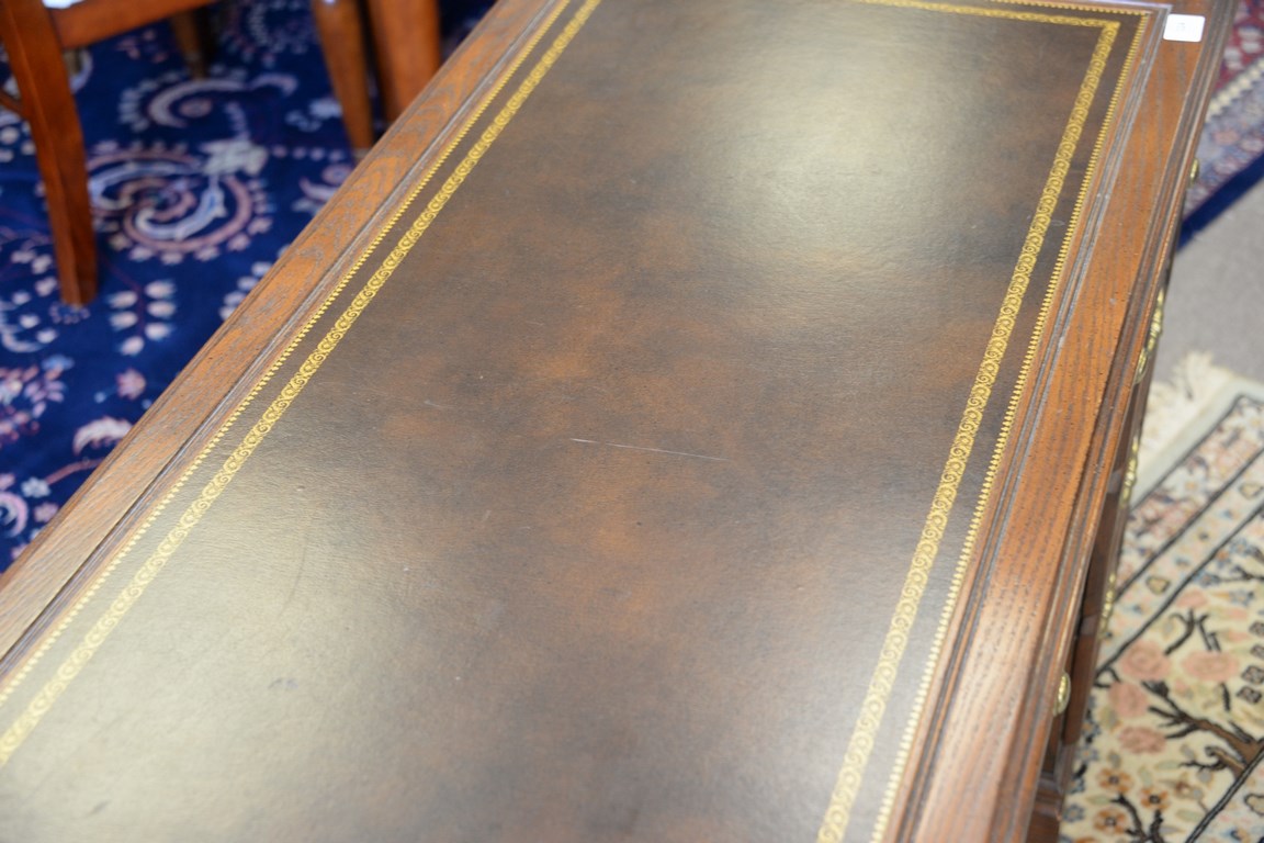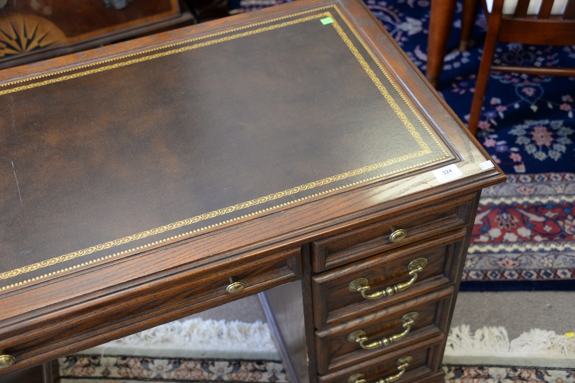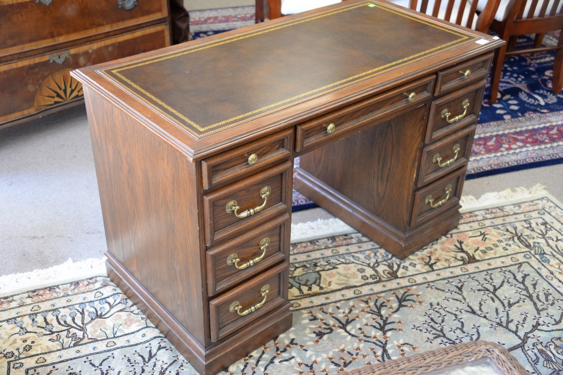 Oak Contemporary leather top desk. ht. 29 in. top: 23 x 46