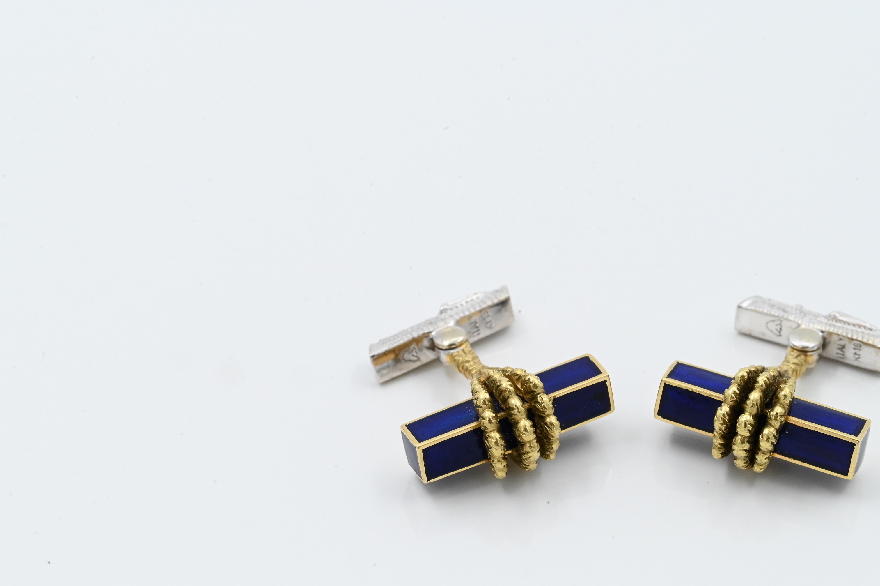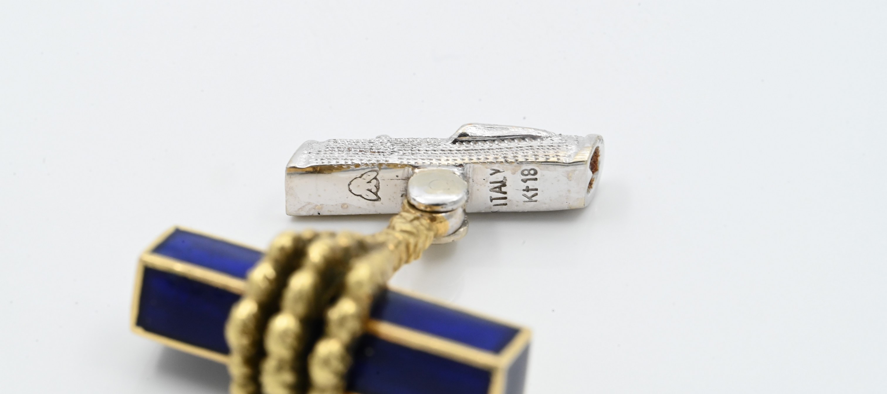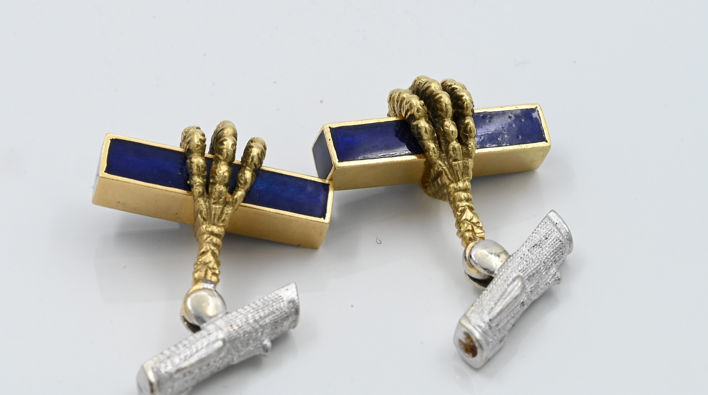 having claw holding blue enameled bar and textured white gold T bar