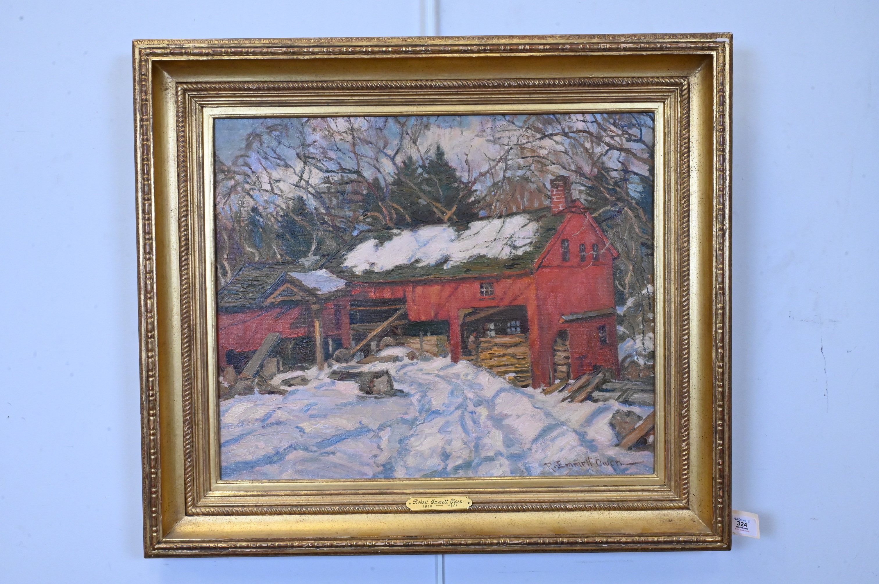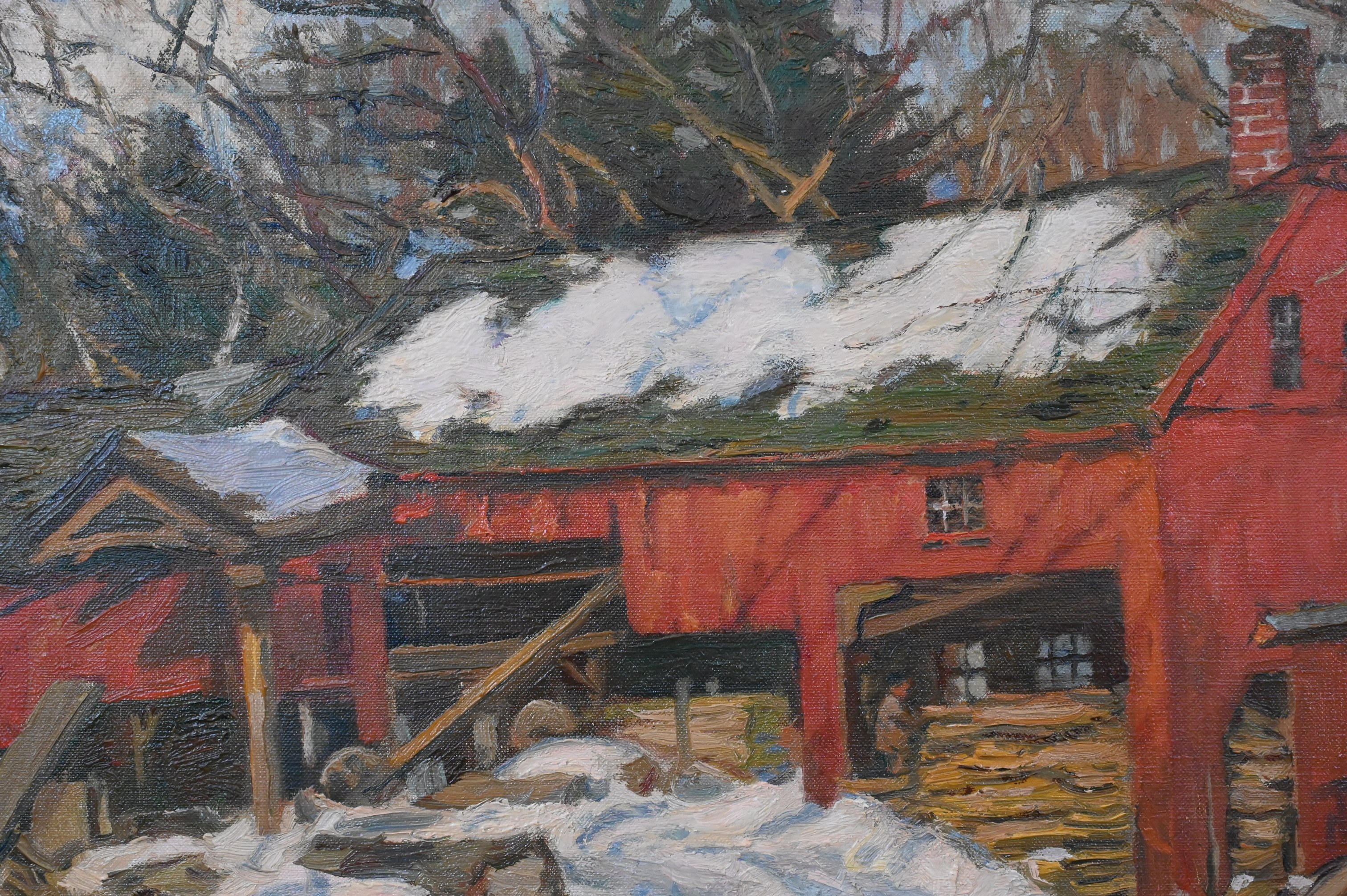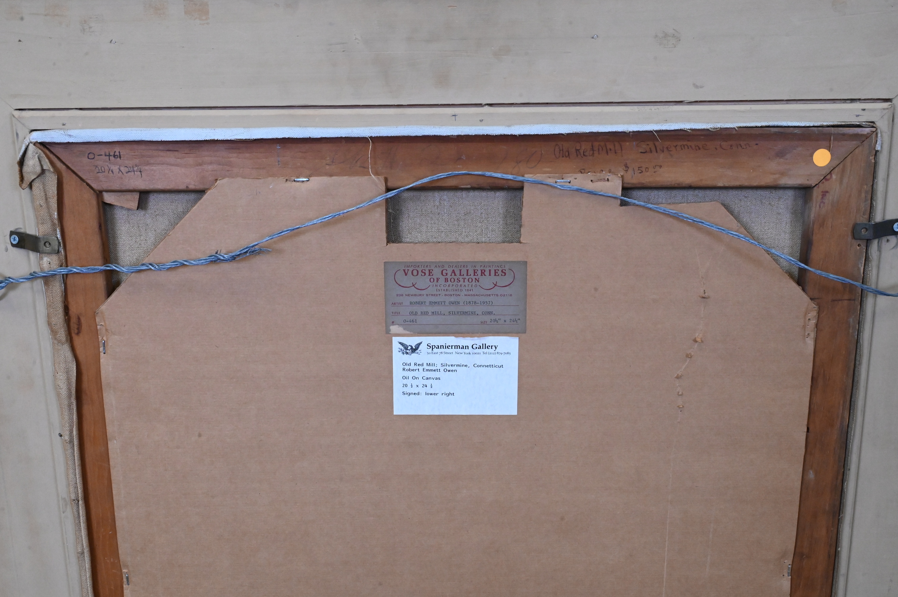 depicting the historic red mill at Silvermine, Connecticut, under a winter sky, the snow-covered foreground and bare trees rendered in Owen’s vigorous, impressionistic brushwork; the composition captures the rustic charm and distinctive light of New England that defined Owen’s celebrated landscapes
