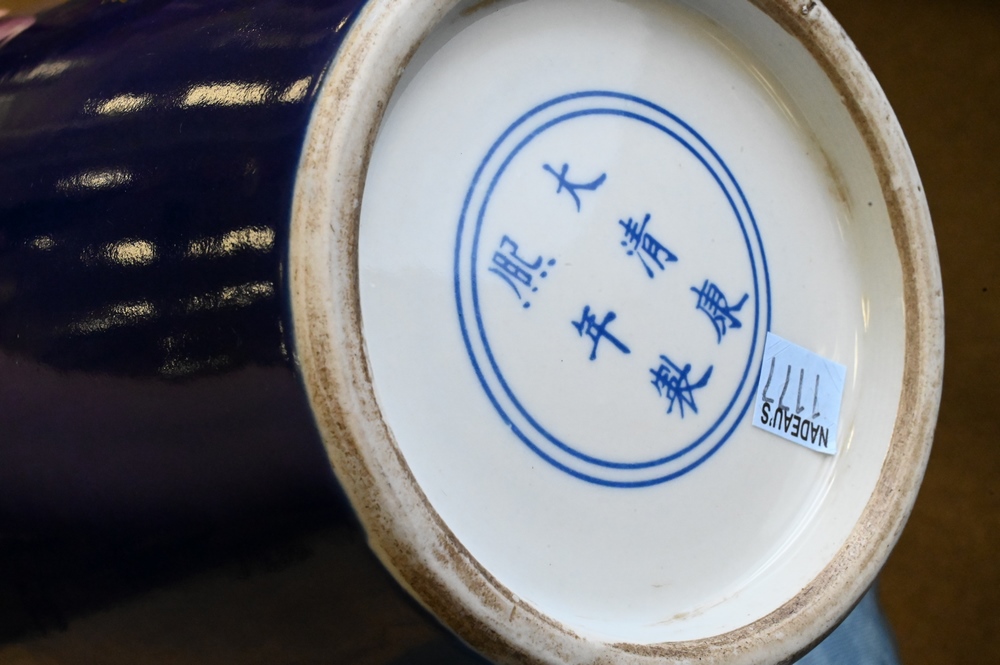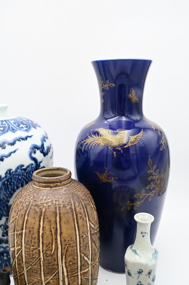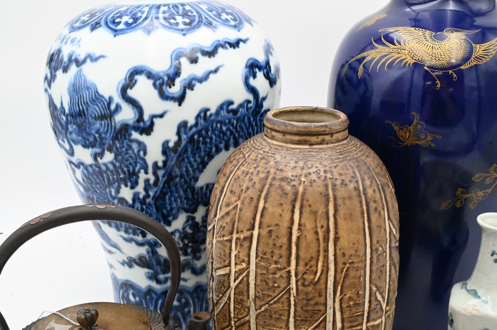 Lot 324: Seven Piece Group of Asian Items, to include a Chinese blue and white vase having dragons; a blue vase having gold painted flowers, height 18 inches; two blue and white Asian pieces; Imari dish; iron pot; along with a faux bamboo ceramic vase.