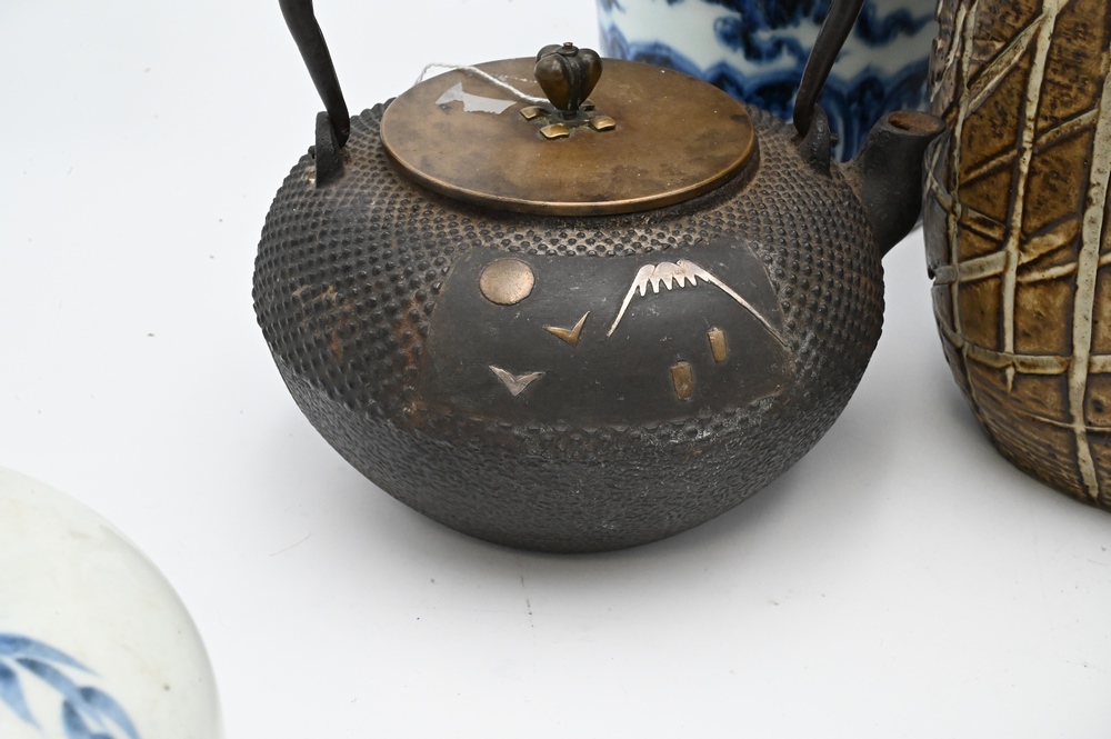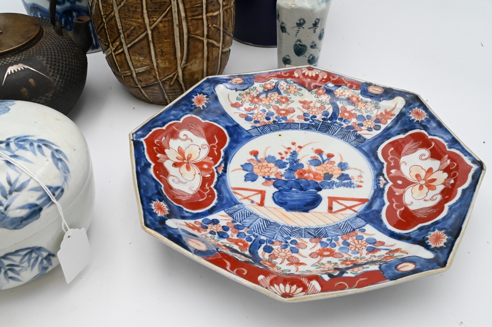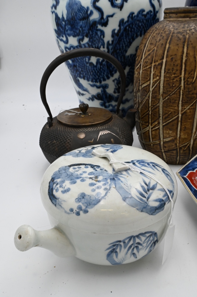 Seven Piece Group of Asian Items, to include a Chinese blue and white vase having dragons; a blue vase having gold painted flowers, height 18 inches; two blue and white Asian pieces; Imari dish; iron pot; along with a faux bamboo ceramic vase.