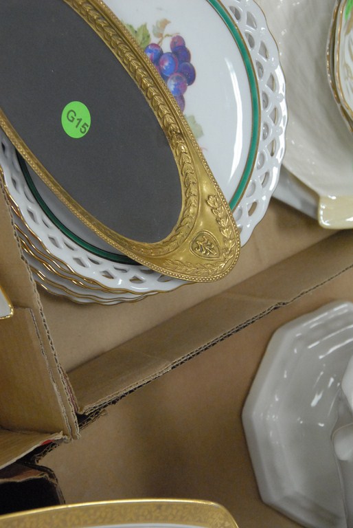Lot 324: Six box lots of china and porcelain two Bavarian rectangular platters, soup tureen, Irish Belleek shell plate, and misc.