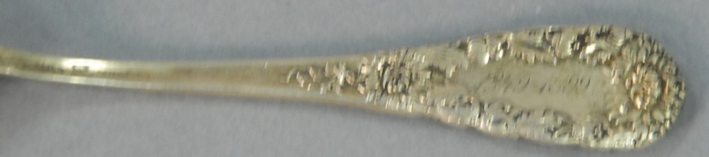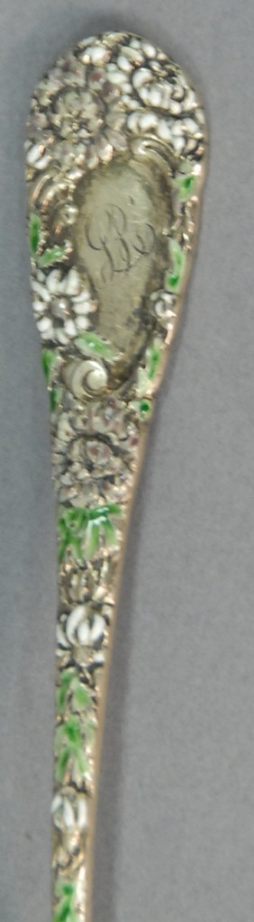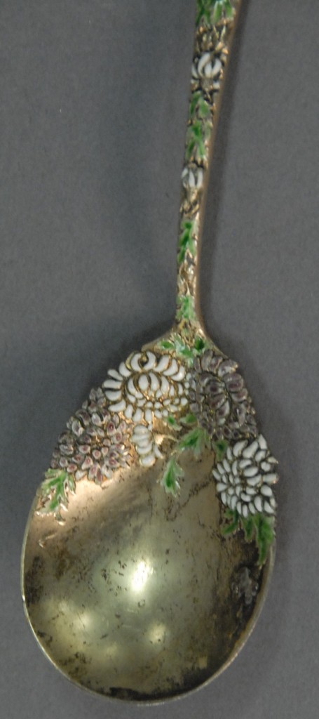 Sterling silver serving spoon with enameled chrysanthemums. 2.3 troy oz.
