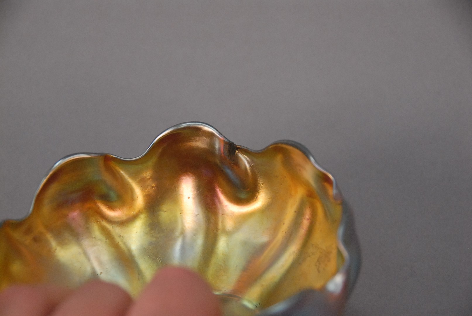 Lot 324: Three piece lot Steuben Aurene gold iridescent tree trunk small art glass bud vase and small Tiffany bowl all as is.