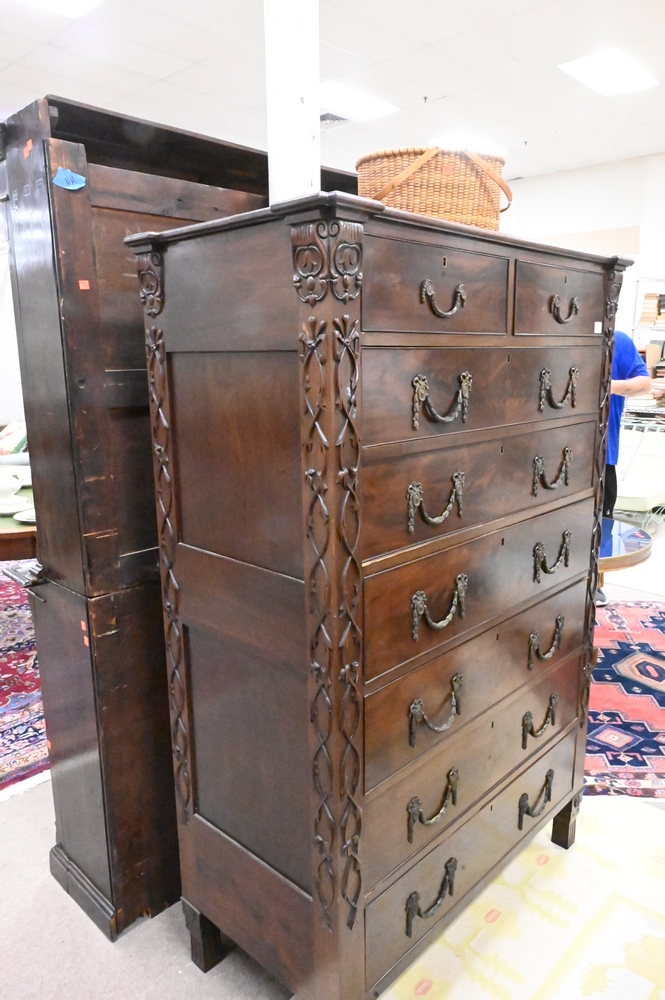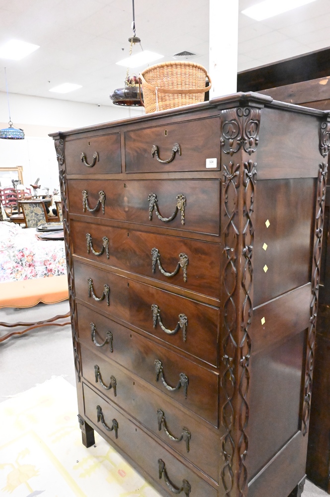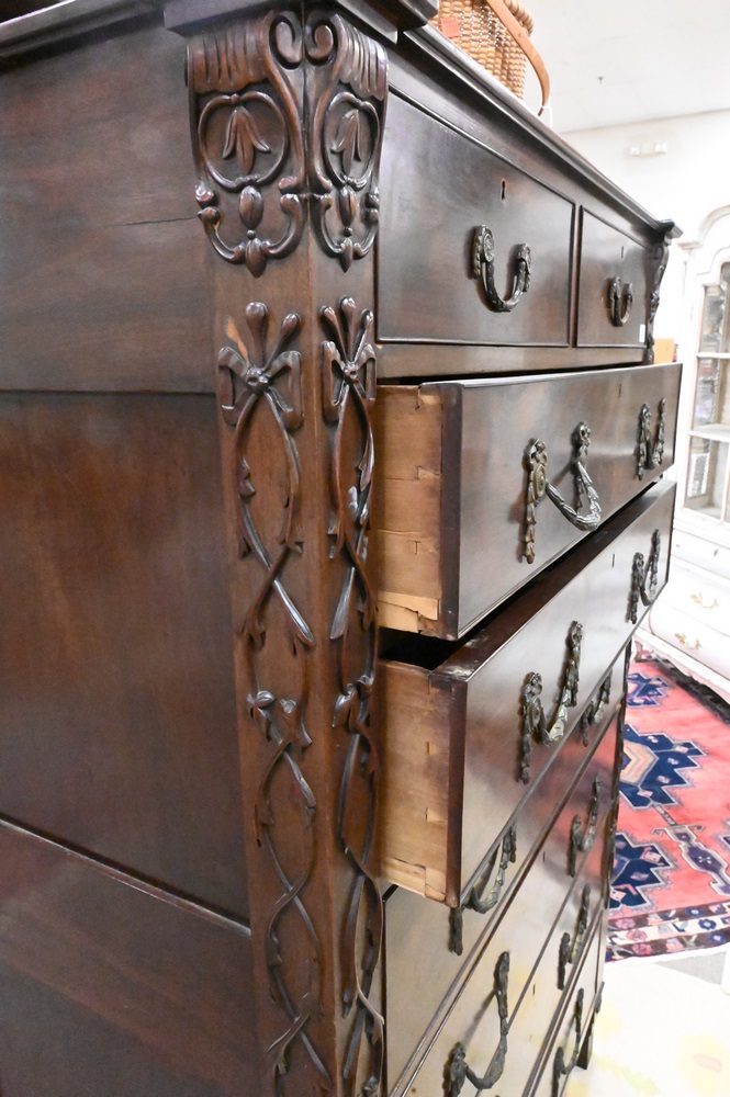 Two Over Six Drawer Mahogany Tall Chest, having carved supports along with large brass handles, height 66 inches, top 21 1/2″ x 44 1/2″.