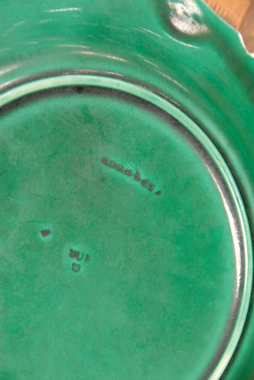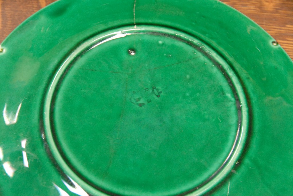 Eleven Majolica green plates, five marked Wedgwood one as is.