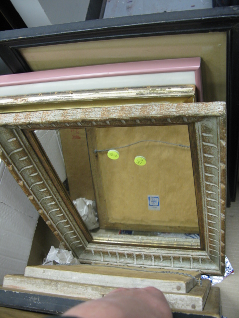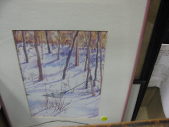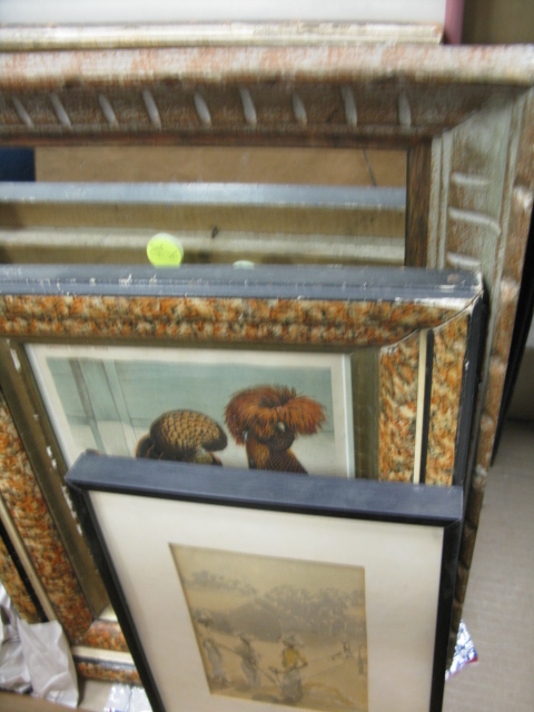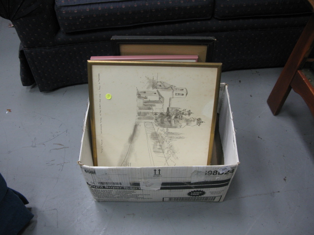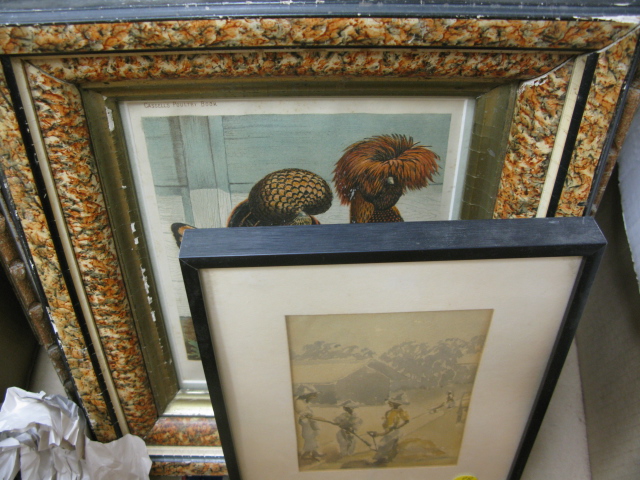 Group lot to include a pen and watercolor sketch signed Audrey Hursey, a watercolor of plantation workers, two rectangular mirrors and prints of chickens, and a Morgan Dennis etching.