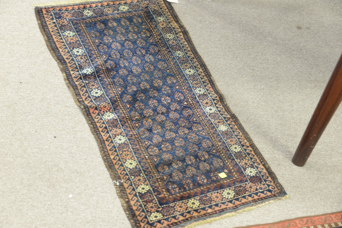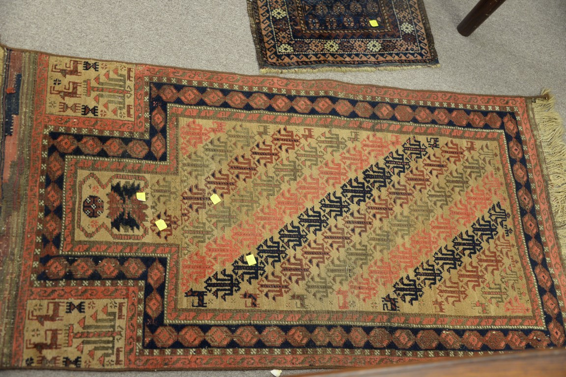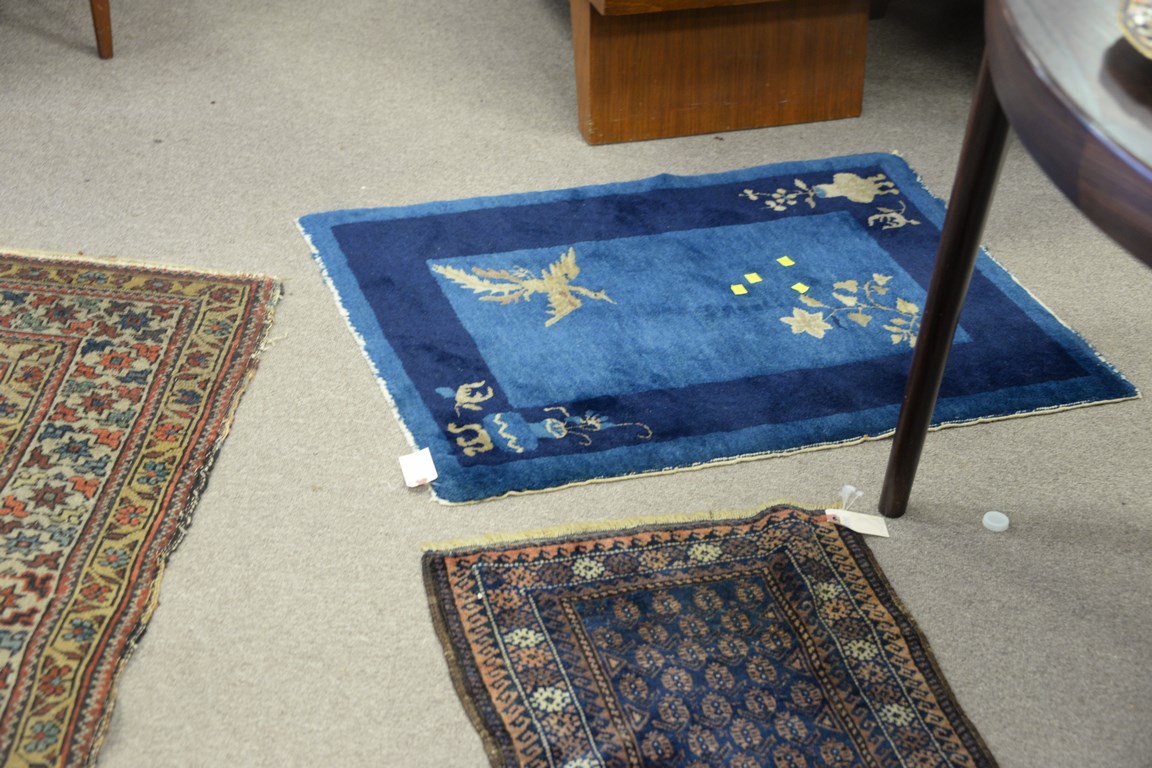 Lot 325: Group of four Oriental throw rugs including Chinese 2’2 x 3, Belouch 1’7 x 3’2, prayer rug 2’2 x 4′, and Hamadan worn …