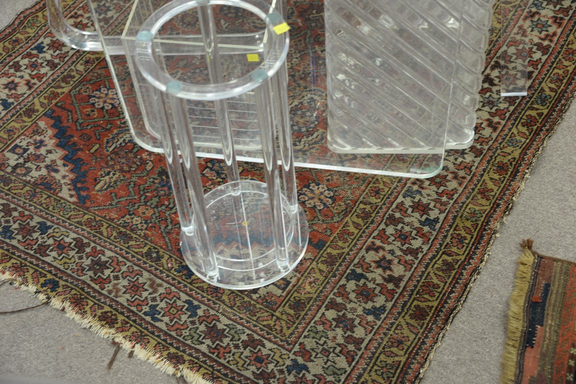 Group of four Oriental throw rugs including Chinese 2’2 x 3, Belouch 1’7 x 3’2, prayer rug 2’2 x 4′, and Hamadan worn 6’8 x 4′.