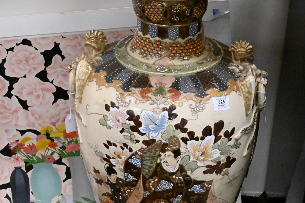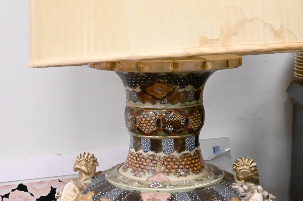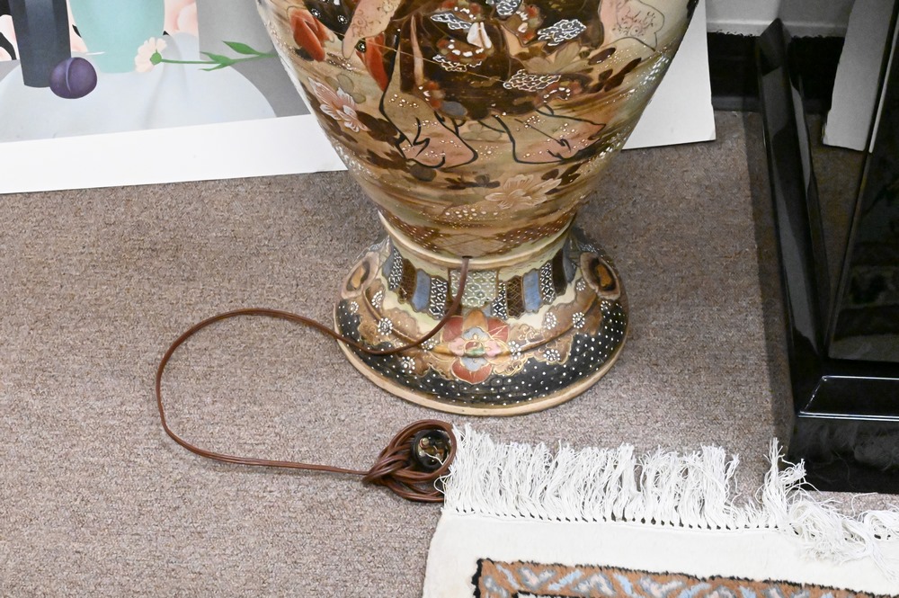 Large Satsuma Palace Vase, mounted into table lamp, late 19th/early 20th century, vase height 37 inches.